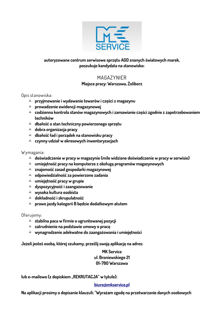 autoryzowane centrum serwisowe sprzętu AGD znanych światowych marek, poszukuje kandydata na stanowisko: MAGAZYNIER Miejsce pracy: Warszawa, Żoliborz Opis stanowiska: przyjmowanie i wydawanie towarów i części z magazynu prowadzenie ewidencji magazynowej codzienna kontrola stanów magazynowych i zamawianie części zgodnie z zapotrzebowaniem techników dbałość o stan techniczny powierzonego sprzętu dobra organizacja pracy dbałość ład i porządek na stanowisku pracy czynny udział w okresowych inwentaryzacjach W ymagania: doświadczenie w pracy w magazynie (mile widziane doświadczenie w pracy w serwisie) umiejętność pracy na komputerze z obsługą programów magazynowych znajomość zasad gospodarki magazynowej odpowiedzialność za powierzone zadania umiejętność pracy w grupie dyspozycyjność i zaangażowanie wysoka kultura osobista dokładność i skrupulatność prawo jazdy kategorii B będzie dodatkowym atutem Oferujemy: stabilna paca w firmie o ugruntowanej pozycji zatrudnienie na podstawie umowy o pracę wynagrodzenie adekwatne do zaangażowania i umiejętności Jeżeli jesteś osobą, której szukamy, prześlij swoją aplikację na adres: MK Service ul. Broniewskiego 21 01-780 Warszawa lub e-mailowo (z dopiskiem „REKRUTACJA” w tytule): [email protected] Na aplikacji prosimy o dopisanie klauzuli: "Wyrażam zgodę na przetwarzanie danych osobowych zawartych w mojej ofercie pracy przez firmę MK Service w celach rekrutacyjnych, zgodnie z ustawą z dn. 29.08.1997 r. "O ochronie danych osobowych", Dz.U. nr 133, poz. 833".