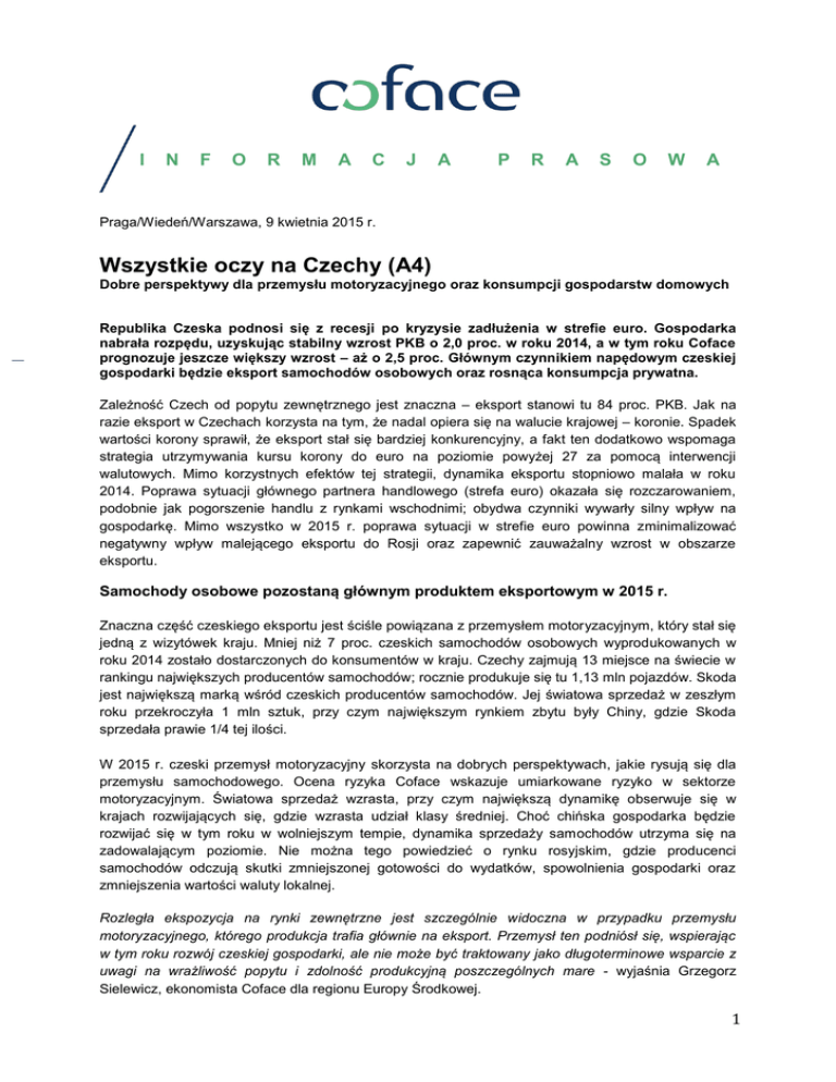 I N F O R M A C J A P R A S O W A Praga/Wiedeń/Warszawa, 9 kwietnia 2015 r. Wszystkie oczy na Czechy (A4) Dobre perspektywy dla przemysłu motoryzacyjnego oraz konsumpcji gospodarstw domowych Republika Czeska podnosi się z recesji po kryzysie zadłużenia w strefie euro. Gospodarka nabrała rozpędu, uzyskując stabilny wzrost PKB o 2,0 proc. w roku 2014, a w tym roku Coface prognozuje jeszcze większy wzrost – aż o 2,5 proc. Głównym czynnikiem napędowym czeskiej gospodarki będzie eksport samochodów osobowych oraz rosnąca konsumpcja prywatna. Zależność Czech od popytu zewnętrznego jest znaczna – eksport stanowi tu 84 proc. PKB. Jak na razie eksport w Czechach korzysta na tym, że nadal opiera się na walucie krajowej – koronie. Spadek wartości korony sprawił, że eksport stał się bardziej konkurencyjny, a fakt ten dodatkowo wspomaga strategia utrzymywania kursu korony do euro na poziomie powyżej 27 za pomocą interwencji walutowych. Mimo korzystnych efektów tej strategii, dynamika eksportu stopniowo malała w roku 2014. Poprawa sytuacji głównego partnera handlowego (strefa euro) okazała się rozczarowaniem, podobnie jak pogorszenie handlu z rynkami wschodnimi; obydwa czynniki wywarły silny wpływ na gospodarkę. Mimo wszystko w 2015 r. poprawa sytuacji w strefie euro powinna zminimalizować negatywny wpływ malejącego eksportu do Rosji oraz zapewnić zauważalny wzrost w obszarze eksportu. Samochody osobowe pozostaną głównym produktem eksportowym w 2015 r. Znaczna część czeskiego eksportu jest ściśle powiązana z przemysłem motoryzacyjnym, który stał się jedną z wizytówek kraju. Mniej niż 7 proc. czeskich samochodów osobowych wyprodukowanych w roku 2014 zostało dostarczonych do konsumentów w kraju. Czechy zajmują 13 miejsce na świecie w rankingu największych producentów samochodów; rocznie produkuje się tu 1,13 mln pojazdów. Skoda jest największą marką wśród czeskich producentów samochodów. Jej światowa sprzedaż w zeszłym roku przekroczyła 1 mln sztuk, przy czym największym rynkiem zbytu były Chiny, gdzie Skoda sprzedała prawie 1/4 tej ilości. W 2015 r. czeski przemysł motoryzacyjny skorzysta na dobrych perspektywach, jakie rysują się dla przemysłu samochodowego. Ocena ryzyka Coface wskazuje umiarkowane ryzyko w sektorze motoryzacyjnym. Światowa sprzedaż wzrasta, przy czym największą dynamikę obserwuje się w krajach rozwijających się, gdzie wzrasta udział klasy średniej. Choć chińska gospodarka będzie rozwijać się w tym roku w wolniejszym tempie, dynamika sprzedaży samochodów utrzyma się na zadowalającym poziomie. Nie można tego powiedzieć o rynku rosyjskim, gdzie producenci samochodów odczują skutki zmniejszonej gotowości do wydatków, spowolnienia gospodarki oraz zmniejszenia wartości waluty lokalnej. Rozległa ekspozycja na rynki zewnętrzne jest szczególnie widoczna w przypadku przemysłu motoryzacyjnego, którego produkcja trafia głównie na eksport. Przemysł ten podniósł się, wspierając w tym roku rozwój czeskiej gospodarki, ale nie może być traktowany jako długoterminowe wsparcie z uwagi na wrażliwość popytu i zdolność produkcyjną poszczególnych mare - wyjaśnia Grzegorz Sielewicz, ekonomista Coface dla regionu Europy Środkowej. 1 Poprawa sytuacji na rynku pracy napędza konsumpcję prywatną Krajowy popyt odgrywa istotną rolę we wzrośnie gospodarczym Czech, szczególnie teraz, gdy poprawiła się sytuacja na rynku pracy, co z kolei poskutkowało wzrostem konsumpcji prywatnej. Stopa bezrobocia w grudniu 2014 r. wyniosła 5,8 proc., co stanowi najniższą wartość od roku 2009 oraz jeden z najniższych wyników w UE, obok Niemiec i Austrii. Wydatki na konsumpcję w gospodarstwach domowych wzrosły o 2,1 proc. w ciągu pierwszych trzech kwartałów roku 2014, w porównaniu z rokiem 2013. Bardzo niska stopa inflacji wzmocniła siłę nabywczą konsumentów. Na przestrzeni ostatnich lat sektor handlu detalicznego w Czechach stał się bardziej dojrzały i nasycony. Napływ zagranicznych inwestorów, chcących wykorzystać rosnący udział klasy średniej, potwierdza ogromny potencjał, jaki stał się celem działań globalnych sieci. Konkurencja jest ostra, co przyczyniło się do zmniejszenia marży, a w przypadku niektórych spółek skutkowało wręcz wypadnięciem z rynku. Wcześniejsze trudne warunki gospodarcze nadal wywierają niekorzystny wpływ na wyniki finansowe spółek, zaś określony poziom stałych inwestycji jest konieczny, by utrzymać udział w rynku na opłacalnym poziomie. Choć konsumenci chętniej niż kiedyś wydają pieniądze, wciąż wydają wybiórczo i są raczej wyczuleni na ceny, co nie zostawia wiele przestrzeni dla spółek chcących zwiększać marże. W roku 2015 stabilny poziom wydatków gospodarstw domowych oraz apetyt na inwestycje będą stanowić wsparcie sektora detalicznego. Dobre perspektywy wynikają też ze wskaźników zaufania konsumenckiego. Uległy one poprawie, osiągając wynik, który po raz ostatni odnotowano w roku 2006, będący zarazem najwyższym wynikiem w rejonie Europy Środkowo-Wschodniej. Mimo wszystko w sektorze widać działania w kierunku dalszej konsolidacji. Podczas gdy zagraniczne przedsiębiorstwa detaliczne walczą o marże, próbując jednocześnie optymalizować koszty w ujęciu globalnym, niektóre sieci mogą wyjść z rynków takich jak Czechy czy inne państwa Europy ŚrodkowoWschodniej. Tak zmienione strategie światowych graczy rynkowych mogą stworzyć szanse dla innych przedsiębiorstw, które chcą zwiększyć własny udział w rynku. KONTAKT DLA MEDIÓW: Anna A. GUZIK – T. +48 22 465 02 22, M. +48 509 467 531 – E. [email protected] Informacje o Coface Grupa Coface, światowy lider w obszarze ubezpieczeń należności, oferuje firmom na całym świecie rozwiązania w zakresie ochrony przed ryzykiem niewypłacalności ich klientów, zarówno w transakcjach krajowych jak i eksportow