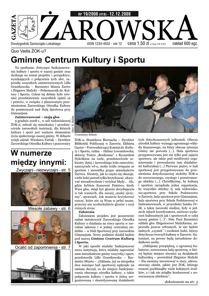 nr 19/2008 (418) - 12.12.2008 Dwutygodnik Samorządu Lokalnego ISSN 1234-4552 - rok 12 cena 1,50 zł w tym 7% VAT nakład 600 egz. Quo Vadis ŻOK-u? Na spotkanie, dotyczące funkcjonowania kultury i sportu w naszej gminie oraz dyskusję na temat projektu i perspektyw, wynikających z połączenia tych sfer, zaprosiła wszystkich zainteresowanych Lilla Gruntkowska – Burmistrz Miasta Żarów i Zbigniew Malicki – Pełnomocnik ds. Kultury i Sportu. Celem tej debaty było również przedstawienie wszystkich opinii za i przeciw, w związku z planowanym przeniesieniem Żarowskiego Ośrodka Kultury do pomieszczeń nad Halą Sportową przy Gimnazjum. Zainteresowani – mają głos 9 grudnia 2008 r., w sali widowiskowej ŻOK-u, zebrali się mieszkańcy i przedstawiciele żarowskich instytucji, dla których kultura i sport jest ważnym elementem życia społecznego naszej gminy. W debacie wzięli udział: Wiesława Furtak – Dyrektor Żarowskiego Ośrodka Kultury i pracownicy W numerze między innymi: Zwyczajni - niezwyczajni - str. 5 Wesołe zabawy - str. 6 Ocalić od zapomnienia - str. 7 foto: E. Kulas Gminne Centrum Kultury i Sportu Uczestnicy debaty ŻOK-u, Stanisława Biernacka – Dyrektor Biblioteki Publicznej w Żarowie, Elżbieta Gąsior – Przewodnicząca Komisji ds. Kultury i Sportu, radna – Halina Lewandowska, aktorzy Teatru „Bezdomny” z Ryszardem Dykcikiem na czele, przedstawiciele orkiestry dętej i żarowskiego koła emerytów, nauczyciele wf-u, osoby ściśle związane ze sportem i niewielka grupa mieszkańców Żarowa. Niestety, jak to często się okazuje, wielu ludzi potrafi tylko krytykować, okazywać niezadowolenie i wytykać błędy... Ale, gdzie byliście Szanowni Państwo, kiedy Wasz głos, mógł być głosem decydującym w tak ważnych, dla naszej „małej ojczyzny”, sprawach. Jak możecie krytykować rzeczy, które nie są Wam w pełni znane, przecież nie wysłuchaliście głosów i racji różnych stron. Założenia Założeniem projektu jest poszerzenie zadań statutowych Żarowskiego Ośrodka Kultury o działania na rzecz sportu w szerokim zakresie i w jednej centralnej siedzibie – w Hali Sportowej przy żarowskim Gimnazjum. Nowy podmiot działał będzie pod nazwą Gminne Centrum Kultury i Sportu. W jaki sposób miałaby funkcjonować nowa instytucja, która miałaby zapewniać nam mieszkańcom gminy rozrywkę i sport, przedstawiła Lilla Gruntkowska – Burmistrz Miasta – „Oddanie, już za niespełna dwa miesiące hali sportowej wpłynęło na zmianę decyzji, co do miejsca funkcjonowania obecnego ośrodka kultury, a także połączenia kultury i sportu w jedną zorganizowaną i skoordynowaną działalność tych dotychczasowych jednostek. Obecny ośrodek kultury wymaga ogromnego wkładu finansowego, na który obecna sytuacja Gminy nie pozwala (…). Hala sportowa przygotowywana jest nie tylko pod zajęcia sportowe, ale także pod możliwości organizowania i prowadzenia tam działalności kulturalnej (…) Pierwsze piętro, w hali sportowej jest przygotowywane do przeniesienia dotychczasowej siedziby ŻOK-u do nowoczesnego, czystego i przestronnego obiektu (…). Chcielibyśmy, by kulturą i sportem zarządzała jedna organizacja, by wszystkie obiekty, tj. sala widowiskowo-sportowa przy Szkole Podstawowe w Żarowie, hala sportowa przy Gimnazjum, hala sportowa przy Szkole Podstawowej w Imbramowicach, w przyszłości boiska Orlik, a także żarowski stadion, były w jednych rękach koordynatora, zarówno wydarzeń kulturalnych jak i sportowych w całej naszej gminie (…)”. Nim Pani Burmistrz oddała głos Zbigniewowi Malickiemu, zapewniła jeszcze zebranych, że nie będzie żadnych „czystek” i zwolnień ludzi, którzy dotychczas tworzyli kulturę w Żarowie. Natomiast, na pewno będą zatrudnione dodatkowe osoby. „Oddajemy przepiękną, o ogromnej kubaturze, nowoczesna halę sportową, w której będzie miejsce również na działalność kulturalną – powiedział Zbigniew Malicki – Nie możemy inwestować w stary, zdewastowany obiekt, jakim jest ŻOK, którego remont pochłonąłby wiele kolejnych środków, a i tak nie mógłby konkurować z nowoczesnym obiektem”. dokończenie na str. 5 2 Gazeta Żarowska Wieści z Ratusza W kilku słowach Sesja Rady Miejskiej Wielka Hala Sportowa dla... kultury i sportu 11 grudnia, odbyła się kolejna sesja, na której oprócz odrzucenia po raz kolejny raz uchwały dotyczącej powołania Sylwii Pawlik na stanowisko Sekretarza Gminy, doczekaliśmy się wreszcie porozumienia i konstruktywnych działań radnych, na polu kultury i sportu. W ostatnim czasie popularnym tematem wśród miłośników kultury i sportu ( i pewnie nie tylko), jest nowa Hala Sportowa, która już za niespełna dwa miesiące zostanie oddana do użytku. Władze miasta planują połączyć działania kulturalne i sportowe, tak ważne dla naszej społeczności, w rękach jednego zarządcy – koordynatora, z siedzibą w nowo wybudowanej Hali Sportowej, w Gminnym Centrum Kultury i Sportu. Warto tu wspomnieć, że wiele gmin już w ten sposób funkcjonuje, z całkiem dobrym skutkiem. W związku z powyższym 08 listopada br. w Żarowskim Ośrodku Kultury, odbyło się spotkanie naszych władz z mieszkańcami Żarowa, pracownikami instytucji kulturalno - oświatowych, przedstawicielami stowarzyszeń, kół i miłośników kultury i sportu. W czasie debaty, każdy mógł zabrać głos w tej sprawie. Było też wiele pytań – i trudno się dziwić, ponieważ każda, nawet najmniejsza zmiana w naszych zwyczajach i przyzwyczajeniach, budzi wiele pytań – i bardzo dobrze, że tak jest. Zwyczajni – Niezwyczajni … są wśród nas! W tym numerze gazety, przedstawiamy Państwu kolejną, niezwykle ciekawą osobę – Danutę Michalską. Rubryka ta, poświęcona jest osobom, które w swojej skromności, często bagatelizują zasługi dla innych. „Po cichutku” niosą innym pomoc, wytchnienie, dobre słowo, promienny uśmiech… 