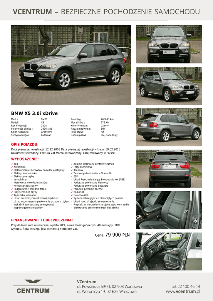 BMW X5 3.0i xDrive Marka: Model: Rok Produkcji: Pojemność silnika : Kolor Nadwozia: Skrzynia biegów: BMW X5 2008 2996 cm3 Grafitowy Automat Przebieg : Moc silnika : Kolor Wnętrza: Rodzaj nadwozia: Ilość drzwi: Rodzaj paliwa: 205693 km 272 KM Czarny SUV 4/5 Olej napędowy OPIS POJAZDU: Data pierwszej rejestracji: 12.12.2008 Data pierwszej rejestracji w kraju: 09.02.2015 Dokument sprzedaży: Faktura Vat Marża sprowadzony, zarejestrowany w Polsce WYPOSAŻENIE: ✓ 4x4 ✓ Autoalarm ✓ Elektronicznie sterowany hamulec postojowy ✓ Elektryczne lusterka ✓ Elektryczne szyby ✓ Immobiliser ✓ Kierownica wykończona skórą ✓ Komputer pokładowy ✓ Podgrzewane przednie fotele ✓ Przyciemniane szyby ✓ Tapicerka skórzana ✓ Układ automatycznej kontroli prędkości ✓ Układ wspomagania parkowania przodem i tyłem ✓ Wskaźnik temperatury zewnętrznej ✓ Wspomaganie kierownicy ✓ Zdalnie sterowany centralny zamek ✓ Felgi aluminiowe ✓ Ksenony ✓ Zestaw głośnomówiący Bluetooth ✓ ESP ✓ Układ Przeciwdziałający Blokowaniu Kół (ABS) ✓ Poduszka powietrzna kierowcy ✓ Poduszka powietrzna pasażera ✓ Poduszki przednie boczne ✓ Radio/CD ✓ Gniazdo AUX ✓ System ostrzegający o niezapiętych pasach ✓ Układ kontroli zjazdu ze wzniesienia ✓ Przyciski w kierownicy sterujące zestawem audio ✓ Elektrycznie sterowane drzwi bagażnika FINANSOWANIE I UBEZPIECZENIA: Przykładowa rata miesięczna, wpłata 20%, okres leasingu/kredytu 48 miesięcy, 10% wykupu. Rata leasingu jest wartością netto bez vat. Cena: 79 Powered by TCPDF (www.tcpdf.org) 900 PLN