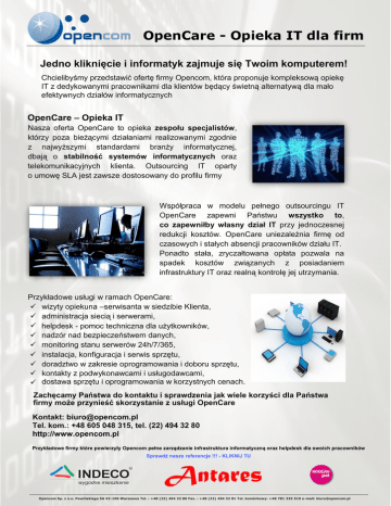 OpenCare - Opieka IT dla firm Jedno kliknięcie i informatyk zajmuje się Twoim komputerem! Chcielibyśmy przedstawić ofertę firmy Opencom, która proponuje kompleksową opiekę IT z dedykowanymi pracownikami dla klientów będący świetną alternatywą dla mało efektywnych działów informatycznych OpenCare – Opieka IT Nasza oferta OpenCare to opieka zespołu specjalistów, którzy poza bieżącymi działaniami realizowanymi zgodnie z najwyższymi standardami branży informatycznej, dbają o stabilność systemów informatycznych oraz telekomunikacyjnych klienta. Outsourcing IT oparty o umowę SLA jest zawsze dostosowany do profilu firmy Współpraca w modelu pełnego outsourcingu IT OpenCare zapewni Państwu wszystko to, co zapewniłby własny dział IT przy jednoczesnej redukcji kosztów. OpenCare uniezależnia firmę od czasowych i stałych absencji pracowników działu IT. Ponadto stała, zryczałtowana opłata pozwala na spadek kosztów związanych z posiadaniem infrastruktury IT oraz realną kontrolę jej utrzymania. Przykładowe usługi w ramach OpenCare: wizyty opiekuna –serwisanta w siedzibie Klienta, administracja siecią i serwerami, helpdesk - pomoc techniczna dla użytkowników, nadzór nad bezpieczeństwem danych, monitoring stanu serwerów 24h/7/365, instalacja, konfiguracja i serwis sprzętu, doradztwo w zakresie oprogramowania i doboru sprzętu, kontakty z podwykonawcami i usługodawcami, dostawa sprzętu i oprogramowania w korzystnych cenach. Zachęcamy Państwa do kontaktu i sprawdzenia jak wiele korzyści dla Państwa firmy może przynieść skorzystanie z usługi OpenCare Kontakt: [email protected] Tel. kom.: +48 605 048 315, tel. (22) 494 32 80 http://www.opencom.pl Przykładowe firmy które powierzyły Opencom pełne zarządzanie infrastruktura informatyczną oraz helpdesk dla swoich pracowników Sprawdź nasze referencje !!! - KLIKNIJ TU Opencom Sp. z o.o. Pawińskiego 5A 02-106 Warszawa Tel. : +48 (22) 494 32 80 Fax. : +48 (22) 494 32 81 Tel. komórkowy: +48 781 335 519 e-mail: [email protected]