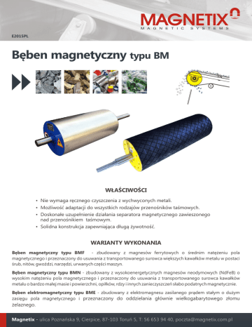 M A G N E T I C S Y S T E M S E2015PL Bęben magnetyczny typu BM WŁAŚCIWOŚCI • Nie wymaga ręcznego czyszczenia z wychwyconych metali. • Możliwość adaptacji do wszystkich rodzajów przenośników taśmowych. • Doskonałe uzupełnienie działania separatora magnetycznego zawieszonego nad przenośnikiem taśmowym. • Solidna konstrukcja zapewniająca długą żywotność. WARIANTY WYKONANIA Bęben magnetyczny typu BMF - zbudowany z magnesów ferrytowych o średnim natężeniu pola magnetycznego i przeznaczony do usuwania z transportowanego surowca większych kawałków metalu w postaci śrub, nitów, gwoździ, narzędzi, urwanych części maszyn. Bęben magnetyczny typu BMN - zbudowany z wysokoenergetycznych magnesów neodymowych (NdFeB) o wysokim natężeniu pola magnetycznego i przeznaczony do usuwania z transportowanego surowca kawałków metalu o bardzo małej masie i powierzchni, opiłków, rdzy i innych zanieczyszczeń słabo podatnych magnetycznie. Bęben elektromagnetyczny typu BME - zbudowany z elektromagnesu zasilanego prądem stałym o dużym zasięgu pola magnetycznego i przeznaczony do oddzielania głównie wielkogabarytowego złomu żelaznego. Magnetix - ulica Poznańska 9, Cierpice, 87-103 Toruń 5, T: 56 653 94 40, [email protected] PRZYKŁADOWE REALIZACJE Odzysk złomu żelaznego z odpadów komunalnych. Odzysk złomu żelaznego z żużli pohutniczych. Usuwanie zanieczyszczeń żelaznych ze zrębków. Usuwanie zanieczyszczeń żelaznych z ziarna. KONSTRUKCJA • Bęben magnetyczny: pakiety magnesów trwałych zamocowane pod płaszczem na stalowej konstrukcji i zabezpieczone przed przesuwaniem się za pomocą żywicy epoksydowej. • Bęben elektromagnetyczny: uzwojenie elektromagnesu nawinięte izolowanym drutem aluminiowym i zasilane prądem stałym. • Płaszcz bębna wykonany ze stali niemagnetycznej. • Wymienny wał wykonany ze stali jakościowej o zwiększonej wytrzymałości i zamocowany w przeponach za pomocą pierścieni rozprężnych. WYPOSAŻENIE DODATKOWE • Powierzchnia bębna przygotowana w formie baryłkowej w celu dokładniejszego centrowania ruchu taśmy • • • • • przenośnika. Gumowanie powierzchni bębna okładziną gumową o profilu KARO i grubości 6 ÷ 8 mm przyklejaną do bębna specjalistycznymi klejami na zimno. Łożyska dwurzędowe baryłkowe w oprawach dzielonych pyłoszczelnych. Smarownice automatyczne. Motoreduktor firmy Nord lub na życzenie innego producenta. Rozdzielacz rolkowy z napędem. Magnetix - ulica Poznańska 9, Cierpice, 87-103 Toruń 5, T: 56 653 94 40, [email protected] X DANE TECHNICZNE Bt 400 500 630 800 30 ÷ 50 40 ÷ 60 50 ÷ 90 320 60 ÷ 110 250 Szerokość Wysokość Prędkość robocza warstwy taśmy Bt (mm) X (mm) (m/s) 500 600 650 800 0,7 1000 1200 1400 500 600 650 800 0,8 1000 1200 1400 600 650 800 1000 1,0 1200 1400 1600 600 650 800 1000 1,3 1200 1400 1600 650 800 1000 1200 1,7 1400 1600 1800 800 1000 1200 1400 2,2 1600 1800 2000 80 ÷ 140 BM 25-50 BM 25-60 BM 25-65 BM 25-80 BM 25-100 BM 25-120 BM 25-140 BM 32-50 BM 32-60 BM 32-65 BM 32-80 BM 32-100 BM 32-120 BM 32-140 BM 40-60 BM 40-65 BM 40-80 BM 40-100 BM 40-120 BM 40-140 BM 40-160 BM 50-60 BM 50-65 BM 50-80 BM 50-100 BM 50-120 BM 50-140 BM 50-160 BM 63-65 BM 63-80 BM 63-100 BM 63-120 BM 63-140 BM 63-160 BM 63-180 BM 80-80 BM 80-100 BM 80-120 BM 80-140 BM 80-160 BM 80-180 BM 80-200 Średnica bębna Ø (mm) 100 ÷ 180 Typ Masa (kg) 105 130 135 160 190 220 250 160 190 210 250 300 350 400 310 330 400 480 560 640 720 470 500 600 720 850 1000 1150 700 800 1000 1200 1400 1600 1800 1100 1400 1700 2000 2300 2600 3000 Magnetix - ulica Poznańska 9, Cierpice, 87-103 Toruń 5, T: 56 653 94 40, [email protected]