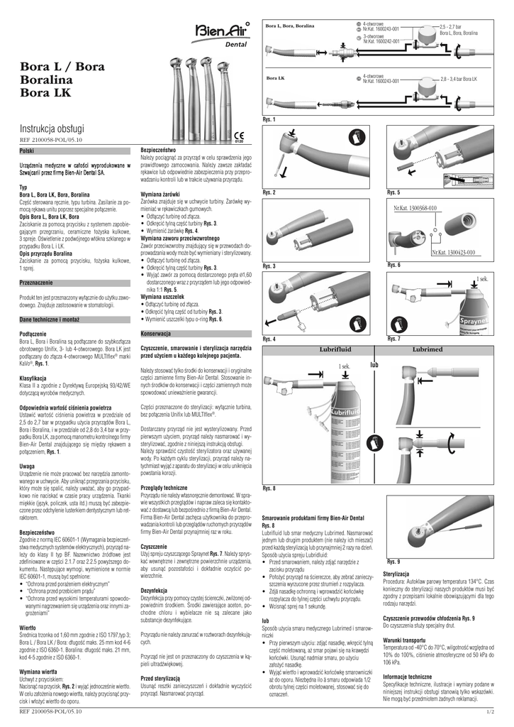 4-otworowe Nr.Kat. 1600243-001 3-otworowe Nr.Kat. 1600242-001 Bora L, Bora, Boralina Bora L / Bora Boralina Bora LK 2,5 - 2,7 bar Bora L, Bora, Boralina 4-otworowe Nr.Kat. 1600243-001 Bora LK 2,8 - 3,4 bar Bora LK Rys. 1 Instrukcja obs∏ugi 0120 REF 2100058-POL/05.10 Polski U r z à d z e n i a m e d y cz n e w ca ∏ o Ê ci w y p r o d u k o w a n e w Szw aj ca ri i pr ze z fi rm ´ Bie n-Ai r De nta l S A. Typ Bora L, Bora LK, Bora, Boralina Cz´Êç sterowana r´cznie, typu turbina. Zasilanie za pomocà r´kawa unitu poprzez specjalne po∏àczenie. Opis Bora L, Bora LK, Bora Zaciskanie za pomocà przycisku z systemem zapobiegajàcym przegrzaniu, ceramiczne ∏o˝yska kulkowe, 3 spreje. OÊwietlenie z podwójnego w∏ókna szklanego w przypadku Bora L i LK. Opis przyrzàdu Boralina Zaciskanie za pomocà przycisku, ∏o˝yska kulkowe, 1 sprej. Przeznaczenie Produkt ten jest przeznaczony wy∏àcznie do u˝ytku zawodowego. Znajduje zastosowanie w stomatologii. Dane techniczne i monta˝ Pod∏àczenie Bora L, Bora i Boralina sà pod∏àczane do szybkoz∏àcza obrotowego Unifix, 3- lub 4-otworowego. Bora LK jest pod∏àczany do z∏àcza 4-otworowego MULTIflex® marki KaVo®, Rys. 1. Klasyfikacja Klasa II a zgodnie z Dyrektywà Europejskà 93/42/WE dotyczàcà wyrobów medycznych. Odpowiednia wartoÊç ciÊnienia powietrza Ustawiç wartoÊç ciÊnienia powietrza w przedziale od 2,5 do 2,7 bar w przypadku u˝ycia przyrzàdów Bora L, Bora i Boralina, i w przedziale od 2,8 do 3,4 bar w przypadku Bora LK, za pomocà manometru kontrolnego firmy Bien-Air Dental znajdujàcego si´ mi´dzy r´kawem a po∏àczeniem, Rys. 1. Uwaga Urzàdzenie nie mo˝e pracowaç bez narz´dzia zamontowanego w uchwycie. Aby uniknàç przegrzania przycisku, który mo˝e si´ spaliç, nale˝y uwa˝aç, aby go przypadkowo nie naciskaç w czasie pracy urzàdzenia. Tkanki mi´kkie (j´zyk, policzek, usta itd.) muszà byç zabezpieczone przez odchylenie lusterkiem dentystycznym lub retraktorem. Bezpieczeƒstwo Zgodnie z normà IEC 60601-1 (Wymagania bezpieczeƒstwa medycznych systemów elektrycznych), przyrzàd nale˝y do klasy II typ BF. Nazewnictwo êród∏owe jest zdefiniowane w cz´Êci 2.1.7 oraz 2.2.5 powy˝szego dokumentu. Nast´pujàce wymogi, wymienione w normie IEC 60601-1, muszà byç spe∏nione: • “Ochrona przed pora˝eniem elektrycznym” • “Ochrona przed przebiciem pràdu” • “Ochrona przed wysokimi temperaturami spowodowanymi nagrzewaniem si´ urzàdzenia oraz innymi zagro˝eniami” Wiert∏o Ârednica trzonka od 1,60 mm zgodnie z ISO 1797,typ 3; Bora L / Bora LK / Bora: d∏ugoÊç maks. 25 mm kod 4-6 zgodnie z ISO 6360-1. Boralina: d∏ugoÊç maks. 21 mm, kod 4-5 zgodnie z ISO 6360-1. Wymiana wiert∏a Uchwyt z przyciskiem: Nacisnàç na przycisk, Rys. 2 i wyjàç jednoczeÊnie wiert∏o. W celu za∏o˝enia nowego wiert∏a, nale˝y przycisnàç przycisk i w∏o˝yç wiert∏o do oporu. REF 2100058-POL/05.10 Bezpieczeƒstwo Nale˝y pociàgnàç za przyrzàd w celu sprawdzenia jego prawid∏owego zamocowania. Nale˝y zawsze zak∏adaç r´kawice lub odpowiednie zabezpieczenia przy przeprowadzaniu kontroli lub w trakcie u˝ywania przyrzàdu. Wymiana ˝arówki ˚arówka znajduje si´ w uchwycie turbiny. ˚arówk´ wymieniaç w r´kawiczkach gumowych. • Od∏àczyç turbin´ od z∏àcza. • Odkr´ciç tylnà cz´Êç turbiny Rys. 3. • Wymieniç ˝arówk´ Rys. 4. Wymiana zaworu przeciwzwrotnego Zawór przeciwzwrotny znajdujàcy si´ w przewodach doprowadzania wody mo˝e byç wymieniany i sterylizowany. • Od∏àczyç turbin´ od z∏àcza. • Odkr´ciç tylnà cz´Êç turbiny Rys. 3. • Wyjàç zawór za pomocà dostarczonego pr´ta Ø1,60 dostarczonego wraz z przyrzàdem lub jego odpowiednika 1:1 Rys. 5. Wymiana uszczelek • Od∏àczyç turbin´ od z∏àcza. • Odkr´ciç tylnà cz´Êç od turbiny Rys. 3. • Wymieniç uszczelki typu o-ring Rys. 6. Konserwacja Rys. 2 Rys. 5 Nr.Kat. 1300368-010 Nr.Kat. 1300423-010 Rys. 6 Rys. 3 1 sek. Rys. 7 Rys. 4 Czyszczenie, smarowanie i sterylizacja narz´dzia przed u˝yciem u ka˝dego kolejnego pacjenta. Lubrifluid 1 sek. Nale˝y stosowaç tylko Êrodki do konserwacji i oryginalne cz´Êci zamienne firmy Bien-Air Dental. Stosowanie innych Êrodków do konserwacji i cz´Êci zamiennych mo˝e spowodowaç uniewa˝nienie gwarancji. Lubrimed lub Cz´Êci przeznaczone do sterylizacji: wy∏àcznie turbina, bez po∏àczenia Unifix lub MULTIflex®. Dostarczany przyrzàd nie jest wysterylizowany. Przed pierwszym u˝yciem, przyrzàd nale˝y nasmarowaç i wysterylizowaç, zgodnie z niniejszà instrukcjà obs∏ugi. Nale˝y sprawdziç czystoÊç sterylizatora oraz u˝ywanej wody. Po ka˝dym cyklu sterylizacji, przyrzàd nale˝y natychmiast wyjàç z aparatu do sterylizacji w celu unikni´cia powstania korozji. Przeglàdy techniczne Przyrzàdu nie nale˝y w∏asnor´cznie demontowaç. W sprawie wszystkich przeglàdów i napraw zaleca si´ kontaktowaç z dostawcà lub bezpoÊrednio z firmà Bien-Air Dental. Firma Bien-Air Dental zach´ca u˝ytkownika do przeprowadzania kontroli lub przeglàdów ruchomych przyrzàdów firmy Bien-Air Dental przynajmniej raz w roku. Czyszczenie U˝yj spreju czyszczàcego Spraynet Rys. 7. Nale˝y spryskaç wewn´trzne i zewn´trzne powierzchnie urzàdzenia, aby usunàç pozosta∏oÊci i dok∏adnie oczyÊciç powierzchnie. Dezynfekcja Dezynfekcja przy pomocy czystej Êciereczki, zwil˝onej odpowiednim Êrodkiem. Ârodki zawierajàce aceton, pochodne chloru i wybielacze nie sà zalecane jako substancje dezynfekujàce. Przyrzàdu nie nale˝y zanurzaç w roztworach dezynfekujàcych. Przyrzàd nie jest on przeznaczony do czyszczenia w kàpieli ultradêwi´kowej. Przed sterylizacjà Usunàç resztki zanieczyszczeƒ i dok∏adnie wyczyÊciç przyrzàd. Nasmarowaç przyrzàd. Rys. 8 Smarowanie produktami firmy Bien-Air Dental Rys. 8 Lubrifluid lub smar medyczny Lubrimed. Nasmarowaç jednym lub drugim produktem (nie nale