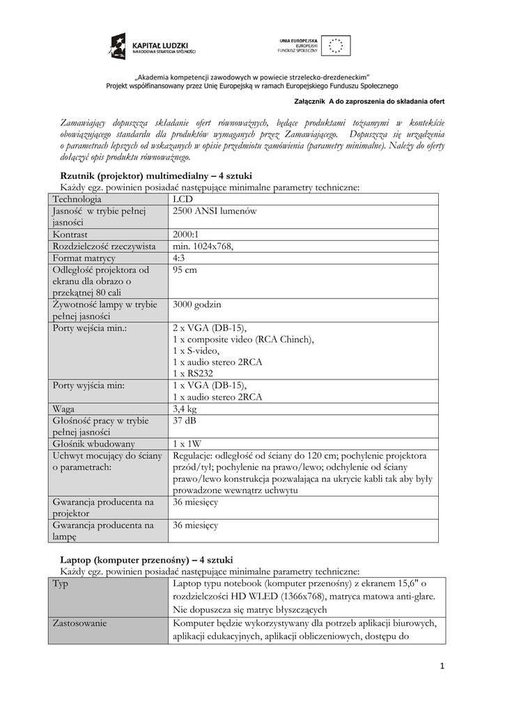 „Akademia kompetencji zawodowych w powiecie strzelecko-drezdeneckim” Projekt współfinansowany przez Unię Europejską w ramach Europejskiego Funduszu Społecznego Załącznik A do zaproszenia do składania ofert Zamawiający dopuszcza składanie ofert równoważnych, będące produktami tożsamymi w kontekście obowiązującego standardu dla produktów wymaganych przez Zamawiającego. Dopuszcza się urządzenia o parametrach lepszych od wskazanych w opisie przedmiotu zamówienia (parametry minimalne). Należy do oferty dołączyć opis produktu równoważnego. Rzutnik (projektor) multimedialny – 4 sztuki Każdy egz. powinien posiadać następujące minimalne parametry techniczne: Technologia LCD Jasność w trybie pełnej 2500 ANSI lumenów jasności Kontrast 2000:1 Rozdzielczość rzeczywista min. 1024x768, Format matrycy 4:3 Odległość projektora od 95 cm ekranu dla obrazo o przekątnej 80 cali Żywotność lampy w trybie 3000 godzin pełnej jasności Porty wejścia min.: 2 x VGA (DB-15), 1 x composite video (RCA Chinch), 1 x S-video, 1 x audio stereo 2RCA 1 x RS232 Porty wyjścia min: 1 x VGA (DB-15), 1 x audio stereo 2RCA Waga 3,4 kg Głośność pracy w trybie 37 dB pełnej jasności Głośnik wbudowany 1 x 1W Uchwyt mocujący do ściany Regulacje: odległość od ściany do 120 cm; pochylenie projektora o parametrach: przód/tył; pochylenie na prawo/lewo; odchylenie od ściany prawo/lewo konstrukcja pozwalająca na ukrycie kabli tak aby były prowadzone wewnątrz uchwytu Gwarancja producenta na 36 miesięcy projektor Gwarancja producenta na 36 miesięcy lampę Laptop (komputer przenośny) – 4 sztuki Każdy egz. powinien posiadać następujące minimalne parametry techniczne: Typ Laptop typu notebook (komputer przenośny) z ekranem 15,6" o rozdzielczości HD WLED (1366x768), matryca matowa anti-glare. Nie dopuszcza się matryc błyszczących Zastosowanie Komputer będzie wykorzystywany dla potrzeb aplikacji biurowych, aplikacji edukacyjnych, aplikacji obliczeniowych, dostępu do 1 „Akademia kompetencji zawodowych w powiecie strzelecko-drezdeneckim” Projekt współfinansowany przez Unię Europejską w ramach Europejskiego Funduszu Społecznego Załącznik A do zaproszenia do składania ofert Internetu oraz poczty elektronicznej. Wydajność obliczeniowa Procesor powinien osiągać w teście wydajności PassMark PerformanceTest (wynik dostępny: http://www.passmark.com/products/pt.htm) co najmniej wynik 3350 punktów Passmark CPU Mark Pamięć operacyjna 4GB 1600 MHz możliwość rozbudowy do min 16GB Parametry pamięci masowej Min. 500GB SATA, 5400 obr./min. SMART, zawierający partycję RECOVERY umożliwiającą odtworzenie systemu operacyjnego fabrycznie zainstalowanego na komputerze po awarii bez dodatkowych nośników. Wydajność grafiki Grafika zintegrowana z procesorem powinna umożliwiać pracę dwumonitorową ze wsparciem dla DirectX 11, OpenGL 3.0, Shader 4.1 – z możliwością dynamicznego przydzielenia do 1695MB pamięci Wyposażenie multimedialne Karta dźwiękowa zintegrowana z płytą główną, zgodna z High Definition, wbudowane dwa głośniki Bateria i zasilanie 6-cell, 48WHr, Li-Ion. Czas pracy na baterii min 5 godzin, zasilacz o mocy min. 65W System operacyjny System operacyjny klasy PC musi spełniać następujące wymagania poprzez wbudowane mechanizmy, bez użycia dodatkowych aplikacji: 1. Dostępne dwa rodzaje graficznego interfejsu użytkownika: a. klasyczny, umożliwiający obsługę przy pomocy klawiatury i myszy, b. dotykowy umożliwiający sterowanie dotykiem na urządzeniach typu tablet lub monitorach dotykowych. 2. Interfejsy użytkownika dostępne w wielu językach do wyboru – w tym Polskim i Angielskim. 3. Funkcje związane z obsługą komputerów typu tablet, z wbudowanym modułem „uczenia się” pisma użytkownika – obsługa języka polskiego. 4. Funkcjonalność rozpoznawania mowy, pozwalającą na sterowanie komputerem głosowo, wraz z modułem „uczenia się” głosu użytkownika. 5. Możliwość dokonywania bezpłatnych aktualizacji i poprawek w ramach wersji systemu operacyjnego poprzez Internet, mechanizmem udostępnianym przez producenta systemu z możliwością wyboru instalowanych poprawek oraz mechanizmem 2 „Akademia kompetencji zawodowych w powiecie strzelecko-drezdeneckim” Projekt współfinansowany przez Unię Europejską w ramach Europejskiego Funduszu Społecznego Załącznik A do zaproszenia do składania ofert sprawdzającym, które z poprawek są potrzebne. 6. Możliwość dokonywania aktualizacji i poprawek systemu poprzez mechanizm zarządzany przez administratora systemu Zamawiającego. 7. Dostępność bezpłatnych biuletynów bezpieczeństwa związanych z działaniem systemu operacyjnego. 8. Wbudowana zapora internetowa (firewall) dla ochrony połączeń internetowych; zintegrowana z systemem konsola do zarządzania ustawieniami zapory i regułami IP v4 i v6. 9. Wbudowane mechanizmy ochrony antywirusowej i przeciw złośliwemu oprogramowaniu z zapewnionymi bezpłatnymi aktualizacjami. 10. Zlokalizowane w języku polskim, co najmniej następujące elementy: menu, odtwarzacz multimediów, pomoc, komunikaty systemowe. 11. Graficzne środowisko instalacji i konfiguracji dostępne w języku polskim. 12. Wsparcie dla większości powszechnie używanych urządzeń peryferyjnych (drukarek, urządzeń sieciowych, standardów USB, Plug&Play, Wi-Fi). 13. Funkcjonalność automatycznej zmiany domyślnej drukarki w zależności od sieci, do której podłączony jest komputer. 14. Możliwość zarządzania stacją roboczą poprzez polityki grupowe – przez politykę rozumiemy zestaw reguł definiujących lub ograniczających funkcjonalność systemu lub aplikacji. 15. Rozbudowane, definiowalne polityki bezpieczeństwa – polityki dla systemu operacyjnego i dla wskazanych aplikacji. 16. Zabezpieczony hasłem hierarchiczny dostęp do systemu, konta i profile użytkowników zarządzane zdalnie; praca systemu w