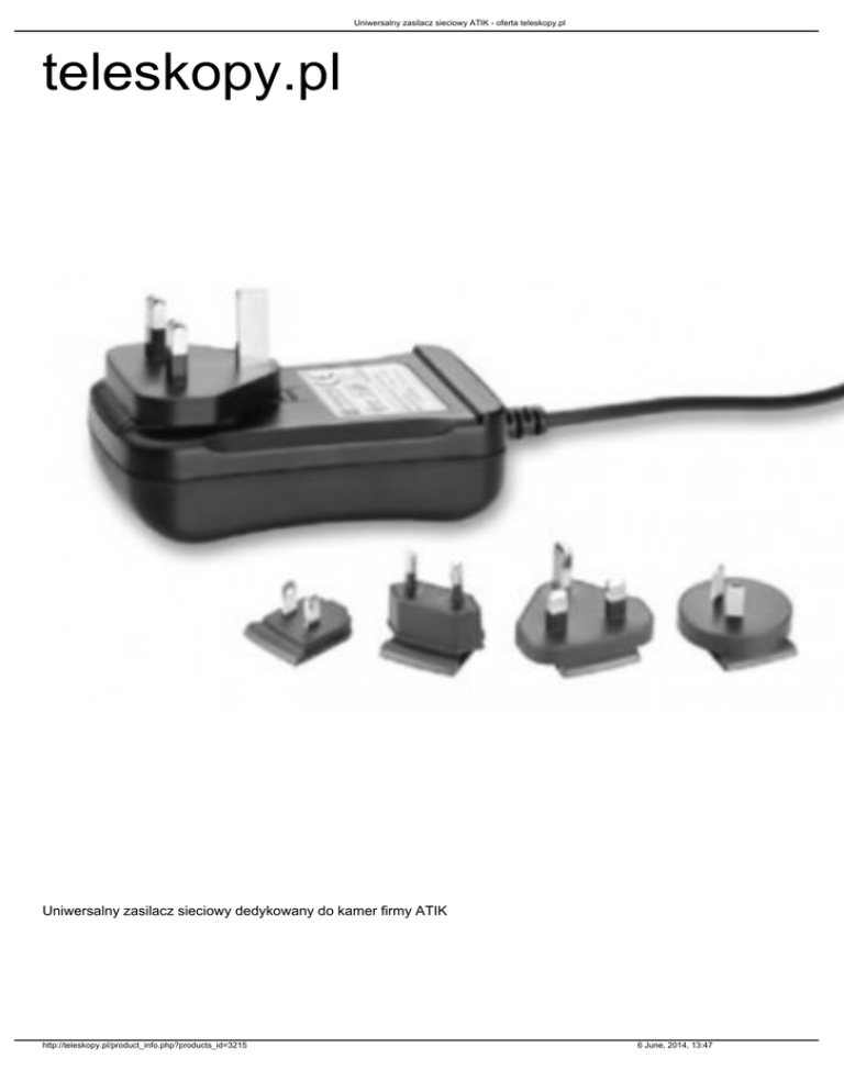 Uniwersalny zasilacz sieciowy ATIK - oferta teleskopy.pl teleskopy.pl Uniwersalny zasilacz sieciowy dedykowany do kamer firmy ATIK http://teleskopy.pl/product_info.php?products_id=3215 6 June, 2014, 13:47