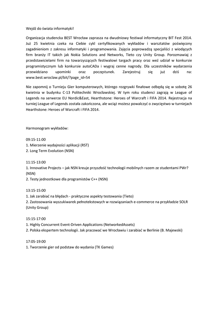 Wejdź do świata informatyki! Organizacja studencka BEST Wrocław zaprasza na dwudniowy festiwal informatyczny BIT Fest 2014. Już 25 kwietnia czeka na Ciebie cykl certyfikowanych wykładów i warsztatów poświęcony zagadnieniom z zakresu informatyki i programowania. Zajęcia poprowadzą specjaliści z wiodących firm branży IT takich jak Nokia Solutions and Networks, Tieto czy Unity Group. Porozmawiaj z przedstawicielami firm na towarzyszących festiwalowi targach pracy oraz weź udział w konkursie programistycznym lub konkursie autoCADa i wygraj cenne nagrody. Dla uczestników wydarzenia przewidziano upominki oraz poczęstunek. Zarejestruj się już dziś na: www.best.wroclaw.pl/bit/?page_id=54 Nie zapomnij o Turnieju Gier komputerowych, którego rozgrywki finałowe odbędą się w sobotę 26 kwietnia w budynku C-13 Politechniki Wrocławskiej. W tym roku studenci zagrają w League of Legends na serwerze EU Nordic&East, Hearthstone: Heroes of Warcraft i FIFA 2014. Rejestracja na turniej League of Legends została zakończona, ale wciąż możesz powalczyć o zwycięstwo w turniejach Hearthstone: Heroes of Warcraft i FIFA 2014. Harmonogram wykładów: 09:15-11:00 1. Mierzenie wydajności aplikacji (RST) 2. Long Term Evolution (NSN) 11:15-13:00 1. Innovative Projects – jak NSN kreuje przyszłość technologii mobilnych razem ze studentami PWr? (NSN) 2. Testy jednostkowe dla programistów C++ (NSN) 13:15-15:00 1. Jak zarabiać na błędach - praktyczne aspekty testowania (Tieto) 2. Zastosowania wyszukiwarek pełnotekstowych w rozwiązaniach e-commerce na przykładzie SOLR (Unity Group) 15:15-17:00 1. Highly Concurrent Event-Driven Applications (NetworkedAssets) 2. Polska ekspertem technologii. Jak pracować we Wrocławiu i zarabiać w Berlinie (B. Majewski) 17:05-19:00 1. Tworzenie gier od podstaw do wydania (TK Games)