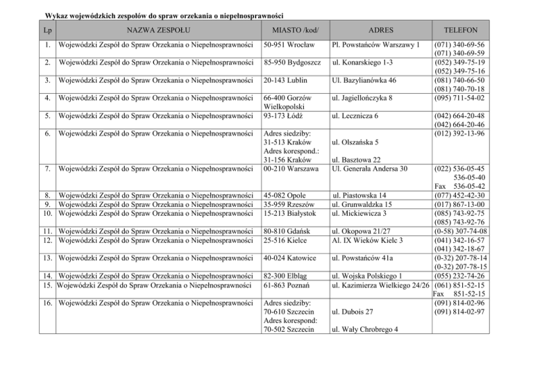 Wykaz wojewódzkich zespołów do spraw orzekania o niepełnosprawności Lp NAZWA ZESPOŁU MIASTO /kod/ ADRES 1. Wojewódzki Zespół do Spraw Orzekania o Niepełnosprawności 50-951 Wrocław Pl. Powstańców Warszawy 1 2. Wojewódzki Zespół do Spraw Orzekania o Niepełnosprawności 85-950 Bydgoszcz ul. Konarskiego 1-3 3. Wojewódzki Zespół do Spraw Orzekania o Niepełnosprawności 20-143 Lublin Ul. Bazylianówka 46 4. Wojewódzki Zespół do Spraw Orzekania o Niepełnosprawności ul. Jagiellończyka 8 5. Wojewódzki Zespół do Spraw Orzekania o Niepełnosprawności 66-400 Gorzów Wielkopolski 93-173 Łódź 6. Wojewódzki Zespół do Spraw Orzekania o Niepełnosprawności 7. Wojewódzki Zespół do Spraw Orzekania o Niepełnosprawności Adres siedziby: 31-513 Kraków Adres korespond.: 31-156 Kraków 00-210 Warszawa 8. Wojewódzki Zespół do Spraw Orzekania o Niepełnosprawności 9. Wojewódzki Zespół do Spraw Orzekania o Niepełnosprawności 10. Wojewódzki Zespół do Spraw Orzekania o Niepełnosprawności 45-082 Opole 35-959 Rzeszów 15-213 Białystok 11. Wojewódzki Zespół do Spraw Orzekania o Niepełnosprawności 12. Wojewódzki Zespół do Spraw Orzekania o Niepełnosprawności 80-810 Gdańsk 25-516 Kielce 13. Wojewódzki Zespół do Spraw Orzekania o Niepełnosprawności 40-024 Katowice 14. Wojewódzki Zespół do Spraw Orzekania o Niepełnosprawności 15. Wojewódzki Zespół do Spraw Orzekania o Niepełnosprawności 82-300 Elbląg 61-863 Poznań 16. Wojewódzki Zespół do Spraw Orzekania o Niepełnosprawności Adres siedziby: 70-610 Szczecin Adres korespond: 70-502 Szczecin ul. Lecznicza 6 TELEFON (071) 340-69-56 (071) 340-69-59 (052) 349-75-19 (052) 349-75-16 (081) 740-66-50 (081) 740-70-18 (095) 711-54-02 (042) 664-20-48 (042) 664-20-46 (012) 392-13-96 ul. Olszańska 5 ul. Basztowa 22 Ul. Generała Andersa 30 (022) 536-05-45 536-05-40 Fax 536-05-42 ul. Piastowska 14 (077) 452-42-30 ul. Grunwaldzka 15 (017) 867-13-00 ul. Mickiewicza 3 (085) 743-92-75 (085) 743-92-76 ul. Okopowa 21/27 (0-58) 307-74-08 Al. IX Wieków Kielc 3 (041) 342-16-57 (041) 342-18-67 ul. Powstańców 41a (0-32) 207-78-14 (0-32) 207-78-15 ul. Wojska Polskiego 1 (055) 232-74-26 ul. Kazimierza Wielkiego 24/26 (061) 851-52-15 Fax 851-52-15 (091) 814-02-96 ul. Dubois 27 (091) 814-02-97 ul. Wały Chrobrego 4
