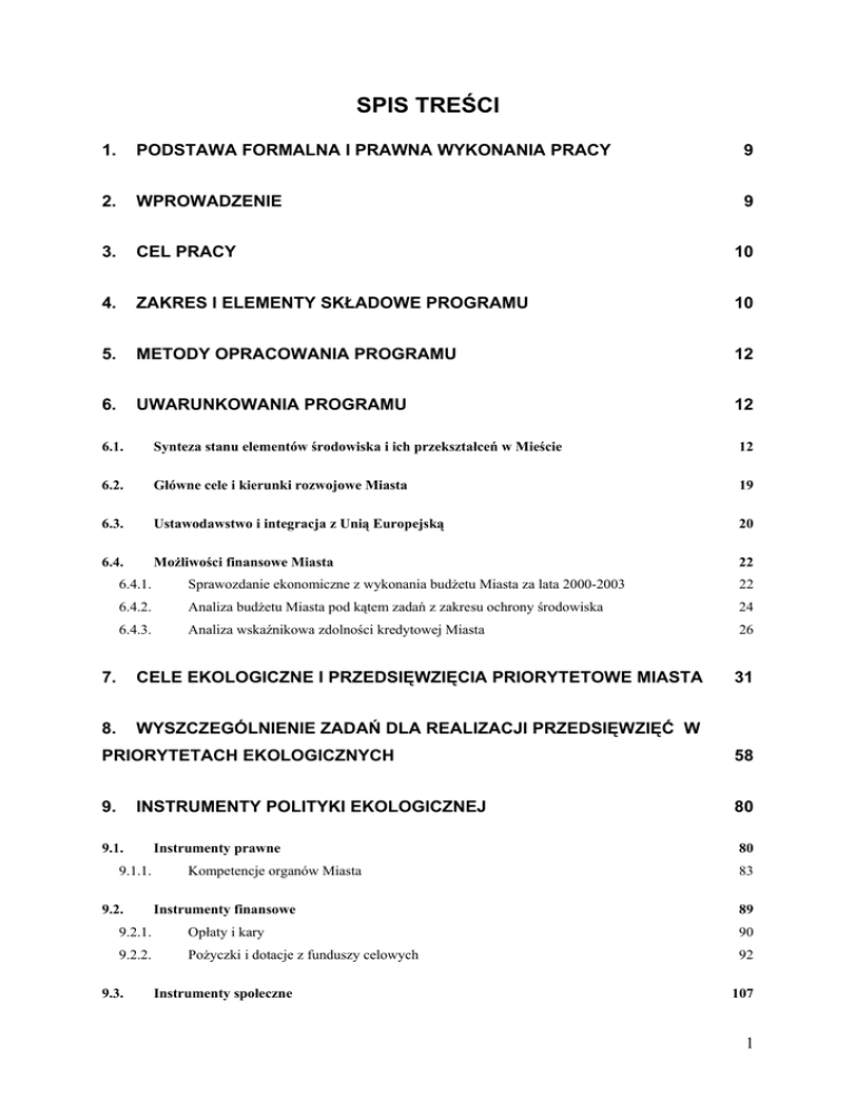 SPIS TREŚCI 1. PODSTAWA FORMALNA I PRAWNA WYKONANIA PRACY 9 2. WPROWADZENIE 9 3. CEL PRACY 10 4. ZAKRES I ELEMENTY SKŁADOWE PROGRAMU 10 5. METODY OPRACOWANIA PROGRAMU 12 6. UWARUNKOWANIA PROGRAMU 12 6.1. Synteza stanu elementów środowiska i ich przekształceń w Mieście 12 6.2. Główne cele i kierunki rozwojowe Miasta 19 6.3. Ustawodawstwo i integracja z Unią Europejską 20 6.4. Możliwości finansowe Miasta 22 6.4.1. Sprawozdanie ekonomiczne z wykonania budżetu Miasta za lata 2000-2003 22 6.4.2. Analiza budżetu Miasta pod kątem zadań z zakresu ochrony środowiska 24 6.4.3. Analiza wskaźnikowa zdolności kredytowej Miasta 26 7. CELE EKOLOGICZNE I PRZEDSIĘWZIĘCIA PRIORYTETOWE MIASTA 8. WYSZCZEGÓLNIENIE ZADAŃ DLA REALIZACJI PRZEDSIĘWZIĘĆ W 31 PRIORYTETACH EKOLOGICZNYCH 58 9. 80 INSTRUMENTY POLITYKI EKOLOGICZNEJ 9.1. 9.1.1. 9.2. Instrumenty prawne Kompetencje organów Miasta 80 83 Instrumenty finansowe 89 9.2.1. Opłaty i kary 90 9.2.2. Pożyczki i dotacje z funduszy celowych 92 9.3. Instrumenty społeczne 107 1 9.3.1. Współpraca 107 9.3.2. Informacja i komunikowanie 108 9.3.3. Edukacja ekologiczna 109 Instrumenty strukturalne 109 9.4. 10. ORGANIZACJA ZARZĄDZANIA PROGRAMEM 111 11. MONITORING JAKOŚCI ŚRODOWISKA I POLITYKI EKOLOGICZNEJ 116 11. 1. Rola monitoringu 116 11.2. Państwowy monitoring ochrony środowiska 117 11.3. Monitoring jakości środowiska na terenie Miasta 118 11.3.1. Monitoring wód 118 11.3.2. Monitoring gleb 120 11.3.3. Monitoring powietrza 120 11.4. Monitoring wdrażania programu 121 12. HARMONOGRAM WDRAŻANIA PROGRAMU 127 13. PODSUMOWANIE 130 2 SPIS TABLIC Tablica 6.1. Synteza stanu elementów środowiska i ich przekształceń w Siemianowicach Śląskich ............................................................................................................... 13 Tablica 6.2. Syntetyczne zestawienie źródeł dochodów i wydatków budżetowych Siemianowic Śląskich w latach 2000 – 2003...................................................... 23 Tablica 6.3. Wykaz zaciągniętych kredytów i pożyczek przez Siemianowice Śląskie w latach 2000-2003 ........................................................................................................... 24 Tablica 6.4. Wydatki przeznaczone na ochronę środowiska w budżecie Siemianowic Śląskich 25 Tablica 6.5. Wskaźniki finansowe dla oceny zdolności kredytowej Siemianowic Śląskich ... 27 Tablica 6.6. Wskaźnik dochodowości dla wybranych gmin (miast na prawach powiatu) województwa śląskiego....................................................................................... 29 Tablica 7.1. Zestawienie celów i priorytetów ekologicznych Siemianowic Śląskich na lata 2004-2011 ........................................................................................................... 31 Tablica 7.2. Cele ekologiczne programu ochrony środowiska województwa śląskiego, w których realizacji uczestniczą Siemianowice Śląskie ..................................... 37 Tablica 7.3. Cele i priorytety ekologiczne Siemianowic Śląskich na tle polityki ekologicznej państwa oraz strategii rozwoju województwa śląskiego..................................... 39 Tablica 8.1. Zadania inwestycyjne z zakresu ochrony środowiska realizowane przez Siemianowice Śląskie w latach 2004-2011........................................................ 61 Tablica 8.2. Lista zadań inwestycyjnych z zakresu ochrony środowiska planowanych do realizacji przez przedsiębiorstwa na terenie Siemianowic Śląskich w latach 2004-2011 ........................................................................................................... 71 Tablica 10.1. Zarządzanie środowiskiem w Siemianowicach Śląskich.................................. 115 Tablica 11.1. Proponowane wskaźniki główne oceny stanu środowiska ............................... 122 Tablica 11.2. Proponowane wskaźniki pozostałe oceny stanu środowiska ............................ 126 Tablica 12.1. Harmonogram wdrażania „Programu ochrony środowiska dla miasta Siemianowice Śląskie”...................................................................................... 128 Tablica 12.2. Wykaz przedsięwzięć do realizacji dotyczących gospodarki odpadami w Siemianowicach Śląskich w latach 2004 – 2015 ......................................... 129 3 SPIS RYSUNKÓW Rys. 1. Wydatki w budżecie Siemianowic Śląskich na inwestycje i działalność bieżącą w zakresie ochrony środowiska [mln zł]............................................................... 26 Rys. 2. Wskaźnik dochodowości [zł/M] w miastach na prawach powiatu w województwie śląskim dla roku 2000 i 2001 ................................................................................ 30 Rys. 3. Schemat zarządzania programem ochrony środowiska ........................................ 114 4 WYKAZ ZASTOSOWANYCH TERMINÓW I SKRÓTÓW Terminy Termin 1 acquis communautaire allochtoniczny antropopresja Biochemiczne Zapotrzebowanie Tlenu (BZT) Chemiczne Zapotrzebowanie Tlenu (ChZT) dB (decybel) degradacja środowiska EMAS emisja niezorganizowana emisja zorganizowana ex ant ex post ex situ implementacja in situ miano coli nadzwyczajne zagrożenie środowiska najlepsza dostępna technika Definicja 2 dorobek prawny Unii Europejskiej obcy, pochodzący z zewnątrz, z innego środowiska lub obszaru czynnik lub składnik nasilające się oddziaływanie człowieka na komponenty środowiska poprzez nie w pełni kontrolowane, uboczne efekty działalności gospodarczej wskaźnik zanieczyszczenia wód oznaczający ilość tlenu zużywanego do mineralizacji (utleniania) związków organicznych zawartych w zanieczyszczonej wodzie, stosowany najczęściej do oznaczenia ilości ścieków organicznych umowny wskaźnik zanieczyszczenia wód związkami organicznymi i niektórymi nieorganicznymi (sole żelazawe, azotyny, siarczki itp., związki redukujące), oznaczający ilość tlenu (w m