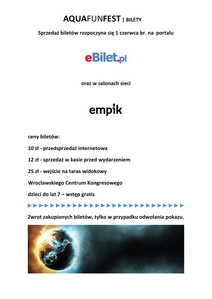 AQUAFUNFEST | BILETY Sprzedaż biletów rozpoczyna się 1 czerwca br. na portalu oraz w salonach sieci ceny biletów: 10 zł - przedsprzedaż internetowa 12 zł - sprzedaż w kasie przed wydarzeniem 25 zł - wejście na taras widokowy Wrocławskiego Centrum Kongresowego dzieci do lat 7 – wstęp gratis ►►►►►►►►►►►►►►►►►►►►►►►►►►►► Zwrot zakupionych biletów, tylko w przypadku odwołania pokazu.