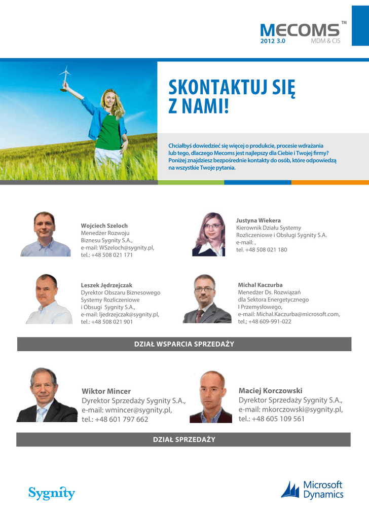 3.0 MDM & CIS SKONTAKTUJ SIĘ Z NAMI! Chciałbyś dowiedzieć się więcej o produkcie, procesie wdrażania lub tego, dlaczego Mecoms jest najlepszy dla Ciebie i Twojej firmy? Poniżej znajdziesz bezpośrednie kontakty do osób, które odpowiedzą na wszystkie Twoje pytania. Wojciech Szeloch Menedżer Rozwoju Biznesu Sygnity S.A., e-mail: [email protected], tel.: +48 508 021 171 Leszek Jędrzejczak Dyrektor Obszaru Biznesowego Systemy Rozliczeniowe i Obsugi Sygnity S.A., e-mail: [email protected], tel.: +48 508 021 901 Justyna Wiekera Kierownik Działu Systemy Rozliczeniowe i Obsługi Sygnity S.A. e-mail: , tel. +48 508 021 180 Michal Kaczurba Menedżer Ds. Rozwiązań dla Sektora Energetycznego I Przemysłowego, e-mail: [email protected], tel.; +48 609-991-022 DZIAŁ WSPARCIA SPRZEDAŻY Wiktor Mincer Dyrektor Sprzedaży Sygnity S.A., e-mail: [email protected], tel.: +48 601 797 662 DZIAŁ SPRZEDAŻY Maciej Korczowski Dyrektor Sprzedaży Sygnity S.A., e-mail: [email protected], tel.: +48 605 109 561