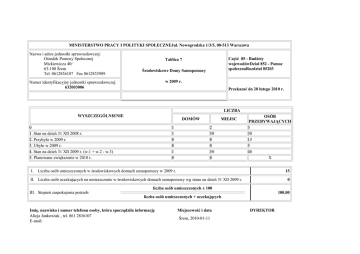 MINISTERSTWO PRACY I POLITYKI SPOŁECZNEJul. Nowogrodzka 1/3/5, 00-513 Warszawa Nazwa i adres jednostki sprawozdawczej: Ośrodek Pomocy Społecznej Mickiewicza 40/ 63-100 Śrem Tel. 0612836107 Fax 0612833989 Część 85 - Budżety wojewodówDział 852 - Pomoc społecznaRozdział 85203 Tablica 7 Środowiskowe Domy Samopomocy w 2009 r. Numer identyfikacyjny jednostki sprawozdawczej: 632003006 Przekazać do 28 lutego 2010 r. LICZBA WYSZCZEGÓLNIENIE DOMÓW 0 1. Stan na dzień 31 XII 2008 r. 2. Przybyło w 2009 r. 3. Ubyło w 2009 r. 4. Stan na dzień 31 XII 2009 r. (w.1 + w.2 - w.3) 5. Planowane zwiększenie w 2010 r. I. 1 1 0 0 1 0 MIEJSC 2 50 0 0 50 0 OSÓB PRZEBYWAJĄCYCH 3 38 15 5 48 X Liczba osób umieszczonych w środowiskowych domach samopomocy w 2009 r. 15 II. Liczba osób oczekujących na umieszczenie w środowiskowych domach samopomocy wg stanu na dzień 31 XII 2009 r. III. Stopień zaspokojenia potrzeb: 0 liczba osób umieszczonych x 100 100,00 liczba osób umieszczonych + oczekujących Imię, nazwisko i numer telefonu osoby, która sporządziła informację Alicja Jankowiak , tel. 061 2836107 E-mail: Miejscowość i data Śrem, 2010-01-11 DYREKTOR MINISTERSTWO PRACY I POLITYKI SPOŁECZNEJul. Nowogrodzka 1/3/5, 00-513 Warszawa Nazwa i adres jednostki sprawozdawczej: Ośrodek Pomocy Społecznej Mickiewicza 40/ 63-100 Śrem Tel. 0612836107 Fax 0612833989 Tablica 8 Część 85 - Budżety Liczba osób zatrudnionych w Środowiskowych Domach wojewodówDział 852 - Pomoc Samopomocy według form zatrudnienia wg stanu na społecznaRozdział 85203 dzień Numer identyfikacyjny jednostki sprawozdawczej: 632003006 31 XII 2009 r. Przekazać do 28 lutego 2010 r. WYSZCZEGÓLNIENIE LICZBA OSÓB 0 1 OGÓŁEM ZATRUDNIENI (1+2) 16 z tego: 1) na podstawie umowy o pracę (a+b) 16 z tego: a) w pełnym wymiarze czasu pracy 14 b) w niepełnym wymiarze czasu pracy 2 2) wg innych form Imię, nazwisko i numer telefonu osoby, która sporządziła informację Alicja Jankowiak , tel. 061 2836107 E-mail: 0 Miejscowość i data Śrem, 2010-01-11 DYREKTOR MINISTERSTWO PRACY I POLITYKI SPOŁECZNEJul. Nowogrodzka 1/3/5, 00-513 Warszawa Nazwa i adres jednostki sprawozdawczej: Ośrodek Pomocy Społecznej Mickiewicza 40/ 63-100 Śrem Tel. 0612836107 Fax 0612833989 Numer identyfikacyjny jednostki sprawozdawczej: 632003006 Tablica 9 Część 85 - Budżety Liczba osób zatrudnionych w Środowiskowych Domach wojewodówDział 852 - Pomoc społecznaRozdział 85203 Samopomocy na podstawie umowy o pracę w przeliczeniu na pełne etaty wg działów wg stanu na dzień 31 XII 2009 r. Przekazać do 28 lutego 2010 r. PRACOWNICY 0 OGÓŁEM (1+2+3+4+5) z tego: 1) kierujący jednostkami organizacyjnymi 2) działalności opiekuńczo-terapeutycznej 3) działalności medyczno-rehabilitacyjnej 4) działalności administracyjnej 5) gospodarczy i obsługi W PRZELICZENIU NA PEŁNE ETATY LICZBA OSÓB 1 2 16 15,00 1 8 3 1 3 1,00 7,00 3,00 1,00 3,00 UWAGA! Etaty należy podać z dwoma miejscami po przecinku. Imię, nazwisko i numer telefonu osoby, która sporządziła informację Alicja Jankowiak , tel. 061 2836107 E-mail: Miejscowość i data Śrem, 2010-01-11 DYREKTOR MINISTERSTWO PRACY I POLITYKI SPOŁECZNEJul. Nowogrodzka 1/3/5, 00-513 Warszawa Nazwa i adres jednostki sprawozdawczej: Ośrodek Pomocy Społecznej Mickiewicza 40/ 63-100 Śrem Tel. 0612836107 Fax 0612833989 Mieszkania chronione w 2009 r. Numer identyfikacyjny jednostki sprawozdawczej: 632003006 Przekazać do 28 lutego 2010 r. WYSZCZEGÓLNIENIE LICZBA MIEJSC MIESZKAŃ 0 1. Stan na dzień 31 XII 2008 r. 2. Przybyło w 2009 r. 3. Ubyło w 2009 r. 4. Stan na dzień 31 XII 2009 r. (w.1 + w.2 - w.3) 5. Planowane zwiększenie w 2010 r. I. Część 85 - Budżety wojewodówDział 852 - Pomoc społecznaRozdział 85220 Tablica 10 1 0 0 0 0 0 2 0 0 0 0 0 MIESZKAŃCÓW 3 0 0 0 0 X Liczba osób umieszczonych w mieszkaniach chronionych w 2009 r. 0 II. Liczba osób oczekujących na umieszczenie w mieszkaniach chronionych wg stanu na dzień 31 XII 2009 r. III. Stopień zaspokojenia potrzeb: 0 liczba osób umieszczonych x 100 NaN liczba osób umieszczonych + oczekujących Imię, nazwisko i numer telefonu osoby, która sporządziła informację Alicja Jankowiak , tel. 061 2836107 E-mail: Miejscowość i data Śrem, 2010-01-11 DYREKTOR