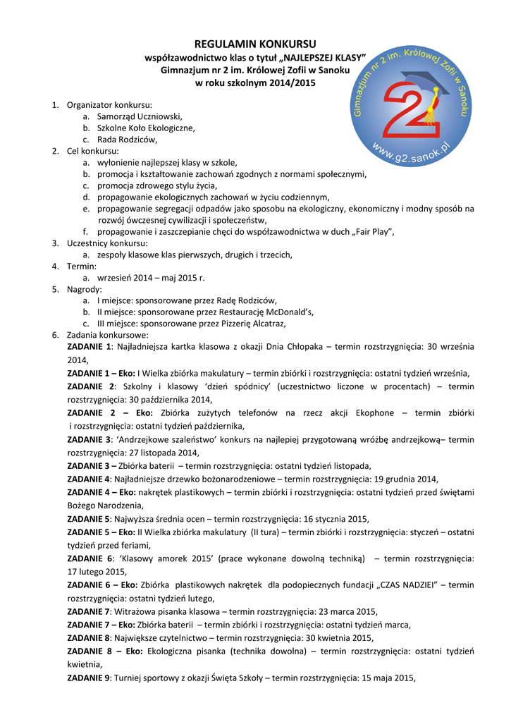 REGULAMIN KONKURSU współzawodnictwo klas o tytuł „NAJLEPSZEJ KLASY” Gimnazjum nr 2 im. Królowej Zofii w Sanoku w roku szkolnym 2014/2015 1. Organizator konkursu: a. Samorząd Uczniowski, b. Szkolne Koło Ekologiczne, c. Rada Rodziców, 2. Cel konkursu: a. wyłonienie najlepszej klasy w szkole, b. promocja i kształtowanie zachowań zgodnych z normami społecznymi, c. promocja zdrowego stylu życia, d. propagowanie ekologicznych zachowań w życiu codziennym, e. propagowanie segregacji odpadów jako sposobu na ekologiczny, ekonomiczny i modny sposób na rozwój ówczesnej cywilizacji i społeczeństw, f. propagowanie i zaszczepianie chęci do współzawodnictwa w duch „Fair Play”, 3. Uczestnicy konkursu: a. zespoły klasowe klas pierwszych, drugich i trzecich, 4. Termin: a. wrzesień 2014 – maj 2015 r. 5. Nagrody: a. I miejsce: sponsorowane przez Radę Rodziców, b. II miejsce: sponsorowane przez Restaurację McDonald’s, c. III miejsce: sponsorowane przez Pizzerię Alcatraz, 6. Zadania konkursowe: ZADANIE 1: Najładniejsza kartka klasowa z okazji Dnia Chłopaka – termin rozstrzygnięcia: 30 września 2014, ZADANIE 1 – Eko: I Wielka zbiórka makulatury – termin zbiórki i rozstrzygnięcia: ostatni tydzień września, ZADANIE 2: Szkolny i klasowy ‘dzień spódnicy’ (uczestnictwo liczone w procentach) – termin rozstrzygnięcia: 30 października 2014, ZADANIE 2 – Eko: Zbiórka zużytych telefonów na rzecz akcji Ekophone – termin zbiórki i rozstrzygnięcia: ostatni tydzień października, ZADANIE 3: ‘Andrzejkowe szaleństwo’ konkurs na najlepiej przygotowaną wróżbę andrzejkową– termin rozstrzygnięcia: 27 listopada 2014, ZADANIE 3 – Zbiórka baterii – termin rozstrzygnięcia: ostatni tydzień listopada, ZADANIE 4: Najładniejsze drzewko bożonarodzeniowe – termin rozstrzygnięcia: 19 grudnia 2014, ZADANIE 4 – Eko: nakrętek plastikowych – termin zbiórki i rozstrzygnięcia: ostatni tydzień przed świętami Bożego Narodzenia, ZADANIE 5: Najwyższa średnia ocen – termin rozstrzygnięcia: 16 stycznia 2015, ZADANIE 5 – Eko: II Wielka zbiórka makulatury (II tura) – termin zbiórki i rozstrzygnięcia: styczeń – ostatni tydzień przed feriami, ZADANIE 6: ‘Klasowy amorek 2015’ (prace wykonane dowolną techniką) – termin rozstrzygnięcia: 17 lutego 2015, ZADANIE 6 – Eko: Zbiórka plastikowych nakrętek dla podopiecznych fundacji „CZAS NADZIEI” – termin rozstrzygnięcia: ostatni tydzień lutego, ZADANIE 7: Witrażowa pisanka klasowa – termin rozstrzygnięcia: 23 marca 2015, ZADANIE 7 – Eko: Zbiórka baterii – termin zbiórki i rozstrzygnięcia: ostatni tydzień marca, ZADANIE 8: Największe czytelnictwo – termin rozstrzygnięcia: 30 kwietnia 2015, ZADANIE 8 – Eko: Ekologiczna pisanka (technika dowolna) – termin rozstrzygnięcia: ostatni tydzień kwietnia, ZADANIE 9: Turniej sportowy z okazji Święta Szkoły – termin rozstrzygnięcia: 15 maja 2015, 7. 8. 9. 10. ZADANIE 9 – Eko: Wielka zbiórka makulatury (III tura) – termin zbiórki i rozstrzygnięcia: ostatni tydzień maja. Punktacja konkursowa: a. klasyfikacja generalna polega na przeliczaniu sumy punktów uzyskanych za zajęte miejsca w poszczególnych konkursach przy założeniu, że za I miejsce, przyznawanych jest 11 pkt., a za XI miejsce – 1 pkt. Klasa, która nie weźmie udziału w danym konkursie, otrzyma 0 pkt., b. w zakresie działań ekologicznych prowadzona jest również klasyfikacja indywidualna o tytuł „LIDERA EKOLOGII”, Koordynatorzy konkursu: a. Marzena Brejta i Marzena Radwańska – działania Samorządu Uczniowskiego, b. Maria Trzeciak i Aneta Pelc – działania proekologiczne, c. Marzena Radwańska i Gabriela Socha – działania artystyczne, d. Dorota Nowicka – działania biblioteczne, e. Daniel Sękowski – konsultacje historyczne, f. Wacław Bojarski – statystyki szkolne, g. Grzegorz Miranowicz i Sebastian Wasylik – działania sportowe. Komisja konkursowa: a. przewodnicząca: Marzena Brejta, b. zastępca przewodniczącej: Maria Trzeciak, c. członkowie: Gabriela Socha, Marzena Radwańska, Dorota Nowicka, Wacław Bojarski, Sebastian Wasylik, Daniel Sękowski, Grzegorz Miranowicz i przewodniczący klas pierwszych, drugich i trzecich (11 uczniów). Postanowienia końcowe: a. regulamin konkursu opublikowany zostanie na stronie internetowej szkoły oraz szkolnych gazetkach ściennych i będzie dostępny u wychowawców i przewodniczących klas oraz opiekunów i przewodniczącego Samorządu Uczniowskiego, b. do 10 dnia każdego następnego miesiąca będą podsumowane wyniki cząstkowe rywalizacji klas i opublikowane na stronie internetowej szkoły oraz szkolnych gazetkach ściennych, c. organizator zastrzega sobie prawo do ostatecznej interpretacji zapisów regulaminu. …………………………………………………………….. …………………………………………………………….. …………………………………………………………….. (opiekunowie SU) (podpis dyrektora szkoły)