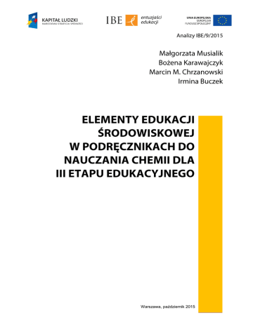 Warszawa, październik 2015 Autorzy: dr Małgorzata Musialik dr Bożena Karawajczyk dr Marcin M. Chrzanowski Irmina Buczek Zespół realizujący badanie: dr Małgorzata Musialik – kierownik badania dr Bożena Karawajczyk – ekspert zewnętrzny IBE Konsultacje merytoryczne: prof. dr hab. Jolanta Choińska-Mika prof. dr hab. Krzysztof Spalik Wydawca: Instytut Badań Edukacyjnych ul. Górczewska 8 01-180 Warszawa tel. (22) 241 71 00; www.ibe.edu.pl © Copyright by: Instytut Badań Edukacyjnych, Warszawa 2015 Publikacja powstała w ramach projektu badawczego Uwarunkowania decyzji edukacyjnych realizowanego przez Instytut Badań Edukacyjnych wspólnie ze Szkołą Główną Handlową. Badanie w terenie zostało wykonane przez konsorcjum składające się z Millward Brown oraz PBS spółka z o.o. Badanie jest prowadzone w ramach projektu systemowego pod nazwą Badanie jakości i efektywności edukacji oraz instytucjonalizacja zaplecza badawczego współfinansowanego ze środków Europejskiego Funduszu Społecznego w ramach Programu Operacyjnego Kapitał Ludzki. Egzemplarz bezpłatny Streszczenie Nasilająca się w ostatnich dziesięcioleciach eksploatacja zasobów naturalnych doprowadziła do postępującej degradacji środowiska naturalnego, a co za tym idzie, wymusiła podjęcie w skali globalnej skoordynowanych działań mających zapobiec katastrofie ekologicznej. Ochrona dóbr naturalnych oraz dążenie do trwałego i zrównoważonego rozwoju stały się priorytetem także dla władz polskich, które zobowiązały się do wdrożenia założeń zrównoważonego rozwoju, w tym postawienia większego nacisku na zwiększenie świadomości obywateli i kształtowanie postaw prośrodowiskowych poprzez efektywną edukację środowiskową na wszystkich poziomach kształcenia. W 2008 roku Ministerstwo Edukacji Narodowej wprowadziło nową podstawę programową kształcenia ogólnego w Polsce, która zawierała istotne zmiany dotyczące edukacji środowiskowej na III (gimnazjalnym) etapie kształcenia. Jakkolwiek najwięcej treści powiązanych z edukacją ekologiczną, czy szerzej środowiskową, zawierają podstawy programowe biologii i geografii, to jednak chemia – jako ta dziedzina nauki, która bada właściwości substancji chemicznych oraz wpływ procesów chemicznych na stan środowiska naturalnego – powinna pełnić istotną rolę w rozwijaniu wiedzy środowiskowej oraz postaw prośrodowiskowych wśród uczniów polskich szkół. Reforma edukacyjna narzuciła konieczność zaktualizowania podręczników do nauki chemii zgodnie z wymaganiami zawartymi w nowej podstawie programowej. Celem badania była analiza podstawy programowej przedmiotu chemia dla III etapu kształcenia oraz dopasowanych do niej podręczników pod kątem występowania i częstości występowania elementów związanych z edukacją środowiskową. Miało to pomóc w ustaleniu, w jakim stopniu zreformowana podstawa programowa dla tego przedmiotu umożliwia zapoznanie się uczniów z kwestiami ważnymi z punktu widzenia edukacji środowiskowej. Analizie poddano podręczniki dla szkół gimnazjalnych, które zostały dopuszczone do użytku szkolnego przez Ministerstwo Edukacji Narodowej. Porównanie wybranych podręczników dostarczyło informacji o stanie obecnym wdrażania reformy edukacyjnej, sposobach interpretacji zapisów podstawy programowej przez poszczególnych autorów tych podręczników oraz o elementach podstawy programowej dotyczących problemów środowiskowych, które warto uzupełnić lub uściślić. Wyniki badania wskazują, że podstawa programowa chemii dla gimnazjum zawiera szereg zapisów dotyczących edukacji środowiskowej, które są wystarczającą bazą do kompleksowego zapoznania uczniów z problematyką ochrony środowiska. Zapisy podstawy programowej dają szerokie możliwości interpretacyjne autorom podręczników, co ma zarówno swoje zalety, jak i pewne wady. Analiza podręczników wykazała bowiem, że choć w zdecydowanej większości przypadków zagadnienia odnoszące się do edukacji środowiskowej, ujęte w wymaganiach podstawy programowej, omówiono mniej lub bardziej wyczerpująco, to czasami rozbudowywano je nadmiernie, a innym razem ledwo o nich wspominano. Przynajmniej część autorów podręczników zadbała o to, aby podczas lektury uczniowie nie tylko poznawali pewne fakty, ale także rozwijali swoje umiejętności badawcze i umiejętność krytycznej analizy informacji oraz kształtowali postawy prośrodowiskowe. Summary In recent decades the increasing exploitation of natural resources has led to the progressive degradation of natural environment, and consequently, has forced to undertake coordinated actions on a global scale to prevent an ecological crisis. Protection of natural resources and the pursuit of sustainable development has also become a priority for the Polish authorities, who have committed to implement the principles of sustainable development, including placing greater emphasis on raising public awareness and pro-environmental attitudes through effective environmental education at all levels of education. In the year 2008 the Ministry of Education introduced a new core curriculum for general education in Poland, which included significant changes concerning environmental education at 3 rd (junior high school, ISCED 2) stage of education. Although most of the content related to ecological education, or more broadly environmental education, is included in the core curriculum of biology and geography, chemistry however – as the scientific discipline which investigates the chemical properties of substances and the impact of chemical processes on the state of the natural environment – should play a pivotal role in the development of environmental knowledge and pro-environmental attitudes among students of Polish schools. The educational reform has imposed the need to update chemistry textbooks in accordance with the requirements of the new core curriculum