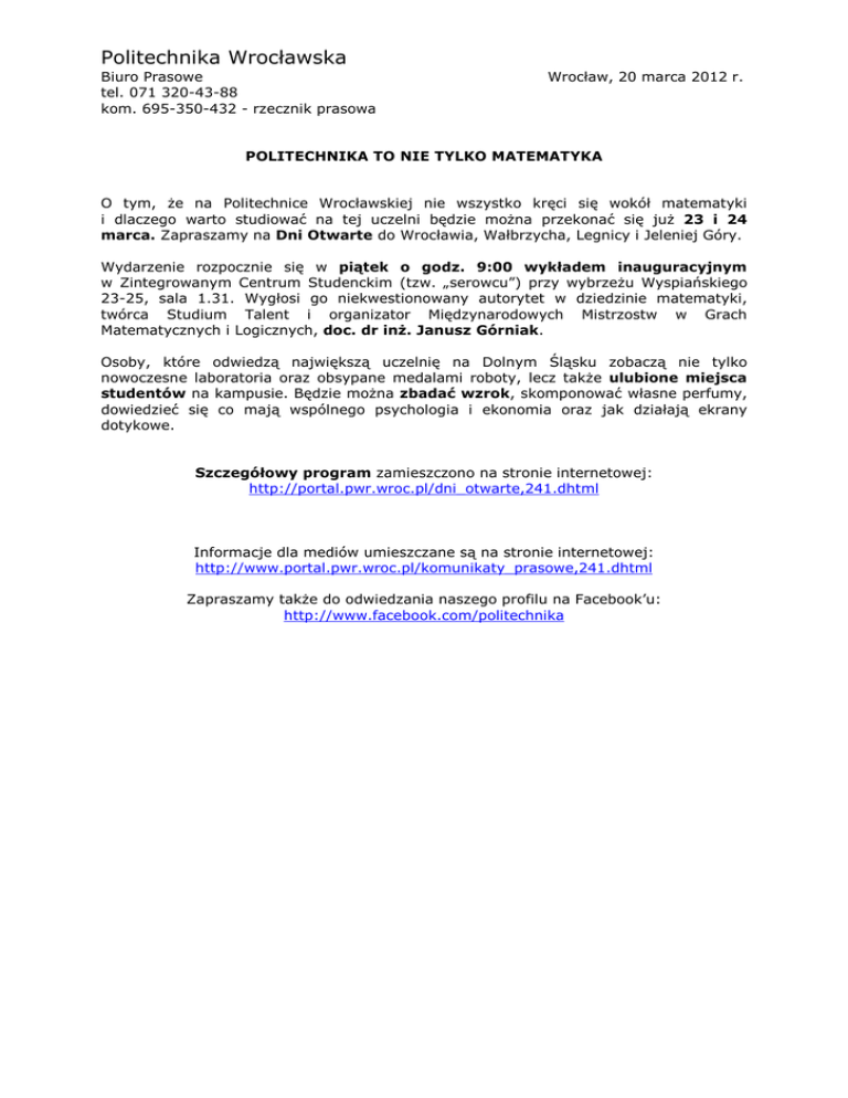 Politechnika Wrocławska Biuro Prasowe tel. 071 320-43-88 kom. 695-350-432 - rzecznik prasowa Wrocław, 20 marca 2012 r. POLITECHNIKA TO NIE TYLKO MATEMATYKA O tym, że na Politechnice Wrocławskiej nie wszystko kręci się wokół matematyki i dlaczego warto studiować na tej uczelni będzie można przekonać się już 23 i 24 marca. Zapraszamy na Dni Otwarte do Wrocławia, Wałbrzycha, Legnicy i Jeleniej Góry. Wydarzenie rozpocznie się w piątek o godz. 9:00 wykładem inauguracyjnym w Zintegrowanym Centrum Studenckim (tzw. „serowcu”) przy wybrzeżu Wyspiańskiego 23-25, sala 1.31. Wygłosi go niekwestionowany autorytet w dziedzinie matematyki, twórca Studium Talent i organizator Międzynarodowych Mistrzostw w Grach Matematycznych i Logicznych, doc. dr inż. Janusz Górniak. Osoby, które odwiedzą największą uczelnię na Dolnym Śląsku zobaczą nie tylko nowoczesne laboratoria oraz obsypane medalami roboty, lecz także ulubione miejsca studentów na kampusie. Będzie można zbadać wzrok, skomponować własne perfumy, dowiedzieć się co mają wspólnego psychologia i ekonomia oraz jak działają ekrany dotykowe. Szczegółowy program zamieszczono na stronie internetowej: http://portal.pwr.wroc.pl/dni_otwarte,241.dhtml Informacje dla mediów umieszczane są na stronie internetowej: http://www.portal.pwr.wroc.pl/komunikaty_prasowe,241.dhtml Zapraszamy także do odwiedzania naszego profilu na Facebook’u: http://www.facebook.com/politechnika