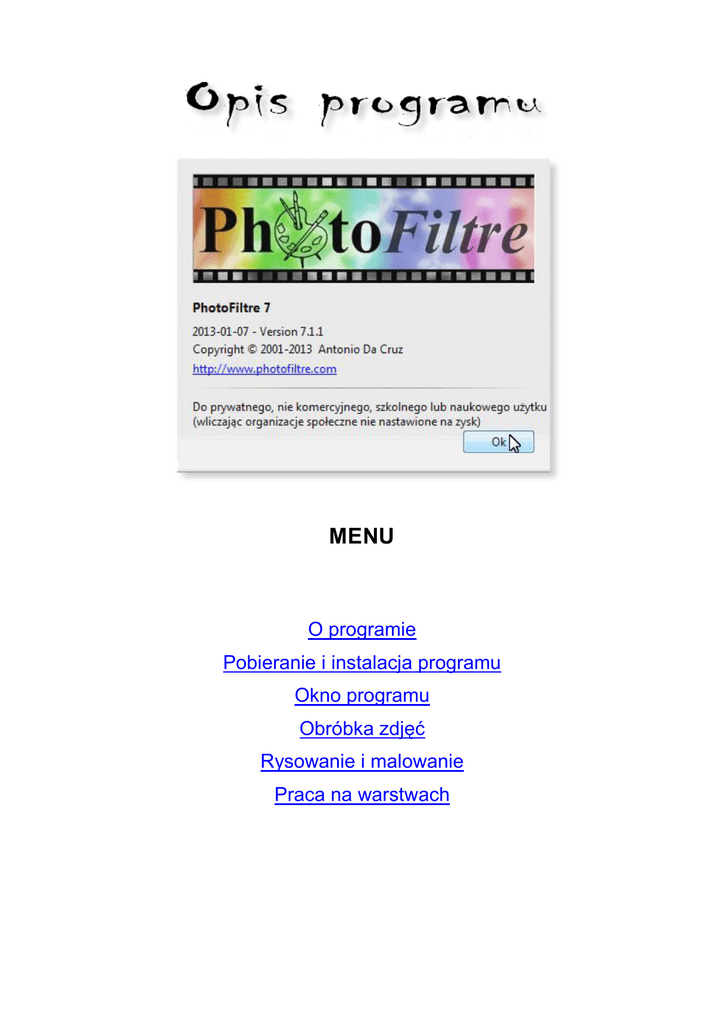 MENU O programie Pobieranie i instalacja programu Okno programu Obróbka zdjęć Rysowanie i malowanie Praca na warstwach O programie PhotoFiltre w wersji 7.1.1 to darmowy program przeznaczony przede wszystkim do korygowania i przetwarzania fotografii, może także służyć do rysowania i malowania. Zgodnie z warunkami licencji można z niego korzystać tylko w celach niezarobkowych. Mamy nadzieję, że polubisz ten program i praca z nim dostarczy ci wiele radości i satysfakcji z uzyskanych efektów. Pobieranie i instalacja programu Pobieranie programu ze strony internetowej Otwórz stronę internetową programu http://www.photofiltre.com. Kliknij na niej odnośnik English. Na kolejnej wyświetlonej stronie kliknij odnośnik wskazany łapką. Jeśli używasz przeglądarki Internet Explorer, to na ekranie powinien się pojawić pasek przedstawiony niżej. Kliknij na nim przycisk Zapisz. Gdy pobieranie się zakończy, wyświetli się poniższy pasek – kliknij przycisk Otwórz folder. Wówczas otworzy się okno folderu Pobrane. Instalacja programu Aby zainstalować program na dysku, musisz mieć uprawnienia administratora. Jeśli je masz, ustaw kursor myszy na pliku pf7-setup-en.exe i kliknij dwukrotnie lewym przyciskiem myszy. Pojawi się pytanie, czy na pewno chcesz uruchomić ten program. Potwierdź chęć uruchomienia instalatora – kliknij przycisk Uruchom. Na podjętą akcję uruchomienia oprogramowania może zareagować program antywirusowy zainstalowany w komputerze. Poniżej pokazujemy okno z komunikatem programu Kaspersky. Trzeba w nim wybrać opcję Tak, ufam. W powitalnym oknie instalatora kliknij przycisk Next > (następny), aby przejść do kolejnego etapu instalacji. W oknie z podanymi warunkami licencji programu zaznacz opcję I accept the terms of the License Agreement i kliknij przycisk Next >. W oknie wyboru miejsca instalacji programu niczego nie zmieniaj i kliknij przyciskNext >. W oknie wyboru folderu w menu Start również niczego nie zmieniaj i kliknij przycisk Next >. W poniższym oknie usuń zaznaczenie z dwóch pól wyboru: Install the Ask Toolbar and make Ask my default searh provider i Make Ask.com my browser home page and new tabs page. Kliknij przycisk Next >. Jeśli nie chcesz, aby na pulpicie powstał skrót do program PhotoFiltre, usuń zaznaczenie w polu wyboru Create a desktop icon for PhotoFiltre. Kliknij przycisk Install. Poczekaj aż zielony pasek postępu instalacji przesunie się do końca pola. Gdy przycisk Next > stanie się aktywny – kliknij go. W ostatnim oknie instalatora pojawi się komunikat, że program został zainstalowany na twoim komputerze. Jeśli nie usuniesz zaznaczenia w polu Run PhotoFiltre 7, to po kliknięciu przycisku Finish proces instalacji się zakończy i program zostanie uruchomiony. Poniżej pokazujemy fragment okna nowo zainstalowanego programu. Jest to wersja w języku angielskim. Pobieranie pliku z polskojęzyczną obsługą programu PhotoFiltre 7 Otwórz stronę internetową programu http://www.photofiltre.com i kliknij na niej odnośnik . Na wyświetlonej stronie kliknij odnośnik Download (pobierz). . Na kolejnej stronie wybierz pozycję Polish / Polski / Polonais. Aby zapisać plik StudioPL.zip, zawierający polską wersję obsługi programu, kliknij przycisk Zapisz w okienku wyświetlonym na dole ekranu. Po zakończeniu pobierania tego pliku pojawi się kolejne okienko. Kliknij w nim przycisk Otwórz folder. W oknie folderu Pobrane odszukaj plik StudioPL.zip i kliknij go dwukrotnie. W oknie … > Pobrane > StudioPl.zip kliknij prawym przyciskiem myszy plik StudioPL.plg i z menu podręcznego wybierz polecenie Kopiuj. Aby usunąć angielską wersję obsługi programu z dysku, wykonaj następujące czynności: Naciśnij systemowy przycisk Start i w menu Start kliknij przycisk . W wyświetlonym oknie Komputer wybierz dysk C:, a dalej folder Program Files > PhotoFiltre 7. W oknie tego folderu odszukaj plik StudioEN.plg (wersja angielska), kliknij jego nazwę prawym przyciskiem myszy i z menu podręcznego wybierz polecenie Usuń. A teraz umieść w tym folderze plik zapewniający obsługę programu w języku polskim. W oknie folderu Program Files > PhotoFiltre 7 kliknij prawym przyciskiem myszy i z menu podręcznego wybierz polecenie Wklej. Po uruchomieniu programu zobaczysz okno z polskimi napisami. Okno programu 1. Pasek nazwy programu 2. Pasek menu 3. Pasek narzędzi podstawowych 4. Pasek filtrów 5. Okna robocze 6. Przybornik narzędzi 7. Przyciski dostępu folderów roboczych 8. Obszar podglądu zawartości folderów roboczych 9. Pasek stanu programu Obróbka zdjęć Korekcja podstawowych parametrów zdjęcia 1. Funkcje przycisków paska filtrów Jasność (-) Obraz oryginalny Obraz przyciemniony Jasność (+) Obraz oryginalny Obraz rozjaśniony Kontrast (-) Obraz oryginalny Obraz o zmniejszonym kontraście Kontrast (+) Obraz oryginalny Obraz o zwiększonym kontraście Korekcja gamma (-) W dużym uproszczeniu można powiedzieć, że korekcja gamma nie wpływa na zmianę czarnych i białych fragmentów obrazu, działa jedynie na tony pośrednie. Zmniejszanie wartości tego współczynnika powoduje ich przyciemnianie. Obraz oryginalny Obraz o przyciemnionej tonacji Korekcja gamma (+) Podczas zwiększania wartości tego współczynnika tony pośrednie są rozświetlane. Obraz oryginalny Obraz o rozjaśnionej tonacji Nasycenie (-) Obraz oryginalny Obraz o zmniejszonym nasyceniu barw Nasycenie (+) Obraz oryginalny Obraz o zwiększonym nasyceniu barw Histogram Kliknięcie tego przycisku otwiera okno Histogram, w którym można wprowadzać zmiany bardzo zaawansowanych parametrów obrazu. Nie będziemy ich tutaj omawiać, ze względu na duży stopień trudności i wymaganie od użytkownika bardzo dobrej znajomości zagadnień związanych z przetwarzaniem grafiki komputerowej. Możesz jednak poeksperymentować – sprawdź, jak działa to narzędzie, stosując metodę prób i błędów. Obraz oryginalny Obraz w trakcie 