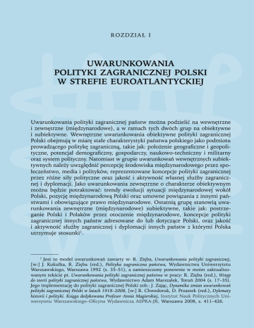 ROZD ZIAŁ I UWARUNKOWANIA POLITYKI ZAGRANICZNEJ POLSKI W STREFIE EUROATLANTYCKIEJ Uwarunkowania polityki zagranicznej państw można podzielić na wewnętrzne i zewnętrzne (międzynarodowe), a w ramach tych dwóch grup na obiektywne i subiektywne. Wewnętrzne uwarunkowania obiektywne polityki zagranicznej Polski obejmują w miarę stałe charakterystyki państwa polskiego jako podmiotu prowadzącego politykę zagraniczną, takie jak: położenie geograficzne i geopolityczne, potencjał demograficzny, gospodarczy, naukowo-techniczny i militarny oraz system polityczny. Natomiast w grupie uwarunkowań wewnętrznych subiektywnych należy uwzględnić percepcję środowiska międzynarodowego przez społeczeństwo, media i polityków, reprezentowane koncepcje polityki zagranicznej przez różne siły polityczne oraz jakość i aktywność własnej służby zagranicznej i dyplomacji. Jako uwarunkowania zewnętrzne o charakterze obiektywnym można będzie potraktować: trendy ewolucji sytuacji międzynarodowej wokół Polski, pozycję międzynarodową Polski oraz umowne powiązania z innymi państwami i obowiązujące prawo międzynarodowe. Ostatnią grupę stanowią uwarunkowania zewnętrzne (międzynarodowe) subiektywne, takie jak: postrzeganie Polski i Polaków przez otoczenie międzynarodowe, koncepcje polityki zagranicznej innych państw adresowane do lub dotyczące Polski, oraz jakość i aktywność służby zagranicznej i dyplomacji innych państw z którymi Polska utrzymuje stosunki1. Jest to model uwarunkowań zawarty w: R. Zięba, Uwarunkowania polityki zagranicznej, [w:] J. Kukułka, R. Zięba (red.), Polityka zagraniczna państwa, Wydawnictwa Uniwersytetu Warszawskiego, Warszawa 1992 (s. 35–51), a zamieszczony ponownie w moim zaktualizowanym tekście pt. Uwarunkowania polityki zagranicznej państwa w pracy: R. Zięba (red.), Wstęp do teorii polityki zagranicznej państwa, Wydawnictwo Adam Marszałek, Toruń 2004 (s. 17–35). Jego implementację do polityki zagranicznej Polski zob.: J. Zając, Dynamika zmian uwarunkowań polityki zagranicznej Polski w latach 1918–2008, [w:] R. Chwedoruk, D. Przastek (red.), Dylematy historii i polityki. Księga dedykowana Profesor Annie Magierskiej, Instytut Nauk Politycznych Uniwersytetu Warszawskiego–Oficyna Wydawnicza ASPRA-JR, Warszawa 2008, s. 411–426. 1 16 I. Uwarunkowania polityki zagranicznej Polski w strefie euroatlantyckiej 1. Uwarunkowania wewnętrzne obiektywne 1.1. Środowisko geograficzne i położenie geopolityczne Od połowy XVIII wieku, kiedy upowszechniło się dzieło Monteskiusza O duchu praw (z 1748 r.), badacze zwracają uwagę na znaczenie czynnika geograficznego dla polityki państw, w tym dla polityki zagranicznej2. Istotnymi dla Polski elementami środowiska geograficznego są: położenie w środku Europy, stosunkowo duża zasobność w surowce naturalne i w większości naturalny charakter granic państwowych. Położenie geograficzne jest atutem zwiększającym szanse odgrywania roli kraju tranzytowego, pomostowego dla rozwijania transportu na linii Wschód–Zachód. Już na początku lat 90. XX wieku naukowcy (ekonomiści) i politycy przewidywali możliwości budowy przez nasz kraj linii transportu kolejowego i drogowego łączących Europę Zachodnią z Europą Wschodnią, a nawet Południową z Północno-Wschodnią. Polska powinna być zainteresowana realizacją takich projektów, gdyż przysporzyłoby to dużych korzyści ekonomicznych, przyspieszyłoby realizację programu budowy autostrad i szybkich połączeń kolejowych, a także zwiększałoby atrakcyjność Polski jako kraju pomostu, czy „korytarza transportowego”. Realizacja tego drugiego zadania umożliwiłaby przyspieszenie urzeczywistnienia postulatu „tiry na tory”, głoszonego w Polsce przez organizacje ekologiczne, zrzeszenia obywatelskie i drogowców, a realizowanego już w innych krajach (np. w Holandii, Austrii, Francji, Szwajcarii, Republice Czeskiej). Ważnym atutem środowiska geograficznego Polski jest stosunkowo duża zasobność w surowce energetyczne. Ponieważ niektóre środowiska polityczne są wysoce zaniepokojone stanem bezpieczeństwa energetycznego, dlatego należałoby zintensyfikować wysiłki nie na poszukiwaniu alternatywnych dostawców ropy naftowej i gazu ziemnego (bo te nie przyniosły dotychczas żadnych wymiernych rezultatów), lecz na pozyskiwaniu energii z własnych zasobów. Takie możliwości istnieją w postaci gazyfikacji węgla kamiennego. Można byłoby powrócić do podejmowanej jeszcze w latach 70. poprzedniego stulecia idei gazyfikacji węgla. W tym celu potrzebne są nowoczesne technologie. Polityka zagraniczna państwa powinna pomóc w zainteresowaniu tym rozwiązaniem i w poszukiwaniu zagranicznych inwestorów. Drugim atutem surowcowym – jak wynika ze wstępnych badań geologicznych – mogą okazać się zasoby gazu z łupków skalnych. Według różnych szacunków podawanych przez media, zasoby tego gazu mogą okazać się bardzo duże (od 1,36 bln m3 do nawet 5,3 bln m3). Należy założyć, że te przewidywania są mocno przesadzone, podobnie jak opinie, że po ich potwierdzeniu 2 J. Frankel, The Making of Foreign Policy: An Analysis of Decision-Making, Oxford University Press, London 1963, s. 57–61; M. Merle, Sociologie des relations internationales, Dalloz, Paris 1974, s. 149–158; H.J. Morgenthau, Politics among Nations: The Struggle for Power and Peace, brief edition, McGraw-Hill, Boston 1993, s. 124–133. 1. Uwarunkowania wewnętrzne obiektywne 17 nastąpiłby wzrost całości zasobów gazu ziemnego w Europie o 47%, a rosyjski Gazprom zyskałby potężną konkurencję. Jednak należy poważnie zainteresować się szansą pozyskania nowych źródeł gazu, nawet jeśli jej prawdopodobieństwo jest 50 na 50%. Przemysłowe wydobycie gazu łupkowego może okazać się istotnym uzupełnieniem dla gazu „klasycznego”. Mimo że perspektywa rozpoczęcia wydobycia gazu z łupków skalnyc