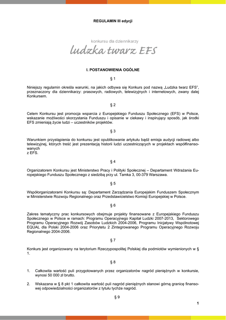 REGULAMIN III edycji I. POSTANOWIENIA OGÓLNE §1 Niniejszy regulamin określa warunki, na jakich odbywa się Konkurs pod nazwą „Ludzka twarz EFS”, przeznaczony dla dziennikarzy: prasowych, radiowych, telewizyjnych i internetowych, zwany dalej Konkursem. §2 Celem Konkursu jest promocja wsparcia z Europejskiego Funduszu Społecznego (EFS) w Polsce, wskazanie możliwości skorzystania Funduszu i opisanie w ciekawy i inspirujący sposób, jak środki EFS zmieniają życie ludzi – uczestników projektów. §3 Warunkiem przystąpienia do konkursu jest opublikowanie artykułu bądź emisja audycji radiowej albo telewizyjnej, których treść jest prezentacją historii ludzi uczestniczących w projektach współfinansowanych z EFS. §4 Organizatorem Konkursu jest Ministerstwo Pracy i Polityki Społecznej – Departament Wdrażania Europejskiego Funduszu Społecznego z siedzibą przy ul. Tamka 3, 00-379 Warszawa. §5 Współorganizatorami Konkursu są: Departament Zarządzania Europejskim Funduszem Społecznym w Ministerstwie Rozwoju Regionalnego oraz Przedstawicielstwo Komisji Europejskiej w Polsce. §6 Zakres tematyczny prac konkursowych obejmuje projekty finansowane z Europejskiego Funduszu Społecznego w Polsce w ramach: Programu Operacyjnego Kapitał Ludzki 2007-2013, Sektorowego Programu Operacyjnego Rozwój Zasobów Ludzkich 2004-2006, Programu Inicjatywy Wspólnotowej EQUAL dla Polski 2004-2006 oraz Priorytetu 2 Zintegrowanego Programu Operacyjnego Rozwoju Regionalnego 2004-2006. §7 Konkurs jest organizowany na terytorium Rzeczypospolitej Polskiej dla podmiotów wymienionych w § 1. §8 1. Całkowita wartość puli przygotowanych przez organizatorów nagród pieniężnych w konkursie, wynosi 50 000 zł brutto. 2. Wskazana w § 8 pkt 1 całkowita wartość puli nagród pieniężnych stanowi górną granicę finansowej odpowiedzialności organizatorów z tytułu tychże nagród. §9 1 Konkurs jest współfinansowany ze środków Europejskiego Funduszu Społecznego w ramach Pomocy Technicznej Programu Operacyjnego Kapitał Ludzki 2007-2013. II. WARUNKI KONKURSU § 10 1. Uczestnik Konkursu zobowiązany jest do przesłania do dnia 16 października 2009 r. na adres: Departament Wdrażania Europejskiego Funduszu Społecznego, Ministerstwo Pracy i Polityki Społecznej, ul. Tamka 3, 00-379 Warszawa, z dopiskiem „Ludzka twarz EFS”, następujących materiałów: a) formularza zgłoszenia uczestnictwa w Konkursie, który jest dostępny w formie elektronicznej na stronie internetowej Konkursu www.ludzkatwarzEFS.pl. Formularz zgłoszeniowy stanowi załącznik do niniejszego Regulaminu; b) pracy w formie artykułu prasowego, audycji radiowej lub filmu; c) oświadczenia uczestnika Konkursu lub zgłaszającej go redakcji o udostępnieniu autorskich praw majątkowych do prac zgłoszonych w Konkursie; 2. Zgłoszenie powinno zawierać: a) w przypadku artykułów prasowych – treść artykułu w wersji elektronicznej w formacie tekstowym .doc lub .pdf, a także egzemplarz numeru pisma, w którym został opublikowany artykuł; b) w przypadku nagrań radiowych, w tym nagrań wyemitowanych za pośrednictwem Internetu – wersję elektroniczną na nośniku CD lub DVD w jednym z formatów: .mp3, .wma, .wave; c) w przypadku nagrań audiowizualnych, w tym nagrań wyemitowanych za pośrednictwem Internetu – wersję elektroniczną na nośniku CD lub DVD w formacie .vob i .avi; d) w przypadku publikacji internetowych – wydruku publikacji jako widoku strony internetowej i treści publikacji w formacie .pdf. 3. Wszystkie prace muszą być opublikowane lub wyemitowane w mediach w okresie od 1 października 2008 r. do 16 października 2009 r. 4. Do konkursu mogą być zgłoszone wyłącznie artykuły, audycje bądź filmy opublikowane lub wyemitowane w języku polskim, które nie zostały dofinansowane ze środków Unii Europejskiej. 5. 6. Termin uważa się za dotrzymany, jeżeli przesyłka zawierająca pracę oraz wszystkie wymagane dokumenty wymienione w § 8 pkt 1 zostanie dostarczona na adres: Departament Wdrażania Europejskiego Funduszu Społecznego, Ministerstwo Pracy i Polityki Społecznej, ul. Tamka 3, 00379 Warszawa, z dopiskiem „Ludzka twarz EFS” do dnia 16 października 2009 roku do godz. 16.15. (decyduje data wpływu na adres Organizatora Konkursu). Wszelkie zgłoszenia dokonane po 16 października 2009 r. nie będą rozpatrywane. Ta sama praca może być zgłoszona w tylko jednej kategorii. 7. Każdy uczestnik Konkursu może wziąć udział w trzech kategoriach: „Pióro”, „Mikrofon”, „Ekran”. 8. Uczestnik Konkursu lub przedstawiciel redakcji zgłaszającej dziennikarza, składając swój podpis na formularzu zgłoszenia, oświadcza, że posiada autorskie prawa majątkowe do przekazanych materiałów i wyraża zgodę na nieodpłatne publikowanie, rozpowszechnianie oraz dokonywanie niezbędnych opracowań, skrótów oraz innych modyfikacji wobec nadesłanych prac konkursowych, które Organizator oraz Współorganizatorzy uznają za stosowne i wskazane dla prawidłowej realizacji założeń i promocji Konkursu. Jednocześnie uczestnik Konkursu upoważnia Organizatora i Współorganizatorów do prezentacji nadesłanych prac w nieograniczonym zakresie i terminie. 9. Nadesłanie pracy jest potwierdzeniem akceptacji niniejszego Regulaminu. 2 10. Organizator oraz współorganizatorzy Konkursu nie ponoszą odpowiedzialności za ewentualne roszczenia osób trzecich wynikające z naruszenia praw własności intelektualnej, w tym za nieprzestrzeganie przepisów ustawy z dnia 4 lutego 1994 r. o prawie autorskim i prawach pokrewnych (Dz. U. z 2006 r. Nr 90, poz. 631,,z późn. zm.). 11. Uczestnik Konkursu wyraża zgodę na przetwarzanie i udostępnianie danych osobowych: Imię i nazwisko oraz adres zamieszkania (siedziby), zgodnie z ustawą z dnia 29 sierpnia 1997 roku o ochronie danych osobowych (Dz. U. Z 2002 r. Nr 101, poz. 926 z późn. zm.) 12. Organizator nie jest zobowiązany do z