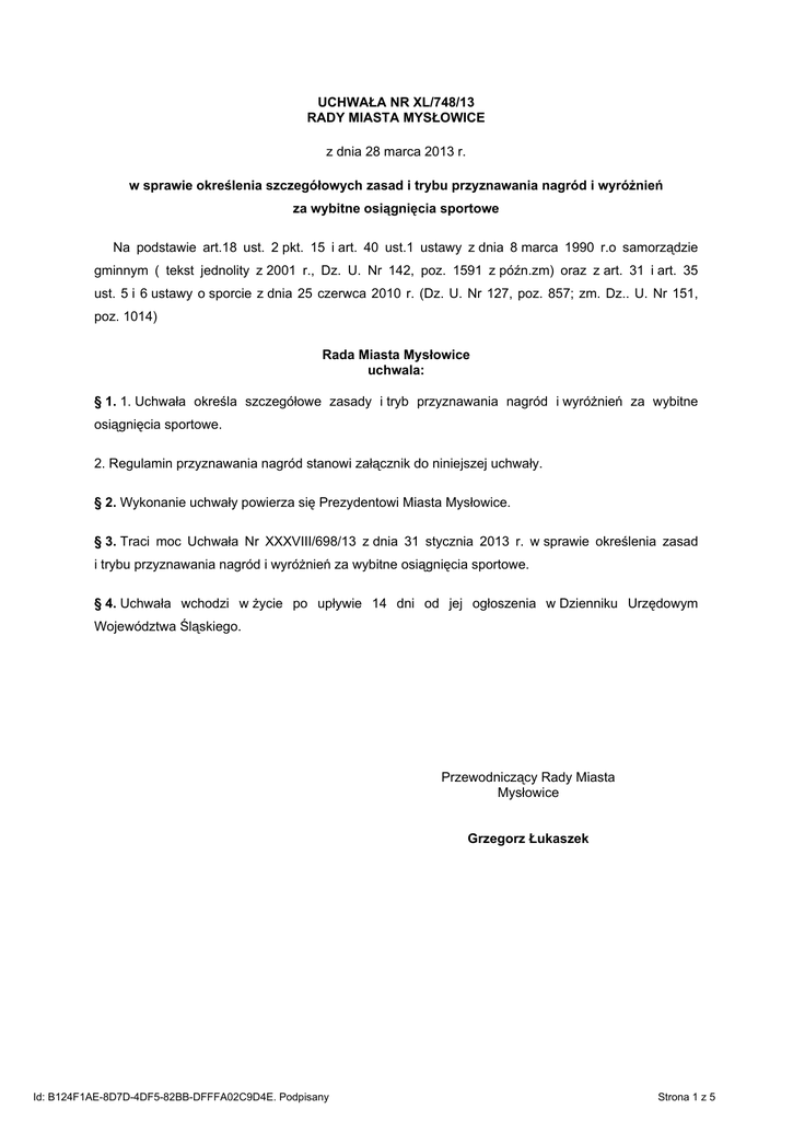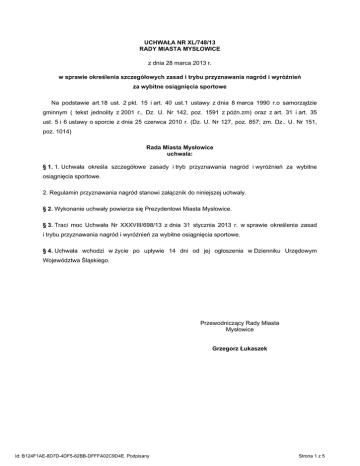UCHWAŁA NR XL/748/13 RADY MIASTA MYSŁOWICE z dnia 28 marca 2013 r. w sprawie określenia szczegółowych zasad i trybu przyznawania nagród i wyróżnień za wybitne osiągnięcia sportowe Na podstawie art.18 ust. 2 pkt. 15 i art. 40 ust.1 ustawy z dnia 8 marca 1990 r.o samorządzie gminnym ( tekst jednolity z 2001 r., Dz. U. Nr 142, poz. 1591 z późn.zm) oraz z art. 31 i art. 35 ust. 5 i 6 ustawy o sporcie z dnia 25 czerwca 2010 r. (Dz. U. Nr 127, poz. 857; zm. Dz.. U. Nr 151, poz. 1014) Rada Miasta Mysłowice uchwala: § 1. 1. Uchwała określa szczegółowe zasady i tryb przyznawania nagród i wyróżnień za wybitne osiągnięcia sportowe. 2. Regulamin przyznawania nagród stanowi załącznik do niniejszej uchwały. § 2. Wykonanie uchwały powierza się Prezydentowi Miasta Mysłowice. § 3. Traci moc Uchwała Nr XXXVIII/698/13 z dnia 31 stycznia 2013 r. w sprawie określenia zasad i trybu przyznawania nagród i wyróżnień za wybitne osiągnięcia sportowe. § 4. Uchwała wchodzi w życie po upływie 14 dni od jej ogłoszenia w Dzienniku Urzędowym Województwa Śląskiego. Przewodniczący Rady Miasta Mysłowice Grzegorz Łukaszek Id: B124F1AE-8D7D-4DF5-82BB-DFFFA02C9D4E. Podpisany Strona 1 z 5 Załącznik do Uchwały Nr XL/748/13 Rady Miasta Mysłowice z dnia 28 marca 2013 r. Regulamin przyznawania nagród i wyróżnień za wybitne osiągnięcia sportowe: § 1. 1. Nagrody i wyróżnienia przyznaje Prezydent Miasta Mysłowice. 2. Nagroda lub wyróżnienie może zostać przyznana: 1) osobie fizycznej za osiągnięte wysokie wyniki sportowe w sportach indywidualnych i drużynowych we współzawodnictwie krajowym lub międzynarodowym; 2) drużynie za osiągnięte wysokie wyniki we współzawodnictwie krajowym lub międzynarodowym; 3) trenerom zasłużonym w osiąganiu wysokich wyników sportowych przez sportowców we współzawodnictwie krajowym lub międzynarodowym. 3. Za dyscypliny sportowe ważne dla Miasta Mysłowice uznaje się : 1) koszykówkę; 2) lekkoatletykę; 3) pływanie; 4) piłkę nożną; 5) piłkę ręczną; 6) siatkówkę; 7) siatkówkę plażową; 8) sporty walki; 9) tenis stołowy. 4. Za wysokie wyniki sportowe uznaje się: 1) w sportach olimpijskich: a) w grach zespołowych - piłka nożna, piłka ręczna, koszykówka, siatkówka - zajęcie I, II, III miejsca w ekstraklasie i I lidze krajowej, I miejsce w II lidze krajowej; b) w sportach indywidualnych - tenis stołowy, lekkoatletyka, sporty walki, pływanie - zajęcie miejsca: Id: B124F1AE-8D7D-4DF5-82BB-DFFFA02C9D4E. Podpisany Strona 2 z 5 - od I do VI miejsca w Mistrzostwach Polski: kadetów, juniorów, seniorów, c) w dyscyplinach indywidualnych biorących udział w rywalizacji ligowej, zajęcie I, II, III miejsca w rozgrywkach ekstraklasy lub I , II ligi ogólnokrajowej, 2) w dyscyplinach nieolimpijskich: wybitne osiągnięcia na arenie międzynarodowej i zajęcie miejsc: a) od I do III miejsca w Mistrzostwach Europy i Świata: kadetów, juniorów, seniorów w jednej federacji dla danej dyscypliny; b) I miejsca w Mistrzostwach Polski: kadetów, juniorów, seniorów. 5. Wyróżnienia dla sportowców , o których mowa w ust.2 mogą być przyznawane zawodnikom, którym nie została przyznana nagroda za wyniki sportowe określone w ust.4. 6. Nagrody i wyróżnienia mogą być przyznawane trenerom, którzy przyczynili się do zdobycia mistrzów Polski, Europy, Świata w danej dyscyplinie sportowej. 7. W szczególnie uzasadnionym przypadku nagrodę lub wyróżnienie można przyznać trenerowi za inne osiągnięcia, niż określone w ust.6, w szczególności za: 1) propagowanie i popularyzowanie różnorodnych form aktywności fizycznej wśród mieszkańców Mysłowic; 2) upowszechnianie i rozwój sportu szkolnego; 3) wieloletnią działalność i osiągnięcia w pracy szkoleniowej; 4) aktywną działalność na rzecz klubów sportowych i innych podmiotów działających w zakresie sportu w celu tworzenia jak najlepszych warunków szkoleniowych; 5) wspieranie działalności klubów sportowych i innych podmiotów działających z zakresie kultury fizycznej; 6) organizację imprez sportowo-rekreacyjnych skierowanych do mieszkańców miasta Mysłowice oraz zawodów sportowych o zasięgu krajowym i międzynarodowym. § 2. O nagrodę lub wyróżnienie mogą się ubiegać: 1) sportowcy i trenerzy zamieszkujący w Mysłowicach i reprezentujący mysłowickie kluby sportowe; 2) sportowcy i trenerzy zamieszkujący na terenie Miasta Mysłowice będący członkami zrzeszonymi w klubach sportowych spoza Miasta Mysłowice. § 3. 1. Nagroda lub wyróżnienie może być przyznana w formie pieniężnej lub rzeczowej a wyróżnienie wyłącznie w formie rzeczowej. Id: B124F1AE-8D7D-4DF5-82BB-DFFFA02C9D4E. Podpisany Strona 3 z 5 2. Nagroda pieniężna przyznana jest jednorazowo w następującej wysokości: 1) od 200-zł do 5.000-zł dla sportowców określonych w § 1 ust.2 pkt. 1,2 . 2) od 200-zł do 3.000-zł dla trenera, 3) od 1.000-zł do 10.000-zł dla drużyny. 3. Wartość nagrody rzeczowej nie może przekraczać 1000 zł. 4. Wyróżnienia, dla zawodników za wysokie wyniki sportowe i trenerów prowadzących szkolenie zawodników osiągających wysokie wyniki sportowe oraz dla trenerów i innych osób wyróżniających się osiągnięciami w działalności sportowej, mogą być przyznawane w formie pucharów, statuetek lub książek wraz z listem gratulacyjnym. 5. Wysokość środków na nagrody określa się każdorazowo w corocznej uchwale budżetowej Miasta Mysłowice. 6. Nagrody i wyróżnienia wręczane są jednorazowo. Wręczenie nagród odbywa się uroczyście w dniu i miejscu wyznaczonym przez Prezydenta Miasta Mysłowice. 7. Przyznane nagrody pieniężne przekazywane są przelewem na rachunek bankowy zawodnika lub nagrodzonego. § 4. Nagroda lub wyróżnienie może zostać przyznana na wniosek: 1) stowarzyszeń i klubów sportowych; 2) właściwej Komisji Rady Miasta Mysłowice; 3) Prezydenta Miasta Mysłowice; 4) za