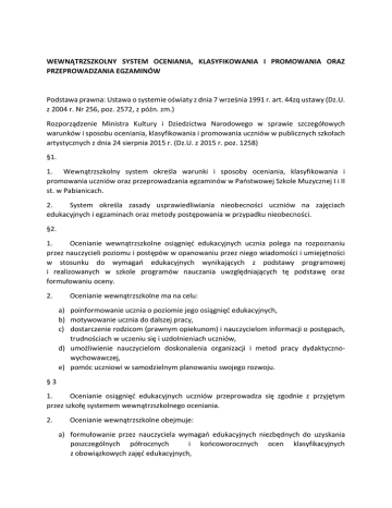 WEWNĄTRZSZKOLNY SYSTEM OCENIANIA, KLASYFIKOWANIA I PROMOWANIA ORAZ PRZEPROWADZANIA EGZAMINÓW Podstawa prawna: Ustawa o systemie oświaty z dnia 7 września 1991 r. art. 44zq ustawy (Dz.U. z 2004 r. Nr 256, poz. 2572, z późn. zm.) Rozporządzenie Ministra Kultury i Dziedzictwa Narodowego w sprawie szczegółowych warunków i sposobu oceniania, klasyfikowania i promowania uczniów w publicznych szkołach artystycznych z dnia 24 sierpnia 2015 r. (Dz.U. z 2015 r. poz. 1258) §1. 1. Wewnątrzszkolny system określa warunki i sposoby oceniania, klasyfikowania i promowania uczniów oraz przeprowadzania egzaminów w Państwowej Szkole Muzycznej I i II st. w Pabianicach. 2. System określa zasady usprawiedliwiania nieobecności uczniów na zajęciach edukacyjnych i egzaminach oraz metody postępowania w przypadku nieobecności. §2. 1. Ocenianie wewnątrzszkolne osiągnięć edukacyjnych ucznia polega na rozpoznaniu przez nauczycieli poziomu i postępów w opanowaniu przez niego wiadomości i umiejętności w stosunku do wymagań edukacyjnych wynikających z podstawy programowej i realizowanych w szkole programów nauczania uwzględniających tę podstawę oraz formułowaniu oceny. 2. Ocenianie wewnątrzszkolne ma na celu: a) poinformowanie ucznia o poziomie jego osiągnięć edukacyjnych, b) motywowanie ucznia do dalszej pracy, c) dostarczenie rodzicom (prawnym opiekunom) i nauczycielom informacji o postępach, trudnościach w uczeniu się i uzdolnieniach uczniów, d) umożliwienie nauczycielom doskonalenia organizacji i metod pracy dydaktycznowychowawczej, e) pomóc uczniowi w samodzielnym planowaniu swojego rozwoju. §3 1. Ocenianie osiągnięć edukacyjnych uczniów przeprowadza się zgodnie z przyjętym przez szkołę systemem wewnątrzszkolnego oceniania. 2. Ocenianie wewnątrzszkolne obejmuje: a) formułowanie przez nauczyciela wymagań edukacyjnych niezbędnych do uzyskania poszczególnych półrocznych i końcoworocznych ocen klasyfikacyjnych z obowiązkowych zajęć edukacyjnych, b) bieżące ocenianie i półroczne klasyfikowanie według skali i w formach przyjętych w szkole, c) ustalanie ocen klasyfikacyjnych końcoworocznych z obowiązkowych i zajęć edukacyjnych, d) przeprowadzanie egzaminów klasyfikacyjnych, promocyjnych i poprawkowych, e) ustalanie warunków i trybu uzyskania wyższych niż przewidywane końcoworocznych ocen klasyfikacyjnych z obowiązkowych zajęć edukacyjnych, f) ustalenie innych form prezentacji umiejętności uczniów, g) Ustalanie warunków i sposobu przekazywania rodzicom informacji o postępach i trudnościach w nauce i zachowaniu ucznia oraz o szczególnych uzdolnieniach ucznia (Art. 44b p. 7 Ust. o systemie oświaty) §4 1. Nauczyciele na początku każdego roku szkolnego informują uczniów oraz rodziców (prawnych opiekunów) o: a) wymaganiach edukacyjnych niezbędnych do uzyskania poszczególnych śródrocznych i końcoworocznych ocen klasyfikacyjnych z obowiązkowych i nadobowiązkowych zajęć edukacyjnych wynikających z realizowanego przez siebie programu nauczania, b) sposobach sprawdzania osiągnięć edukacyjnych ucznia, c) sposobach informowania rodziców (opiekunów) ucznia o osiąganych wynikach, d) warunkach i trybie uzyskania wyższej niż przewidywana końcoworocznej oceny klasyfikacyjnej z obowiązkowych zajęć edukacyjnych, e) braku możliwości podwyższania oceny uzyskanej w trybie egzaminu komisyjnego. 2. W każdym roku szkolnym w ciągu pierwszego miesiąca pracy, nauczyciele prowadzący poszczególne zajęcia edukacyjne podają informacje o wymaganiach edukacyjnych dotyczących: a) b) c) d) e) materiału nauczania, systemu oceniania, organizacji procesu dydaktycznego, planowanych egzaminów, przesłuchań, popisów, sprawdzianów czy konkursów, sposobów współpracy nauczyciela z rodzicami (prawnymi opiekunami) ucznia. 3. Nauczyciel jest obowiązany, na podstawie opinii publicznej poradni psychologicznopedagogicznej, w tym publicznej poradni specjalistycznej, albo niepublicznej poradni psychologiczno-pedagogicznej w tym niepublicznej poradni specjalistycznej, o której mowa w art. 71b ust. 3b ustawy z dnia 7 września 1991 r. o systemie oświaty, dostosować wymagania edukacyjne, o których mowa w ust. 1a do indywidualnych potrzeb ucznia, u którego stwierdzono zaburzenia i odchylenia rozwojowe lub specyficzne trudności w uczeniu się, uniemożliwiające sprostaniu tym wymaganiom. 4. W przypadku trudności ucznia w przyswajaniu sobie wiadomości i umiejętności wymaganych programem nauczania, nauczyciel jest zobowiązany poinformować rodziców (prawnych opiekunów) o zaistniałym problemie i propozycji działań zaradczych; zaleca się formę pisemną § 5. 1. Oceny są jawne zarówno dla ucznia jak i jego rodziców (prawnych opiekunów). 2. Wszystkie oceny ucznia powinny być uwidocznione w dzienniku lekcyjnym, w tym: a) z ogólnomuzycznych zajęć edukacyjnych oceny cząstkowe winny być wyrażone w stopniach w skali 1 - 6, b) z indywidualnych zajęć edukacyjnych comiesięczna ocena za postępy w nauce winna być wyrażona w skali 1 - 6. 3. Na wniosek ucznia lub jego rodziców (prawnych opiekunów) nauczyciel uzasadnia ustaloną ocenę. 4. Na wniosek ucznia lub jego rodziców (prawnych opiekunów) sprawdzone i ocenione pisemne prace kontrolne ucznia są udostępniane uczniowi lub jego rodzicom (prawnym opiekunom). § 6. 1. W uzasadnionych przypadkach uczeń może być zwolniony na czas określony z zajęć chóru 2. Dyrektor szkoły zwalnia ucznia z zajęć chóru na podstawie opinii o ograniczonych możliwościach uczestniczenia w tych zajęciach, wydanej przez lekarza, na czas określony w tej opinii. 3. W przypadku zwolnienia ucznia z części zajęć edukacyjnych w dokumentacji przebiegu nauczania zamiast oceny klasyfikacyjnej wpisuje się "zwolniony" albo „zwolniona”. 4. Dyrektor szkoły artystycznej, na wniosek rodziców albo pełnoletniego ucznia, może zwolnić ucznia z realizacji obowiązkowych zajęć 