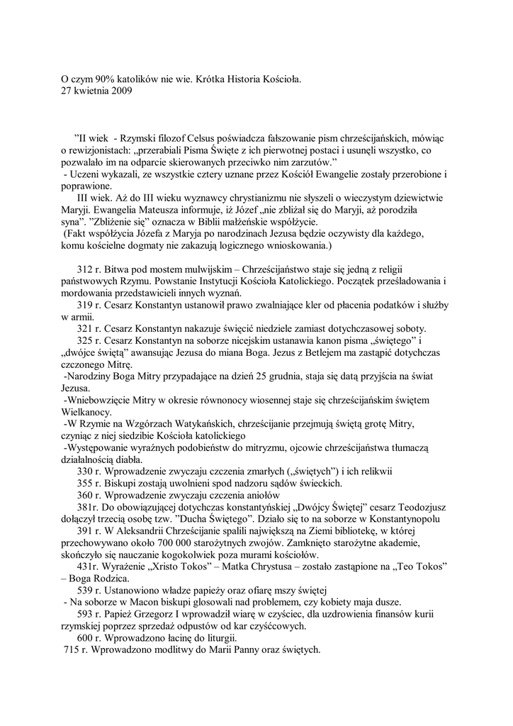 O czym 90% katolików nie wie. Krótka Historia Kościoła. 27 kwietnia 2009 ”II wiek - Rzymski filozof Celsus poświadcza fałszowanie pism chrześcijańskich, mówiąc o rewizjonistach: „przerabiali Pisma Święte z ich pierwotnej postaci i usunęli wszystko, co pozwalało im na odparcie skierowanych przeciwko nim zarzutów.” - Uczeni wykazali, ze wszystkie cztery uznane przez Kościół Ewangelie zostały przerobione i poprawione. III wiek. Aż do III wieku wyznawcy chrystianizmu nie słyszeli o wieczystym dziewictwie Maryji. Ewangelia Mateusza informuje, iż Józef „nie zbliżał się do Maryji, aż porodziła syna”. ”Zbliżenie się” oznacza w Biblii małżeńskie współżycie. (Fakt współżycia Józefa z Maryja po narodzinach Jezusa będzie oczywisty dla każdego, komu kościelne dogmaty nie zakazują logicznego wnioskowania.) 312 r. Bitwa pod mostem mulwijskim – Chrześcijaństwo staje się jedną z religii państwowych Rzymu. Powstanie Instytucji Kościoła Katolickiego. Początek prześladowania i mordowania przedstawicieli innych wyznań. 319 r. Cesarz Konstantyn ustanowił prawo zwalniające kler od płacenia podatków i służby w armii. 321 r. Cesarz Konstantyn nakazuje święcić niedziele zamiast dotychczasowej soboty. 325 r. Cesarz Konstantyn na soborze nicejskim ustanawia kanon pisma „świętego” i „dwójce świętą” awansując Jezusa do miana Boga. Jezus z Betlejem ma zastąpić dotychczas czczonego Mitrę. -Narodziny Boga Mitry przypadające na dzień 25 grudnia, staja się datą przyjścia na świat Jezusa. -Wniebowzięcie Mitry w okresie równonocy wiosennej staje się chrześcijańskim świętem Wielkanocy. -W Rzymie na Wzgórzach Watykańskich, chrześcijanie przejmują świętą grotę Mitry, czyniąc z niej siedzibie Kościoła katolickiego -Występowanie wyraźnych podobieństw do mitryzmu, ojcowie chrześcijaństwa tłumaczą działalnością diabła. 330 r. Wprowadzenie zwyczaju czczenia zmarłych („świętych”) i ich relikwii 355 r. Biskupi zostają uwolnieni spod nadzoru sądów świeckich. 360 r. Wprowadzenie zwyczaju czczenia aniołów 381r. Do obowiązującej dotychczas konstantyńskiej „Dwójcy Świętej” cesarz Teodozjusz dołączył trzecią osobę tzw. ”Ducha Świętego”. Działo się to na soborze w Konstantynopolu 391 r. W Aleksandrii Chrześcijanie spalili największą na Ziemi bibliotekę, w której przechowywano około 700 000 starożytnych zwojów. Zamknięto starożytne akademie, skończyło się nauczanie kogokolwiek poza murami kościołów. 431r. Wyrażenie „Xristo Tokos” – Matka Chrystusa – zostało zastąpione na „Teo Tokos” – Boga Rodzica. 539 r. Ustanowiono władze papieży oraz ofiarę mszy świętej - Na soborze w Macon biskupi glosowali nad problemem, czy kobiety maja dusze. 593 r. Papież Grzegorz I wprowadził wiarę w czyściec, dla uzdrowienia finansów kurii rzymskiej poprzez sprzedaż odpustów od kar czyśćcowych. 600 r. Wprowadzono łacinę do liturgii. 715 r. Wprowadzono modlitwy do Marii Panny oraz świętych. 726 r. W Rzymie zaczęto czcić obrazy. - Kościół rzymski z Dziesięciu Boskich Przykazań usunął drugie, które brzmi: ”Nie uczynisz sobie obrazu rytego ani żadnej podobizny tego, co jest na niebie w górze i co na ziemi nisko, ani z tych rzeczy, które są w wodach pod ziemia. Nie będziesz się im kłaniał ani służył”. - Otwarło to drogę do handlu obrazami, szkaplerzami, krzyżami, posagami itp. Przykazań jednak musiało pozostać dziesięć. Podzielił wiec kościół ostatnie przykazanie, mówiące o nie pożądaniu ani żony, ani osła, ani wolu, na dwie części i odtąd katolicy mają też Dziesięć Przykazań, tak jak i Żydzi. 783 r. Nastał zwyczaj całowania nóg papieża. 813 r. Ustanowiono Święto Wniebowzięcia Maryji 993 r. Papież Leon III zaczął kanonizować zmarłych. X wiek – Cala Europa znalazła się pod panowaniem Kościoła. Załamuje się aktywność na polu medycyny, techniki, nauki, edukacji, sztuki i handlu. Rozpoczyna się mroczny okres w historii Europy. 1000 r. Ustanowiono Uroczystość Wszystkich Świętych i Dzień Zaduszny. 1015 r. Wprowadzono celibat dla duchownych, aby rozwiązać problem przejmowania spadków przez ich rodziny . (Przedtem duchowni mieli żony i dzieci). 1077 r. Papież Grzegorz VII ustanowił „klątwę” 1095 r. Papież Urban II wezwał rycerzy Europy do zjednoczenia i marszu na Jerozolimę. Zainicjował w ten sposób pierwsza wyprawę krzyżową. Papież ogłosił, iż „Wyklęty będzie ten, kto powstrzyma swój miecz przed rozlewem krwi”. 1099 r. Masakra Muzułmanów i Żydów w Jerozolimie. Kronikarz Rajmund pisał: ”Na ulicach leżały sterty głów, rąk i stóp. Jedni zginęli od strzałów lub zrzucono ich z wież; inni torturowani przez kilka dni zostali w końcu żywcem spaleni. To był prawdziwy, zdumiewający wyrok Boga nakazujący, aby miejsce to wypełnione było krwią niewiernych.” XII wiek – Uczony i filozof, święty Tomasz z Akwinu głosił, że zwierzęta nie maja życia po śmierci ani wrodzonych praw, oraz ze „przez nieodwołalny nakaz Stwórcy ich Życie i śmierć należą do nas”. 1116 r. Sobór Laterański ustanowił spowiedź „na ucho”. Taka forma spowiedzi pozwalała na sprawowanie większej kontroli nad ludźmi, oraz na „wywiad środowiskowy”. 1140 r. Ułożono i przyjęto 7 sakramentów świętych. 1204 r. Zaczęła działać Święta Inkwizycja. Słudzy kościoła zamęczyli i spalili żywcem miliony ludzi. Spalanie ludzi, praktykowane w XX wieku przez nazistów, po raz pierwszy zastosowane było na skale masowa przez chrześcijańską inkwizycje. Majątki „heretyków” przejmowane były przez kościół i inkwizytorów. Jak na ironie inkwizytorzy wybierani byli najczęściej spośród dominikanów i franciszkanów, którzy ślubowali życie w ubóstwie… -Nawet w XXI w Watykan nie dopuszcza nikogo do archiwów dotyczących inkwizy