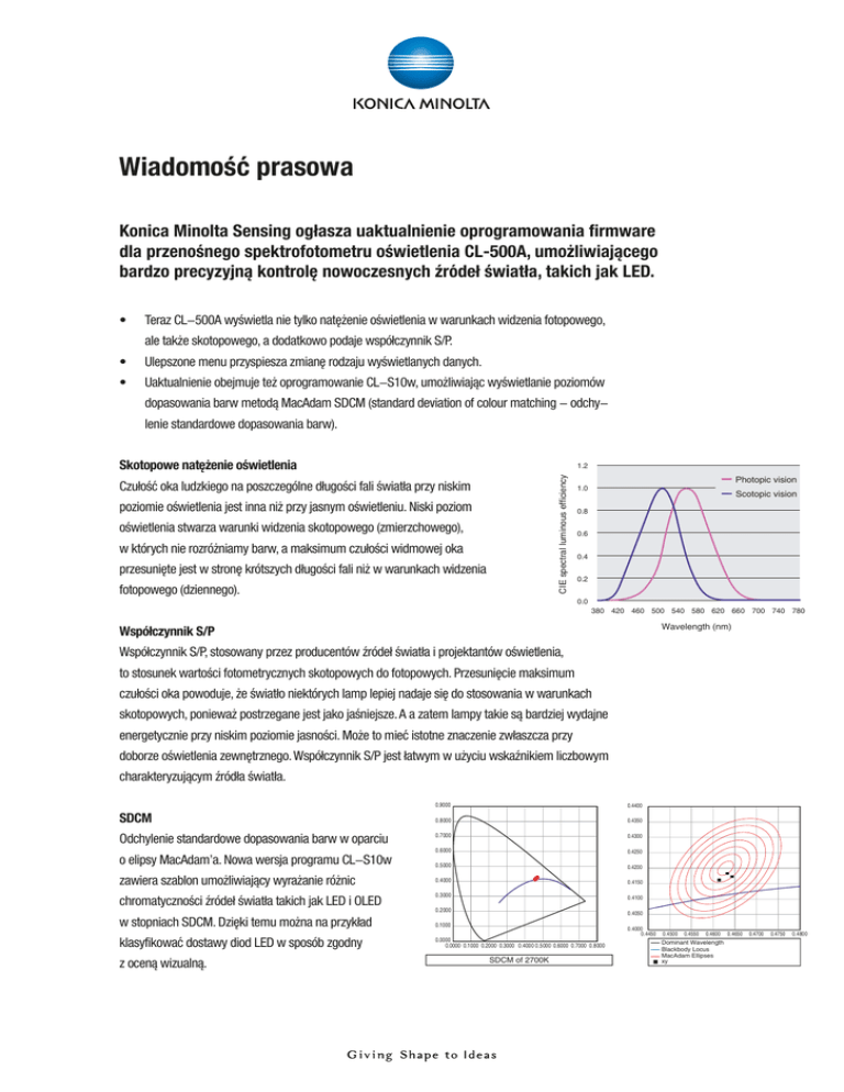 Wiadomość prasowa Konica Minolta Sensing ogłasza uaktualnienie oprogramowania firmware dla przenośnego spektrofotometru oświetlenia CL-500A, umożliwiającego bardzo precyzyjną kontrolę nowoczesnych źródeł światła, takich jak LED. • Teraz CL-500A wyświetla nie tylko natężenie oświetlenia w warunkach widzenia fotopowego, ale także skotopowego, a dodatkowo podaje współczynnik S/P. • Ulepszone menu przyspiesza zmianę rodzaju wyświetlanych danych. • Uaktualnienie obejmuje też oprogramowanie CL-S10w, umożliwiając wyświetlanie poziomów dopasowania barw metodą MacAdam SDCM (standard deviation of colour matching - odchylenie standardowe dopasowania barw). Skotopowe natężenie oświetlenia CIE spectral luminous efficiency 1.2 Czułość oka ludzkiego na poszczególne długości fali światła przy niskim poziomie oświetlenia jest inna niż przy jasnym oświetleniu. Niski poziom oświetlenia stwarza warunki widzenia skotopowego (zmierzchowego), w których nie rozróżniamy barw, a maksimum czułości widmowej oka przesunięte jest w stronę krótszych długości fali niż w warunkach widzenia fotopowego (dziennego). Photopic vision 1.0 Scotopic vision 0.8 0.6 0.4 0.2 0.0 380 420 460 500 540 580 620 660 700 740 780 Wavelength (nm) Współczynnik S/P Współczynnik S/P, stosowany przez producentów źródeł światła i projektantów oświetlenia, to stosunek wartości fotometrycznych skotopowych do fotopowych. Przesunięcie maksimum czułości oka powoduje, że światło niektórych lamp lepiej nadaje się do stosowania w warunkach skotopowych, ponieważ postrzegane jest jako jaśniejsze. A a zatem lampy takie są bardziej wydajne energetycznie przy niskim poziomie jasności. Może to mieć istotne znaczenie zwłaszcza przy doborze oświetlenia zewnętrznego. Współczynnik S/P jest łatwym w użyciu wskaźnikiem liczbowym charakteryzującym źródła światła. SDCM Odchylenie standardowe dopasowania barw w oparciu o elipsy MacAdam’a. Nowa wersja programu CL-S10w zawiera szablon umożliwiający wyrażanie różnic chromatyczności źródeł światła takich jak LED i OLED 0.9000 0.4400 0.8000 0.4350 0.7000 0.4300 0.6000 0.4250 0.5000 0.4200 0.4000 0.4150 0.3000 0.4100 0.2000 0.4050 w stopniach SDCM. Dzięki temu można na przykład 0.1000 klasyfikować dostawy diod LED w sposób zgodny 0.0000 0.0000 0.1000 0.2000 0.3000 0.4000 0.5000 0.6000 0.7000 0.8000 z oceną wizualną. SDCM of 2700K 0.4000 0.4450 0.4500 0.4550 0.4600 Dominant Wavelength Blackbody Locus MacAdam Ellipses xy 0.4650 0.4700 0.4750 0.4800 Dokładność najwyższej klasy dla spełnienia norm DIN i JIS CL-500A jest pierwszym ręcznym spektrofotometrem do pomiaru natężenia oświetlenia, spełniającym normy DIN 5032 Part 7 Class B oraz JIS C 1609-1:2006 General Class AA. Pliki uaktualnienia oprogramowania firmware oraz CL-S10w dla obecnych użytkowników spektrofotometru CL-500A dostępne są na naszej stronie internetowej: www.konicaminolta.com/instruments/download/software/light/cl-s10w/index.html Więcej informacji o pomiarach świetlnych można znaleźć w broszurze The Language of Light, dostępnej także na naszej stronie: www.konicaminolta.eu/en/measuring-instruments/learning-centre/light-measurement/the-language-of-light.html Dokładny i uniwersalny instrument do pomiaru wskaźnika oddawania barw CRI CL-500A to poręczny, lekki instrument, który może być używany nie tylko do pomiaru natężenia oświetlenia ale też oceny widma, chromatyczności, dominującej długości fali i temperatury barwowej rozmaitych źródeł światła, np. LED, OLED, jarzeniowych itp. CL-500A dzięki pomiarowi widma jest w stanie obliczać współczynniki oddawania barw CRI i to zarówno wskaźnik ogólny Ra jak i wszystkie wskaźniki szczegółowe R1 - R15. CL-500A jest idealnym urządzeniem dla wielu zastosowań, takich jak: • Terenowe pomiary światła z bardzo różnorodnych źródeł, analiza danych o natężeniu oświetlenia, temperaturze barwowej, chromatyczności i wskaźnikach oddawania barw • Opracowywanie, kontrola jakości i obsługa tablic informacyjnych LED • Sensor do pomiaru strumienia świetlnego (w połączenu z kulą całkujacą) i bryły fotometrycznej (w połączeniu z goniometrem) • Badania i inspekcja projektorów wideo • Pomiary efektywności światła dla fotosyntezy, zastosowania w rolnictwie • nstrument odniesienia w systemie zarządzania jakością wykorzystującym luksomierze T-10A i kolorymetry CL-200A O firmie Konica Minolta Sensing Europe B.V.: Konica Minolta Sensing Europe B.V., filia Konica Minolta Sensing Inc. z siedzibą w Japonii jest wiodącym dostawcą rozwiązań pomiarowych dla zastosowań na polach: kolorystyki, światła, wyświetlaczy oraz skanowania 3D. Za pośrednictwem oddziałów i dystrybutorów rozlokowanych w ponad 30 krajach Konica Minolta Sensing Europe świadczy oferuje produkty dla przemysłu w Europie, Afryce i na bliskim wschodzie. Czerpiąc z najnowocześniejszych technologii optycznych oraz przetwarzania obrazu, rozwiązania pomiarowe Konica Minolta Sensing usprawniają kontrolę jakości oraz wspierają badania i rozwój w szeregu przedsiębiorstw i branż. Nasze rozwiązania w zakresie zarządzania kolorem mają zasadnicze znaczenie dla kontroli i monitorowania jakości w wielu obszarach produkcji, takich jak motoryzacja, farby i lakiery, tworzywa sztuczne, materiały budowlane, żywność, chemia czy medycyna. W innowacyjnej branży ekranów i wyświetlaczy wszelkiego typu, analizatory barw Konica Minolta cieszą się pozycją „przemysłowego standardu”. Nasze digitizery 3D znajdują szerokie zastosowanie w medycynie, ochronie dziedzictwa kulturowego, edukacji akademickiej oraz badaniach naukowych. Konica Minolta Sensing będzie kontynuować wprowadzanie innowacji, wykorzystując najnowsze wysokoprecyzyjne technologie pomiarowe i dostarczając rozwiązań, które spotykają się ze stale zmieniającymi się potrzebami na różnorod
