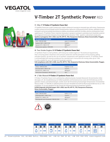 w w w.ve gatol.com V-Timber 2T Synthetic Power RED Olej 2T V-Timber 2T Synthetic Power Red 2T Synthetic Power jest w pełni syntetycznym olejem silnikowym tworzącym mieszanki typu self-mixing. Zastosowana w pełni syntetyczna technologia użytych komponentów zapewnia czystą powierzchnię cylindra, zabezpiecza antykorozyjnie oraz przeciwdziała powstawaniu osadów, przywieraniu pierścieni do tłoka, poceniu się korpusów świec zapłonowych. 2T Synthetic Power może byś stosowany w sprzęcie z pompami automatycznymi (autolube systems) lub wstępnymi komorami mieszania (max współczynnik mieszania 1:100) - zgodnie z zaleceniami producenta. Spełnia wymagania: ISO-L-EGD, Jaso FD, API TC, TISI, Husqvarna Chainsaw, Rotax Snowmobile, Piaggio. INFORMACJE TECHNICZNE Kolor / DIN ISO 2049 jasny 1,5; czerwony Lepkość/100°C / DIN 51 562 9 mm²/s Gęstość/15°C / DIN 51 757 894 kg/m³ Temperatura zapłonu / DIN 2909 95°C Two Stroke Engine Oil V-Timber 2T Synthetic Power Red 2T Synthetic Power is a full synthetic, self-mixing two-stroke engine oil. The technical requirements, that is ensuring piston cleanliness and corrosion protection and the prevention of ring sticking, galling and glow ignition, are met by the use of synthetic components with significant reserve. 2T Synthetic Power is recommended self-mixing according to the manufacturer’s instructions for mixing ratios up to 1:100. It is also suitable for use in oil injection (autolube systems). Full compliance with: ISO-L-EGD, Jaso FD, API TC, TISI, Husqvarna Chainsaw, Rotax Snowmobile, Piaggio. TECHNICAL INFORMATIONS Colour / DIN ISO 2049 brighter 1,5 red Viscosity/100°C / DIN 51 562 9 mm²/s Density/15°C / DIN 51 757 894 kg/m³ Flash point (Cleveland) / DIN ISO 2592 95°C 2 Takt Motoröl V-Timber 2T Synthetic Power Red V-Timber 2T Synthetic Power ist ein synthetisches selbstmischendes Zweitakt Motorenöl. Die technischen Anforderungen, d.h. die Gewährleistung von Kolbensauberkeit und Korrosionsschutz sowie die Verhinderung von Ringstecken, Fressen und Glühzündungen, werden durch die Verwendung hochwertiger Komponenten mit deutlicher Reserve erfüllt. 2 TZ RACING ist selbstmischend und nach Herstellervorschrift für Mischungsverhältnisse bis zu 1:100 empfohlen. Es ist auch geeignet für den Einsatz bei Getrenntschmierung (Autolube-Systeme). Erfüllt folgende Anforderungen: ISO-L-EGD, Jaso FD, API TC, TISI, Husqvarna Chainsaw, Rotax Snowmobile, Piaggio. TECHNISCHE INFORMATIONEN Farbe / DIN ISO 2049 heller 1,5 rot Viskosität/100°C / DIN 51 562 9 mm²/s Dichte/15°C / DIN 51 757 894 kg/m³ Flammpunkt (nach Cleveland) / DIN ISO 2592 95°C 0,1 l 24 1200 1l 12 1l 480 12 5l 480 4 205 l 108 4 u l . S t a w i s z y ń s k a 133 , 6 2 - 8 0 0 K a l i s z , P O L A N D, t e l . + 4 8 6 2 76 0 35 6 3 , + 4 8 535 55 0 970 , w w w.v e g a t o l . c o m
