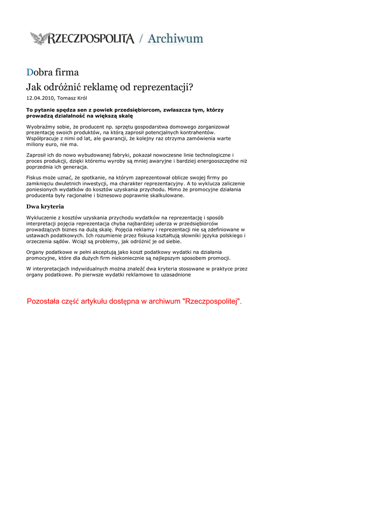 Dobra firma Jak odróżnić reklamę od reprezentacji? 12.04.2010, Tomasz Król To pytanie spędza sen z powiek przedsiębiorcom, zwłaszcza tym, którzy prowadzą działalność na większą skalę Wyobraźmy sobie, Ŝe producent np. sprzętu gospodarstwa domowego zorganizował prezentację swoich produktów, na którą zaprosił potencjalnych kontrahentów. Współpracuje z nimi od lat, ale gwarancji, Ŝe kolejny raz otrzyma zamówienia warte miliony euro, nie ma. Zaprosił ich do nowo wybudowanej fabryki, pokazał nowoczesne linie technologiczne i proces produkcji, dzięki któremu wyroby są mniej awaryjne i bardziej energooszczędne niŜ poprzednia ich generacja. Fiskus moŜe uznać, Ŝe spotkanie, na którym zaprezentował oblicze swojej firmy po zamknięciu dwuletnich inwestycji, ma charakter reprezentacyjny. A to wyklucza zaliczenie poniesionych wydatków do kosztów uzyskania przychodu. Mimo Ŝe promocyjne działania producenta były racjonalne i biznesowo poprawnie skalkulowane. Dwa kryteria Wykluczenie z kosztów uzyskania przychodu wydatków na reprezentację i sposób interpretacji pojęcia reprezentacja chyba najbardziej uderza w przedsiębiorców prowadzących biznes na duŜą skalę. Pojęcia reklamy i reprezentacji nie są zdefiniowane w ustawach podatkowych. Ich rozumienie przez fiskusa kształtują słowniki języka polskiego i orzeczenia sądów. WciąŜ są problemy, jak odróŜnić je od siebie. Organy podatkowe w pełni akceptują jako koszt podatkowy wydatki na działania promocyjne, które dla duŜych firm niekoniecznie są najlepszym sposobem promocji. W interpretacjach indywidualnych moŜna znaleźć dwa kryteria stosowane w praktyce przez organy podatkowe. Po pierwsze wydatki reklamowe to uzasadnione Pozostała część artykułu dostępna w archiwum "Rzeczpospolitej".