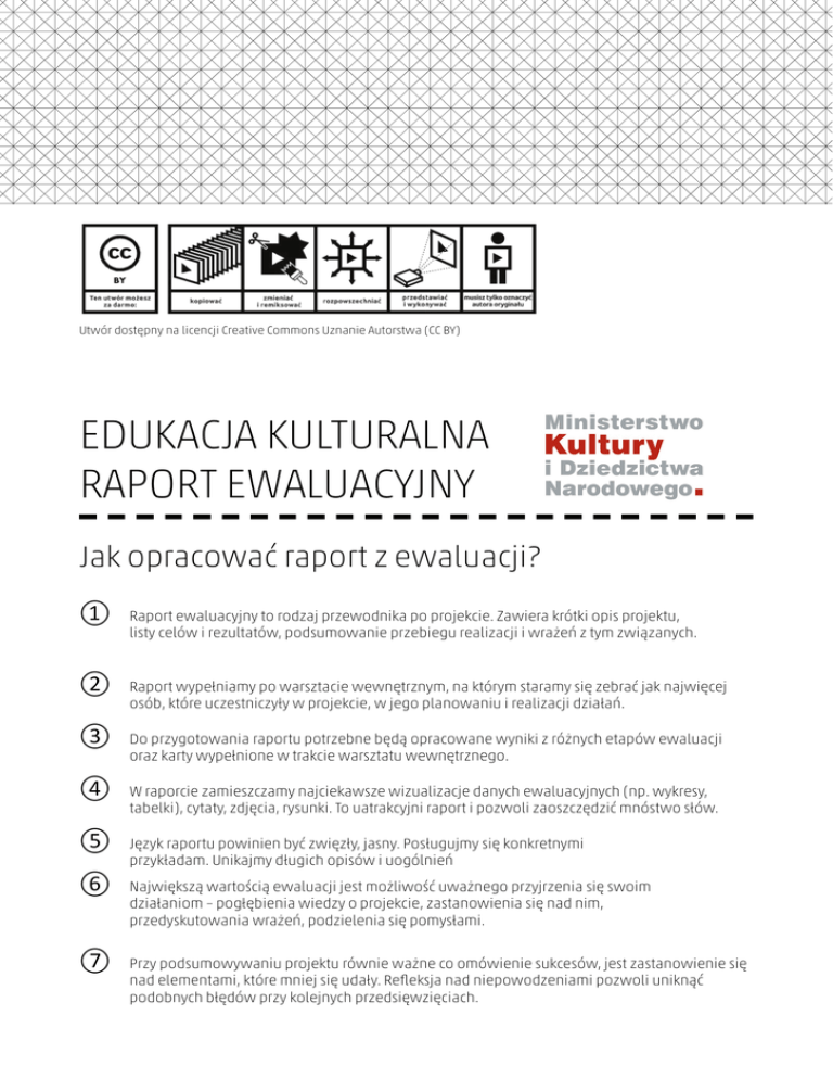 Utwór dostępny na licencji Creative Commons Uznanie Autorstwa (CC BY) EDUKACJA KULTURALNA RAPORT EWALUACYJNY Jak opracować raport z ewaluacji? ① ② ③ ④ ⑤ ⑥ ⑦ Raport ewaluacyjny to rodzaj przewodnika po projekcie. Zawiera krótki opis projektu, listy celów i rezultatów, podsumowanie przebiegu realizacji i wrażeń z tym związanych. Raport wypełniamy po warsztacie wewnętrznym, na którym staramy się zebrać jak najwięcej osób, które uczestniczyły w projekcie, w jego planowaniu i realizacji działań. Do przygotowania raportu potrzebne będą opracowane wyniki z różnych etapów ewaluacji oraz karty wypełnione w trakcie warsztatu wewnętrznego. W raporcie zamieszczamy najciekawsze wizualizacje danych ewaluacyjnych (np. wykresy, tabelki), cytaty, zdjęcia, rysunki. To uatrakcyjni raport i pozwoli zaoszczędzić mnóstwo słów. Język raportu powinien być zwięzły, jasny. Posługujmy się konkretnymi przykładam. Unikajmy długich opisów i uogólnień Największą wartością ewaluacji jest możliwość uważnego przyjrzenia się swoim działaniom – pogłębienia wiedzy o projekcie, zastanowienia się nad nim, przedyskutowania wrażeń, podzielenia się pomysłami. Przy podsumowywaniu projektu równie ważne co omówienie sukcesów, jest zastanowienie się nad elementami, które mniej się udały. Refleksja nad niepowodzeniami pozwoli uniknąć podobnych błędów przy kolejnych przedsięwzięciach. OPIS PROJEKTU Metryczka projektu ↗ Tytuł projektu Teatr łączy pokolenia ↗ W osobnych punktach wypisz wszystkie zrealizowane elementy projektu według schematu: nazwa wydarzenia i rodzaj działania („Pan Hilary”, spektakl z udziałem dzieci) LUB (jeśli elementów było bardzo wiele) tylko rodzaj działań i wskazanie liczby wydarzeń w danej kategorii np. warsztaty dla dzieci (10), pokazy filmowe (2), seminaria edukacyjne (3). Warsztaty teatralne (3 grupy, łącznie 120 godzin zajęć) Występy (8) Szkolenie dla seniorów i osób z niepełnosprawnością - intensywne warsztaty teatru aktywizującego (1 grupa, 30 godzin zajęć) Szkolenie kadry - intensywne warsztaty teatru aktywizującego (4 spotkania, 20 godzin zajęć) Sesje dyskusyjne (3) Wystąpienia konferencyjne (3) Wydanie publikacji książkowej (1) Prowadzenie, rozbudowanie i promocja portalu www.teatramatorski.pl (1) Główny cel projektu ↗ Czemu miał służyć projekt? Opis głównego celu w jednym — dwóch zdaniach. Głównym celem projektu było wzmocnienie aktywności teatru amatorskiego z udziałem grup międzypokoleniowych, w tym upowszechnienie innowacyjnych praktyk i twórczych doświadczeń w dziedzinie edukacji teatralnej osób defaworyzowanych Organizacja pracy ↗ Krótki opis organizacji pracy. Jaki był sposób pracy przy projekcie? Kto przy nim pracował? Czy były to osoby z jednego czy z różnych działów? Czy były to osoby doświadczone w realizowaniu podobnych projektów, czy zdobywające nowe kompetencje? Jakie zauważamy zalety i wady przyjętych rozwiązań? Czym możemy się pochwalić? Czego wolelibyśmy unikać w przyszłości? Do pracy nad projektem zostali włączeni pracownicy z różnych działów, a o ich harmonijne współdziałanie zmierzające do osiągnięcia wyznaczonych celów dbał koordynator. W realizację programu warsztatowego byli zaangażowani instruktorzy Stowarzyszenia posiadający duże doświadczenie w pracy z osobami niepełnosprawnymi, dobrze przygotowani do monitorowania procesu grupowego, a także do sprostania wyzwaniom artystycznym. Platformą www.teatramatorski.pl zajęła się osoba, która od dwóch lat prowadzi ten portal, jest z wykształcenia teatrologiem i ma wieloletnie doświadczenie w pracy redakcyjnej. Nad sprawną organizacją działań projektu czuwał zespół administracyjny, osoby od lat realizujące z powodzeniem inicjatywy Stowarzyszenia. Współpraca przy projekcie ↗ Opis współpracy przy projekcie. Czy włączono partnerów spoza instytucji, organizacji? Jakich? Czy byli to nowi czy stali partnerzy, współpracownicy? Jak się powiodła współpraca? Na czym polegała współpraca (np. użyczenie sprzętu, ufundowanie nagród, konsultacje, pomoc merytoryczna)? Czy zaangażowano wolontariuszy? Jakie zauważamy zalety i wady przyjętych rozwiązań? Czym możemy się pochwalić? Czego wolelibyśmy unikać w przyszłości? W realizację projektu były zaangażowane organizacje partnerskie współpracujące od lat ze Stowarzyszeniem: Środowiskowy Dom Samopomocy „Podkowa”, Subrejonowy Ośrodek Leczenia Psychiatrycznego „Olszówka”, Polski Związek Głuchych, Klub Garnizonowy „Dom Żołnierza” i Teatr Lalek Banialuka w Bielsku-Białej oraz Expedition Metropolis z Berlina. Dzięki wsparciu lokalnych placówek otrzymaliśmy pomoc przy naborze uczestników, pomoc psychologiczną na zajęciach, pomoc tłumacza migowego. Mieliśmy również zapewnione bezpłatnie pomieszczenia do prowadzenia zajęć warsztatowych i sale widowiskowe na występy. Udział partnerów w projekcie przyczynił się do zwiększenia zasięgu jego oddziaływania. Na podkreślenie zasługuje szczególnie promocja teatru amatorskiego w ramach prestiżowego międzynarodowego Festiwalu Sztuki Lalkarskiej w Bielsku-Białej oraz międzynarodowego festiwalu teatralnego w Berlinie. Współpraca z partnerami zagranicznymi w Niemczech (Evangelische Akademie, Bad Boll) i we Włoszech (Centro Studi Opera Don Calabria) zaowocowała pozyskaniem przez stowarzyszenie nowych metod pracy twórczej i wydaniem kolejnej publikacji. Istotny wkład w realizację projektu wniosło zaangażowanie wolontariuszy. Były to zarówno osoby, które pomagają nam co roku, jak i nowe wolontariuszki, które odpowiedziały na nasz apel o pomoc w przygotowaniu scenografii i lalek do spektaklu „Bajka o dwugłowych smokach” Teatru Grodzkiego Junior. Ich udział w pracach grupy okazał się kluczowy dla realizacji widowiska i zadecydował o jego pięknym wizualnym kszta