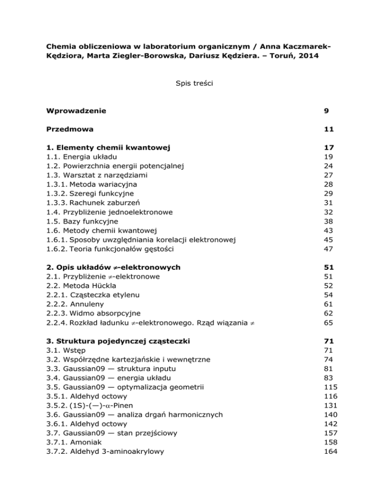 Chemia obliczeniowa w laboratorium organicznym / Anna KaczmarekKędziora, Marta Ziegler-Borowska, Dariusz Kędziera. – Toruń, 2014 Spis treści Wprowadzenie 9 Przedmowa 11 1. Elementy chemii kwantowej 1.1. Energia układu 1.2. Powierzchnia energii potencjalnej 1.3. Warsztat z narzędziami 1.3.1. Metoda wariacyjna 1.3.2. Szeregi funkcyjne 1.3.3. Rachunek zaburzeń 1.4. PrzybliŜenie jednoelektronowe 1.5. Bazy funkcyjne 1.6. Metody chemii kwantowej 1.6.1. Sposoby uwzględniania korelacji elektronowej 1.6.2. Teoria funkcjonałów gęstości 17 19 24 27 28 29 31 32 38 43 45 47 2. Opis układów π-elektronowych 2.1. PrzybliŜenie π-elektronowe 2.2. Metoda Hückla 2.2.1. Cząsteczka etylenu 2.2.2. Annuleny 2.2.3. Widmo absorpcyjne 2.2.4. Rozkład ładunku π-elektronowego. Rząd wiązania π 51 51 52 54 61 62 65 3. Struktura pojedynczej cząsteczki 3.1. Wstęp 3.2. Współrzędne kartezjańskie i wewnętrzne 3.3. Gaussian09 — struktura inputu 3.4. Gaussian09 — energia układu 3.5. Gaussian09 — optymalizacja geometrii 3.5.1. Aldehyd octowy 3.5.2. (1S)-(—)-α-Pinen 3.6. Gaussian09 — analiza drgań harmonicznych 3.6.1. Aldehyd octowy 3.7. Gaussian09 — stan przejściowy 3.7.1. Amoniak 3.7.2. Aldehyd 3-aminoakrylowy 71 71 74 81 83 115 116 131 140 142 157 158 164 3.8. Gaussian09 — analiza powierzchni energii potencjalnej 3.8.1. Glicyna 3.9. Gaussian09 — skan powierzchni energii potencjalnej 3.9.1. Oddziaływanie benzenu z kationem sodu 3.9.2. 1,2-Dichloroetan 3.10. Gaussian09 — ścieŜki reakcji 167 167 173 173 177 184 4 Właściwości spektroskopowe cząsteczek 4.1. Gaussian09 — widmo UV 4.1.1. Etylen 4.1.2. Izopren 4.1.3. Metyloheksahydronaftalenon 4.2. Gaussian09 — widmo NMR 4.2.1. 2-Buten — przesunięcie chemiczne w 1H NMR 4.3. Gaussian09 — skręcalność właściwa 4.3.1. Kwas (S)-(—)-parakonowy 193 193 195 202 208 211 214 223 228 5 Cząsteczka w otoczeniu chemicznym 5.1. Słabe oddziaływania międzymolekularne 5.1.1. Gaussian09 — energia oddziaływania międzymolekularnego 5.1.2. Gaussian09 — zautomatyzowany sposób liczenia oddziaływań 5.1.3. Gaussian09 — skan oddziaływania po odległości 5.2. Gaussian09 — modelowanie efektów rozpuszczalnikowych 5.2.1. Optymalizacja geometrii w rozpuszczalniku 5.2.2. Swobodna entalpia solwatacji 5.2.3. Wpływ efektów rozpuszczalnikowych na stan równowagi chemicznej 5.2.4. Wpływ efektów rozpuszczalnikowych na wysokość barier rotacji 5.2.5. Widmo IR w fazie skondensowanej 5.2.6. Przesunięcie solwatochromowe 5.2.7. Wpływ rozpuszczalnika na połoŜenie sygnałów NMR 5.2.8. Wpływ rozpuszczalnika na skręcalność 237 237 243 251 254 259 262 266 269 272 273 279 282 283 6 Chemia obliczeniowa w pracy eksperymentalnej 6.1. Lipofilowość 6.1.1. Zasady kwasów nukleinowych 6.2. Kwasowość/zasadowość 6.2.1. Deprotonowanie pirolu 6.2.2. Stała protolizy 6.2.3. Potencjał redox 6.3. Reaktywność produktów pośrednich 6.4. Reaktywność układów aromatycznych 6.4.1. Aromatyczność układów organicznych 6.4.2. Substytucja elektrofilowa w pierścieniu aromatycznym 6.4.3. Substytucja elektrofilowa w układach heterocyklicznych 6.5. Opis układów otwartopowłokowych 287 287 289 292 292 300 302 303 305 305 314 317 318 6.5.1. Kation, rodnik i anion allilowy 6.6. Reakcje pericykliczne 6.6.1. Reakcje cykloaddycji 6.6.2. Reakcje elektrocyklizacji 321 327 328 339 7 Zadania i ćwiczenia 345 A. Linux: Rzecz o wolności A.1. Logowanie A.2. Komunikacja pomiędzy maszynami A.2.1. ssh, scp A.2.2. Window(s) na świat: PuTTy, WinSCP A.3. Podstawowe komendy A.4. Edytor tekstu A.5. Inne przydatne narzędzia 361 361 362 362 364 364 367 370 B. Rozwiązania zadań 375 Bibliografia 413 Indeks rzeczowy 433 Ilustracje 439 oprac. BPK