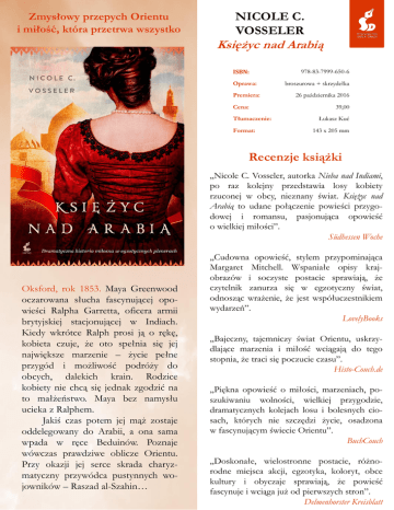 Zmysłowy przepych Orientu i miłość, która przetrwa wszystko NICOLE C. VOSSELER Księżyc nad Arabią ISBN: Oprawa: Premiera: Cena: Tłumaczenie: Format: 978-83-7999-650-6 broszurowa + skrzydełka 26 października 2016 39,00 Łukasz Kuć 143 x 205 mm Recenzje książki „Nicole C. Vosseler, autorka Nieba nad Indiami, po raz kolejny przedstawia losy kobiety rzuconej w obcy, nieznany świat. Księżyc nad Arabią to udane połączenie powieści przygodowej i romansu, pasjonująca opowieść o wielkiej miłości”. Südhessen Woche Oksford, rok 1853. Maya Greenwood oczarowana słucha fascynującej opowieści Ralpha Garretta, oficera armii brytyjskiej stacjonującej w Indiach. Kiedy wkrótce Ralph prosi ją o rękę, kobieta czuje, że oto spełnia się jej największe marzenie – życie pełne przygód i możliwość podróży do obcych, dalekich krain. Rodzice kobiety nie chcą się jednak zgodzić na to małżeństwo. Maya bez namysłu ucieka z Ralphem. Jakiś czas potem jej mąż zostaje oddelegowany do Arabii, a ona sama wpada w ręce Beduinów. Poznaje wówczas prawdziwe oblicze Orientu. Przy okazji jej serce skrada charyzmatyczny przywódca pustynnych wojowników – Raszad al-Szahin… „Cudowna opowieść, stylem przypominająca Margaret Mitchell. Wspaniałe opisy krajobrazów i soczyste postacie sprawiają, że czytelnik zanurza się w egzotyczny świat, odnosząc wrażenie, że jest współuczestnikiem wydarzeń”. LovelyBooks „Bajeczny, tajemniczy świat Orientu, uskrzydlające marzenia i miłość wciągają do tego stopnia, że traci się poczucie czasu”. Histo-Couch.de „Piękna opowieść o miłości, marzeniach, poszukiwaniu wolności, wielkiej przygodzie, dramatycznych kolejach losu i bolesnych ciosach, których nie szczędzi życie, osadzona w fascynującym świecie Orientu”. BuchCouch „Doskonałe, wielostronne postacie, różnorodne miejsca akcji, egzotyka, koloryt, obce kultury i obyczaje sprawiają, że powieść fascynuje i wciąga już od pierwszych stron”. Delmenhorster Kreisblatt Poprzednia powieść autorki Frapująca historia miłosna w scenerii XIX-wiecznych Indii. Powieść obyczajowo-przygodowa w klimacie Baśni Tysiąca i Jednej Nocy. Recenzje książki „Romantyczna powieść miłosna pełna przygód”. Suedsessen Woche NICOLE C. VOSSELER Urodziła się w 1972 roku w Villingen-Schwenningen. Studiowała literaturoznawstwo i psychologię na uniwersytetach w Tübingen i Konstancji. Zadebiutowała Niebem nad Indiami, którym natychmiast podbiła serca czytelników, dołączają do grona ulubionych niemieckich autorek powieści dla kobiet. Za książkę tę została też uhonorowana nagrodą Konstanzer Foerderpreis przyznawaną przez historyczne miasto Konstancja. Obecnie Nicole C. Vosseler mieszka i pracuje w Konstancji. Autorka uwielbia podróżować, czytać książki, oglądać filmy i objadać się czekoladą. Strona internetowa autorki: www.nicole-vosseler.de Sonia Draga Sp. z o.o., Pl. Grunwaldzki 8-10, 40-127 Katowice, Tel.: 32 7826477, 7826037, Fax: 032 2537728 Dział handlowy: Danuta Czarnowska, 693420384, [email protected] Promocja: Agnieszka Jedlińska, 695672067, [email protected] Redakcja: [email protected] „Odkryłam tę książkę w bibliotece i przeczytałam w ciągu jednego dnia. Natychmiast pobiegłam do księgarni, by przeczytać ją raz jeszcze! Uwielbiam tę historię! Jest cudowna! I mogę ją polecić wszystkim!” Recenzja czytelniczki na forum Bollywoodforumum.de „Niebo nad Indiami to intrygująca książka z wątkiem miłosnym w tle, przy której z pewnością nie będziecie się nudzić. Polecam wszystkim czytelnikom ceniącym egzotyczne motywy, oryginalne historie miłosne oraz powieści, które umiejętnie łączą dramatyczną miłość i bajkowe opisy”. www.kasandra-85.blogspot.com Opinie polskich czytelników „Piękna powieść z opisami indyjskiej przyrody, historii Indii, no i miłości. Powieść częściowo oparta na faktach. Świetnie się czyta”. „Ciekawy romans przygodowy rozgrywający się w egzotycznej scenerii XIX-wiecznych Indii. Bardzo bogate tło obyczajowe i historyczne to zdecydowanie największe atuty tej powieści. Książka zachwyci wszystkie miłośniczki indyjskich historii, obyczajów, smaków i pejzaży”. „Świetna książka zawierająca trochę miłości, tajemnicę i przede wszystkim opisy pięknych Indii”. http://lubimyczytac.pl/ksiazka/142677/niebo-nad-indiami