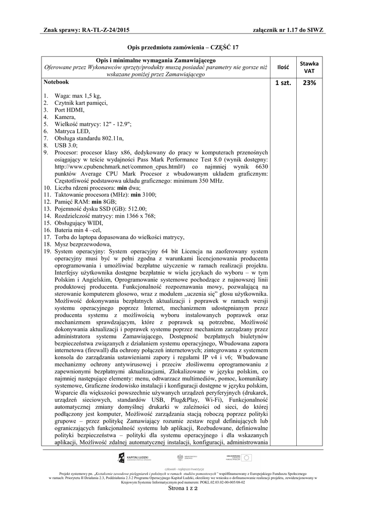 Znak sprawy: RA-TL-Z-24/2015 załącznik nr 1.17 do SIWZ Opis przedmiotu zamówienia – CZĘŚĆ 17 Opis i minimalne wymagania Zamawiającego Oferowane przez Wykonawców sprzęty/produkty muszą posiadać parametry nie gorsze niż wskazane poniżej przez Zamawiającego Notebook 1. 2. 3. 4. 5. 6. 7. 8. 9. 10. 11. 12. 13. 14. 15. 16. 17. 18. 19. Ilość Stawka VAT 1 szt. 23% Waga: max 1,5 kg, Czytnik kart pamięci, Port HDMI, Kamera, Wielkość matrycy: 12" - 12.9"; Matryca LED, Obsługa standardu 802.11n, USB 3.0; Procesor: procesor klasy x86, dedykowany do pracy w komputerach przenośnych osiągający w teście wydajności Pass Mark Performance Test 8.0 (wynik dostępny: http://www.cpubenchmark.net/common_cpus.html#) co najmniej wynik 6630 punktów Average CPU Mark Procesor z wbudowanym układem graficznym: Częstotliwość podstawowa układu graficznego: minimum 350 MHz. Liczba rdzeni procesora: min dwa; Taktowanie procesora (MHz): min 3100; Pamięć RAM: min 8GB; Pojemność dysku SSD (GB): 512.00; Rozdzielczość matrycy: min 1366 x 768; Obsługujący WIDI, Bateria min 4 –cel, Torba do laptopa dopasowana do wielkości matrycy, Mysz bezprzewodowa, System operacyjny: System operacyjny 64 bit Licencja na zaoferowany system operacyjny musi być w pełni zgodna z warunkami licencjonowania producenta oprogramowania i umożliwiać bezpłatne użyczenie w ramach realizacji projektu. Interfejsy użytkownika dostępne bezpłatnie w wielu językach do wyboru – w tym Polskim i Angielskim, Oprogramowanie systemowe pochodzące z najnowszej linii produktowej producenta. Funkcjonalność rozpoznawania mowy, pozwalającą na sterowanie komputerem głosowo, wraz z modułem „uczenia się” głosu użytkownika. Możliwość dokonywania bezpłatnych aktualizacji i poprawek w ramach wersji systemu operacyjnego poprzez Internet, mechanizmem udostępnianym przez producenta systemu z możliwością wyboru instalowanych poprawek oraz mechanizmem sprawdzającym, które z poprawek są potrzebne, Możliwość dokonywania aktualizacji i poprawek systemu poprzez mechanizm zarządzany przez administratora systemu Zamawiającego, Dostępność bezpłatnych biuletynów bezpieczeństwa związanych z działaniem systemu operacyjnego, Wbudowana zapora internetowa (firewall) dla ochrony połączeń internetowych; zintegrowana z systemem konsola do zarządzania ustawieniami zapory i regułami IP v4 i v6; Wbudowane mechanizmy ochrony antywirusowej i przeciw złośliwemu oprogramowaniu z zapewnionymi bezpłatnymi aktualizacjami, Zlokalizowane w języku polskim, co najmniej następujące elementy: menu, odtwarzacz multimediów, pomoc, komunikaty systemowe, Graficzne środowisko instalacji i konfiguracji dostępne w języku polskim, Wsparcie dla większości powszechnie używanych urządzeń peryferyjnych (drukarek, urządzeń sieciowych, standardów USB, Plug&Play, Wi-Fi), Funkcjonalność automatycznej zmiany domyślnej drukarki w zależności od sieci, do której podłączony jest komputer, Możliwość zarządzania stacją roboczą poprzez polityki grupowe – przez politykę Zamawiający rozumie zestaw reguł definiujących lub ograniczających funkcjonalność systemu lub aplikacji, Rozbudowane, definiowalne polityki bezpieczeństwa – polityki dla systemu operacyjnego i dla wskazanych aplikacji, Możliwość zdalnej automatycznej instalacji, konfiguracji, administrowania Projekt systemowy pn. „Kształcenie zawodowe pielęgniarek i położnych w ramach studiów pomostowych” współfinansowany z Europejskiego Funduszu Społecznego w ramach: Priorytetu II Działania 2.3, Poddziałania 2.3.2 Programu Operacyjnego Kapitał Ludzki, określony we wniosku o dofinansowanie realizacji projektu, zewidencjonowany w Krajowym Systemie Informatycznym pod numerem: POKL.02.03.02-00-005/08-02 Strona 1 z 2 Znak sprawy: RA-TL-Z-24/2015 załącznik nr 1.17 do SIWZ oraz aktualizowania systemu, zgodnie z określonymi uprawnieniami poprzez polityki grupowe, Zabezpieczony hasłem hierarchiczny dostęp do systemu, konta i profile użytkowników zarządzane zdalnie; praca systemu w trybie ochrony kont użytkowników. Zintegrowany z systemem moduł wyszukiwania informacji (plików różnego typu, tekstów, metadanych) dostępny z kilku poziomów: poziom menu, poziom otwartego okna systemu operacyjnego; system wyszukiwania oparty na konfigurowalnym przez użytkownika module indeksacji zasobów lokalnych, Zintegrowany z systemem operacyjnym moduł synchronizacji komputera z urządzeniami zewnętrznymi. Wbudowany system pomocy w języku polskim; Możliwość przystosowania stanowiska dla osób niepełnosprawnych (np. słabo widzących); Wsparcie dla IPSEC oparte na politykach – wdrażanie IPSEC oparte na zestawach reguł definiujących ustawienia zarządzanych w sposób centralny; Automatyczne występowanie i używanie (wystawianie) certyfikatów PKI X.509; Mechanizmy logowania w oparciu o: Login i hasło, Karty z certyfikatami (smartcard), Wirtualne karty (logowanie w oparciu o certyfikat chroniony poprzez moduł TPM), Wsparcie dla uwierzytelniania na bazie Kerberos v. 5, Wsparcie do uwierzytelnienia urządzenia na bazie certyfikatu, Wsparcie dla algorytmów Suite B (RFC 4869), Wsparcie wbudowanej zapory ogniowej dla Internet Key Exchange v. 2 (IKEv2) dla warstwy transportowej IPsec, Wbudowane narzędzia służące do administracji, do wykonywania kopii zapasowych polityk i ich odtwarzania oraz generowania raportów z ustawień polityk; Wsparcie dla środowisk Java i .NET Framework 4.x – możliwość uruchomienia aplikacji działających we wskazanych środowiskach, Wsparcie dla JScript i VBScript – możliwość uruchamiania interpretera poleceń, Zdalna pomoc i współdzielenie aplikacji – możliwość zdalnego przejęcia sesji zalogowanego użytkownika celem rozwiązania problemu z komputerem, Rozwiązanie służące do automatycznego zbudowania obrazu systemu wraz z aplikacjami. Obraz systemu służyć ma do automatycznego up