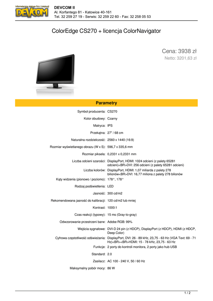 DEVCOM II Al. Korfantego 81 - Katowice 40-161 Tel. 32 259 27 19 - Serwis: 32 259 22 60 - Fax: 32 258 05 53 ColorEdge CS270 + licencja ColorNavigator Cena: 3938 zł Netto: 3201,63 zł Parametry Symbol producenta: CS270 Kolor obudowy: Czarny Matryca: IPS Przekątna: 27" / 68 cm Naturalna rozdzielczość: 2560 x 1440 (16:9) Rozmiar wyświetlanego obrazu (W x S): 596,7 x 335,6 mm Rozmiar piksela: 0,2331 x 0,2331 mm Liczba odcieni szarości: DisplayPort, HDMI: 1024 odcieni (z palety 65281 odcieni)<BR>DVI: 256 odcieni (z palety 65281 odcieni) Liczba kolorów: DisplayPort, HDMI: 1,07 miliarda z palety 278 bilionów<BR>DVI: 16,77 miliona z palety 278 bilionów Kąty widzenia (pionowo / poziomo): 178°, 178° Rodzaj podświetlenia: LED Jasność: 300 cd/m2 Rekomendowana jasność do kalibracji: 120 cd/m2 lub mniej Kontrast: 1000:1 Czas reakcji (typowy): 15 ms (Gray-to-gray) Odwzorowanie przestrzeni barw: Adobe RGB: 99% Wejścia sygnałowe: DVI-D 24 pin (z HDCP), DisplayPort (z HDCP), HDMI (z HDCP, Deep Color) Cyfrowa częstotliwość odświeżania: DisplayPort, DVI: 26 - 89 kHz, 23,75 - 63 Hz (VGA Text: 69 - 71 Hz)<BR><BR>HDMI: 15 - 78 kHz, 23,75 - 63 Hz Funkcje: 2 porty do kontroli monitora, 2 porty jako hub USB Standard: 2.0 Zasilacz: AC 100 - 240 V, 50 / 60 Hz Maksymalny pobór mocy: 86 W 1/2 DEVCOM II Al. Korfantego 81 - Katowice 40-161 Tel. 32 259 27 19 - Serwis: 32 259 22 60 - Fax: 32 258 05 53 Typowy pobór mocy: 34 W W trybie oszczędzania energii: Poniżej 0,7 W Zarządzanie energią: Power Save (DisplayPort: Rev. 1.1a, DVI: DVI DMPM) Predefiniowane tryby pracy: Color Mode (Custom, Paper, Adobe RGB, sRGB, Calibration) Digital Uniformity Equalizer: Tak Języki na wyświetlaczu OSD: angielski, niemiecki, francuski, włoski, japoński, chiński uproszczony, hiszpański, szwedzki, chiński tradycyjny Inne: Wielkość obrazu (pełen ekran, powiększony, normalny)<BR>Regulacja koloru (jasność, gamma, temperatura, gamut, nasycenie, odcień, przycinanie, wzmocnienie, niezależna regulacja 6-kolorów, reset)<BR>Inne: ustawienia HDMI (redukcja szumów), przedłużenie zakresu, przełączanie sygnału, ustawienia menu OSD, pomijanie sygnału wejściowego, pomijanie trybu pracy, wybór USB, informacje o sygnale, informacje o monitorze, DUE Priority, blokada ustawień, zakres sygnału, kontrolka zasilania, pełny reset ustawień. Rozmiar (Dł x Szer x Gł): 646 x 413 - 561 x 245 mm Rozmiar bez stopki (Dł x Szer x Gł): 646 x 402 x 72,5 mm Waga: 10,6 kg Waga bez stopki: 7,7 kg Regulacja wysokości: 148 mm Pochylenie: 35° góra, 5° dół Obrót: 344° Piwot: 90° Temperatura: 0 - 35 °C Wilgotność: 20 - 80 % Certyfikaty i standardy: CB, CE, TUV/GS, cTUVus, FCC-B, Canadian ICES-003-B, VCCI-B, TUV/Ergonomics, RCM, GOST-R, RoHS, WEEE, CUDO certified mark Dołączone akcesoria: Kabel zasilający, kable sygnałowe (DVI-D - DVI-D [obsługa dual link], Mini DisplayPort - DisplayPort), kabel USB, instrukcja instalacji, płyta z oprogramowaniem EIZO LCD Utility (podręcznik w formacie PDF), skrócona instrukcja obsługi, karta gwarancyjna. Gwarancja: 5 lat 2/2 Powered by TCPDF (www.tcpdf.org)