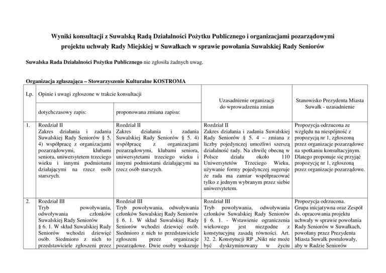 Wyniki konsultacji z Suwalską Radą Działalności Pożytku Publicznego i organizacjami pozarządowymi projektu uchwały Rady Miejskiej w Suwałkach w sprawie powołania Suwalskiej Rady Seniorów Suwalska Rada Działalności Pożytku Publicznego nie zgłosiła żadnych uwag. Organizacja zgłaszająca – Stowarzyszenie Kulturalne KOSTROMA Lp. Opinie i uwagi zgłoszone w trakcie konsultacji Uzasadnienie organizacji do wprowadzenia zmian Stanowisko Prezydenta Miasta Suwałk - uzasadnienie dotychczasowy zapis: proponowana zmiana zapisu: 1. Rozdział II Zakres działania i zadania Suwalskiej Rady Seniorów § 5. 4) współpracę z organizacjami pozarządowymi, klubami seniora, uniwersytetem trzeciego wieku i innymi podmiotami działającymi na rzecz osób starszych. Rozdział II Zakres działania i zadania Suwalskiej Rady Seniorów § 5. 4) współpracę z organizacjami pozarządowymi, klubami seniora, uniwersytetami trzeciego wieku i innymi podmiotami działającymi na rzecz osób starszych. Rozdział II Zakres działania i zadania Suwalskiej Rady Seniorów § 5. 4 – zmiana z liczby pojedynczej umożliwi szerszą działalność rady. Na chwilę obecną w Polsce działa około 110 Uniwersytetów Trzeciego Wieku, używanie formy pojedynczej sugeruje że rada ma zamiar współpracować tylko z jednym wybranym przez siebie uniwersytetem. Propozycja odrzucona ze względu na niespójność z propozycją nr 1, zgłoszoną przez organizacje pozarządowe na spotkaniu konsultacyjnym. Dlatego proponuje się przyjąć propozycję nr 1, zgłoszoną przez organizacje pozarządowe. 2. Rozdział III Tryb powoływania, odwoływania członków Suwalskiej Rady Seniorów § 6. 1. W skład Suwalskiej Rady Seniorów wchodzi dziewięć osób. Siedmioro z nich to przedstawiciele zgłoszeni przez Rozdział III Tryb powoływania, odwoływania członków Suwalskiej Rady Seniorów § 6. 1. W skład Suwalskiej Rady Seniorów wchodzi dziewięć osób. Siedmioro z nich to przedstawiciele zgłoszeni przez organizacje pozarządowe. Dwie osoby wskazuje Rozdział III Tryb powoływania, odwoływania członków Suwalskiej Rady Seniorów § 6. 1. - Wstawienie ograniczenia wiekowego jest niezgodne z konstytucyjną zasadą równości. Art. 32. 2. Konstytucji RP „Nikt nie może być dyskryminowany w życiu Propozycja odrzucona. Grupa inicjatywna oraz Zespół ds. opracowania projektu uchwały w sprawie powołania Rady Seniorów w Suwałkach, powołany przez Prezydenta Miasta Suwałk postulowały, aby w Radzie Seniorów 2 organizacje pozarządowe i inne Prezydent Miasta Suwałk. podmioty działające na rzecz osób starszych. Dwie osoby wskazuje Prezydent Miasta Suwałk. Co najmniej pięć osób w Suwalskiej Radzie Seniorów musi mieć powyżej 60 lat. politycznym, społecznym lub gospodarczym z jakiejkolwiek przyczyny.” Zapis w proponowanej formie ewidentnie zaprzecza zasadzie równości, ograniczając członkostwo w radzie ze względu na wiek. Należy usunąć zapis „i inne podmioty działające na rzecz osób starszych” gdyż nie ma on sprecyzowania prawnego. Innym podmiotem są np. grupy nieformalne, a zapis w tym brzmieniu może powodować nadużycia. znaleźli się przede wszystkim seniorzy. Zapis zaproponowany w projekcie uchwały gwarantuje, że co najmniej połowę Rady będą stanowiły osoby starsze, a jednocześnie pozwala na udział w Suwalskiej Radzie Seniorów osobom młodszym ze środowisk, działających na rzecz seniorów. Zarzut o „dyskryminacji” można odwrócić. Mianowicie gdyby seniorzy nie mieli zagwarantowanych choćby kilku miejsc w Suwalskiej Radzie Seniorów, wtedy mogliby mówić o ich dyskryminacji. A Suwalska Rada Seniorów, zgodnie z zapisami w projekcie uchwały ma przede wszystkim reprezentować osoby starsze. Natomiast sformułowanie „inne podmioty działające na rzecz osób starszych” jest celowo sformułowaniem pojemnym, żeby nie wykluczyć żadnych grup społecznych, związanych z seniorami. Obejmuje np. kluby seniora, sekcję emerytów i rencistów Związku Nauczycielstwa Polskiego i inne. Tworzenie zamkniętego 3 katalogu podmiotów uprawnionych do wyborów i udziału w Suwalskiej Radzie Seniorów może spowodować, że jakieś grupy zostaną pominięte. Uściślenie, że podmioty muszą prowadzić działalność na rzecz seniorów gwarantuje, że będą to podmioty faktycznie związane z seniorami. 3. Rozdział III Tryb powoływania, odwoływania członków Suwalskiej Rady Seniorów § 6. 2. Kandydatów na członków Suwalskiej Rady Seniorów, zwanych dalej kandydatami, zgłaszają organizacje pozarządowe i inne podmioty działające na rzecz osób starszych, na formularzu Karty zgłoszenia kandydata na członka do Suwalskiej Rady Seniorów, stanowiącym załącznik nr 1 do niniejszego Statutu. Seniorzy mogą zgłaszać kandydatury za pośrednictwem tych podmiotów. Karty zgłoszenia należy wysłać do Pełnomocnika Prezydenta Miasta ds. Współpracy z Organizacjami Pozarządowymi, Urząd Miejski, ul. A. Rozdział III Tryb powoływania, odwoływania członków Suwalskiej Rady Seniorów § 6. 2. Kandydatów na członków Suwalskiej Rady Seniorów, zwanych dalej kandydatami, zgłaszają organizacje pozarządowe, na formularzu Karty zgłoszenia kandydata na członka do Suwalskiej Rady Seniorów, stanowiącym załącznik nr 1 do niniejszego Statutu. Seniorzy mogą zgłaszać kandydatury za pośrednictwem tych podmiotów. Karty zgłoszenia należy wysłać do Pełnomocnika Prezydenta Miasta ds. Współpracy z Organizacjami Pozarządowymi, Urząd Miejski, ul. A. Mickiewicza 1, 16-400 Suwałki lub złożyć w Kancelarii Ogólnej Urzędu Miejskiego, ul. A. Mickiewicza 1, 16-400 Suwałki. Rozdział III Tryb powoływania, odwoływania członków Suwalskiej Rady Seniorów § 6. 2. - Usunięcie zwrotu „i inne podmioty działające na rzecz osób starszych” w związku z brakiem ścisłej definicji innych podmiotów, może prowadzić to do nadużyć np. poprzez zgłaszanie kandy