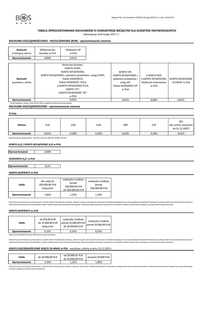 Załącznik Nr 2 do Uchwały Nr 205/2015 Zarządu BOŚ S.A. z dnia 19.05.2015 r. TABELA OPROCENTOWANIA RACHUNKÓW O CHARAKTERZE BIEŻĄCYM DLA KLIENTÓW INDYWIDUALNYCH (obowiązuje od 8 lutego 2017 r.) RACHUNKI OSZCZĘDNOŚCIOWO - ROZLICZENIOWE (ROR) - oprocentowanie zmienne Rachunki w bieżącej ofercie EKOkonto bez Kosztów w PLN EKOkonto VIP w PLN Oprocentowanie 0,00% 0,01% Konto bez Kantów1), KONTO START, KONTO WYJATKOWE, KONTO WYJĄTKOWE z pakietem produktów i usług START, Pakiet EKOKONTO, Pakiet EKOKONTO PLUS, e-KONTO WYJĄTKOWE PLUS, KONTO "07", KONTO WYJĄTKOWE "07" w PLN 0,01% Rachunki wycofane z oferty Oprocentowanie 1) KONTO VIP, KONTO WYJĄTKOWE z pakietem produktów i usług VIP, Pakiet EKOKONTO VIP w PLN e-KONTO BOŚ, e-KONTO WYJĄTKOWE, EKOkonto internetowe w PLN KONTO WYJĄTKOWE STUDENT w PLN 0,01% 0,00% 0,01% Konto wycofane z oferty z dniem 20.01.2016 z wyjątkiem oferty Karta Dużej Rodziny RACHUNKI OSZCZĘDNOŚCIOWE - oprocentowanie zmienne A'vista Waluta PLN USD EUR GBP CHF SEK (dla umów zawartych do 31.12.2007) Oprocentowanie 0,01% 0,20% 0,20% 0,20% 0,20% 0,01% Saldo dla salda do 100.000,00 PLN (włącznie) nadwyżka środków ponad 100.000,00 PLN do 500.000,00 PLN nadwyżka środków ponad 500.000,00 PLN Oprocentowanie 1,00% 1,25% 1,50% Mininalna kwota wpłaty wynosi : 100 PLN, 100 USD, 100 EUR, 50 GBP, 150 CHF KONTO H2O / KONTO WYJĄTKOWE H2O w PLN Oprocentowanie 2,00% EKOKONTO H2O w PLN Oprocentowanie 0,1% KONTO EKOPROFIT w PLN Rachunek oprocentowany jest progresywnie, a odsetki należne Posiadaczowi rachunku, obliczane są jako suma odsetek naliczonych od środków znajdujących się w poszczególnych przedziałach kwotowych, według stawek oprocentowania określonych w Tabeli oprocentowania dla tych przedziałów. Odsetki według stawki oprocentowania dla drugiego i kolejnych progów kwotowych są naliczane od nadwyżki środków, ponad środki znajdujące się w poprzednim progu kwotowym KONTO EKOPROFIT w EUR Saldo od 250,00 EUR do 10.000,00 EUR (włącznie) Oprocentowanie 0,15% nadwyżka środków nadwyżka środków ponad 10.000,00 EUR ponad 20.000,00 EUR do 20.000,00 EUR 0,35% 0,55% Saldo Konta EKOPROFIT poniżej 250 EUR jest nieoprocentowane Rachunek oprocentowany jest progresywnie, a odsetki należne Posiadaczowi rachunku, obliczane są jako suma odsetek naliczonych od środków znajdujących się w poszczególnych przedziałach kwotowych, według stawek oprocentowania określonych w Tabeli oprocentowania dla tych przedziałów. Odsetki według stawki oprocentowania dla drugiego i kolejnych progów kwotowych są naliczane od nadwyżki środków, ponad środki znajdujące się w poprzednim progu kwotowym KONTO OSZCZĘDNOŚCIOWE WIĘCEJ ZA MNIEJ w PLN - wycofane z oferty w dniu 13.11.2015 r. Saldo do 20.000,00 PLN Oprocentowanie 1,50% od 20.000,01 PLN do 50.000,00 PLN 1,25% powyżej 50.000 PLN 1,00% Rachunek oprocentowany jest degresywnie, a odsetki należne Posiadaczowi rachunku, obliczane są dla całości środków ulokowanych na Rachunku, według stawki oprocentowania określonej w Tabeli oprocentowania dla najwyższego progu kwotowego, w którym znajdują się środki na danym Rachunku.