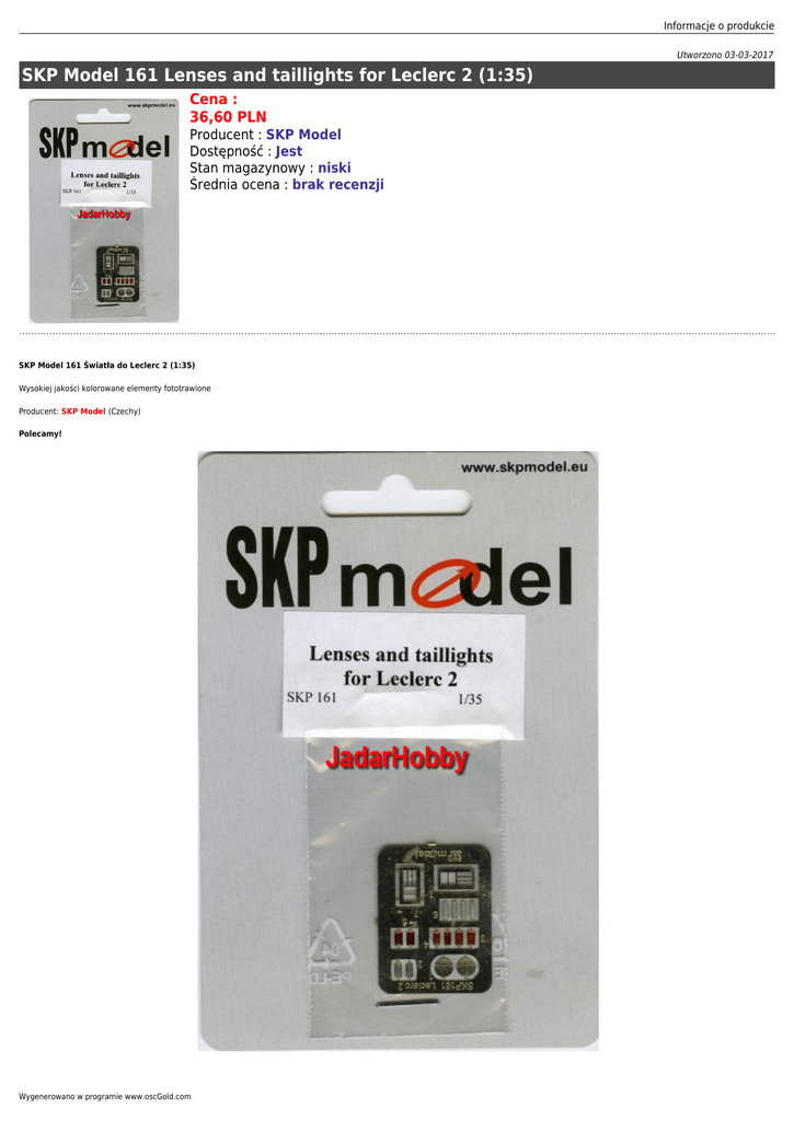 Informacje o produkcie Utworzono 03-03-2017 SKP Model 161 Lenses and taillights for Leclerc 2 (1:35) Cena : 36,60 PLN Producent : SKP Model Dostępność : Jest Stan magazynowy : niski Średnia ocena : brak recenzji SKP Model 161 Światła do Leclerc 2 (1:35) Wysokiej jakości kolorowane elementy fototrawione Producent: SKP Model (Czechy) Polecamy! Wygenerowano w programie www.oscGold.com Ważne informacje: Prosimy o dokładne zapoznanie się z zasadami działania naszego sklepu. To bardzo ważne i pozwoli na uniknięcie nieporozumień związanych z koniecznością oczekiwania na przesyłkę. Wszystkie zamówienia realizujemy w kolejności zgłoszeń. Wybranie "przesyłka priorytetowa" jako sposobu wysyłki nie oznacza, że paczka zostanie wysłana na drugi dzień. To tylko rodzaj usługi pocztowej. Firma Jadar-Model jest właścicielem dwóch sklepów. Jeden z nich to sklep internetowy, drugi zaś jest prawdziwy i mieści się w Warszawie, stolicy Polski. Te same modele i akcesoria oferowane w sklepie internetowym sprzedawane są w jednocześnie w obu sklepach. Ponieważ nasza oferta jest bardzo duża nie mamy magazynu z wielką ilością tych samych przedmiotów. Może zdarzyć się, że model, który chcesz kupić został sprzedany w drugim sklepie. Wtedy zostaniesz powiadomiony emailem, że realizacja Twojego zamówienia będzie dłuższa, ponieważ musimy uzupełnić magazyn i czekamy na dostawę od producenta. Prosimy o cierpliwość i wyrozumiałość. Nie ponosimy odpowiedzialności za różnicę w zawartości pudełka w stosunku do prezentowanego zdjęcia. Zdjęcia są zazwyczaj reklamówkami i mogą zawierać również inne części, które nie wchodzą w skład danego produktu. Salon Modelarski Jadar-Model Ul. Jagiellońska 58, 03-468 Warszawa (przy Pl.Hallera) tel.(0 22) 403-34-30 (w sprawie zamówień prosimy dzwonić: (0 22) 620-05-39) Tutaj jesteśmy - kliknij poniższy link: Warszawa, Jagiellońska 58 sklep jest czynny w godz.: pon.-pt. 11.oo 19.oo sobota 10.oo 14.oo