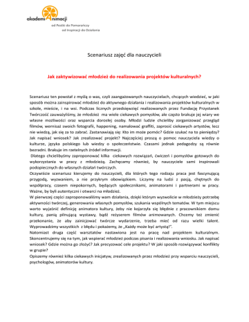 od Pestki do Pomaraoczy od Inspiracji do Działania Scenariusz zajęd dla nauczycieli Jak zaktywizowad młodzież do realizowania projektów kulturalnych? Scenariusz ten powstał z myślą o was, czyli zaangażowanych nauczycielach, chcących wiedzied, w jaki sposób można zainspirowad młodzież do aktywnego działania i realizowania projektów kulturalnych w szkole, mieście, i na wsi. Podczas licznych przedsięwzięd realizowanych przez Fundację Przystanek Twórczośd zauważyliśmy, że młodzież ma wiele ciekawych pomysłów, ale często brakuje jej wiary we własne możliwości oraz wsparcia dorosłej osoby. Młodzi ludzie chcieliby zorganizowad przegląd filmów, wernisaż swoich fotografii, happening, namalowad graffiti, zaprosid ciekawych artystów, lecz nie wiedzą, jak się za to zabrad. Zastanawiają się: Kto im może pomóc? Gdzie szukad na to pieniędzy? Jak napisad wniosek? Jak zrealizowad projekt? Najczęściej proszą o pomoc nauczyciela wiedzy o kulturze, języka polskiego lub wiedzy o społeczeostwie. Czasami jednak pedagodzy są równie bezradni. Brakuje im rzetelnych źródeł informacji. Dlatego chcielibyśmy zaproponowad kilka ciekawych rozwiązao, dwiczeo i pomysłów gotowych do wykorzystania w pracy z młodzieżą. Zachęcamy również, by nauczyciele sami inspirowali podopiecznych do własnych działao twórczych. Oczywiście scenariusz kierujemy do nauczycieli, dla których tego rodzaju praca jest fascynującą przygodą, wyzwaniem, a nie przykrym obowiązkiem. Liczymy na ludzi z pasją, chętnych do współpracy, czasem niepokornych, będących społecznikami, animatorami i partnerami w pracy. Ważne, by byli autentyczni i otwarci na młodzież. W pierwszej części zaproponowaliśmy wam działania, dzięki którym wyzwolicie w młodzieży potrzebę aktywności twórczej, generowania własnych pomysłów, szukania wspólnych tematów. W tym miejscu warto wyjaśnid definicję animatora kultury, żeby nie kojarzyła się błędnie z pracownikiem domu kultury, panią pilnującą wystawy, bądź reżyserem filmów animowanych. Chcemy też zmienid przekonanie, że aby zainicjowad twórcze wydarzenie, trzeba mied od razu wielki talent. Wyprowadzimy wszystkich z błędu i pokażemy, że „Każdy może byd artystą!”. Natomiast druga częśd warsztatów nastawiona jest na pracę nad projektem kulturalnym. Skoncentrujemy się na tym, jak wspierad młodzież podczas pisania i realizowania wniosku. Jak napisad wniosek? Gdzie można go złożyd? Jak precyzowad cele projektu? W jaki sposób rozwiązywad konflikty w grupie? Opiszemy również kilka ciekawych inicjatyw, zrealizowanych przez młodzież przy wsparciu nauczycieli, psychologów, animatorów kultury. od Pestki do Pomaraoczy od Inspiracji do Działania JAK ZAINSPIROWAD MŁODZIEŻ DO DZIAŁAO TWÓRCZYCH? Celem zasadniczym tego warsztatu jest pokazanie młodzieży, czym jest animacja kultury, na przykładzie konkretnych projektów, filmów i zadao. Warto zaprezentowad projekty realizowane przez młodzież w małych miastach i wsiach z całej Polski. Dodatkowo można na zajęcia zaprosid osobę zajmującą się animacją kultury, która opowie o swoich działaniach. Zachęcamy także do aktywnych dwiczeo, bazujących na pasjach uczniów, które jednocześnie pobudzą kreatywne myślenie. Pokażmy im, że aby zainicjowad twórczą sytuację, potrzebują jedynie chęci, odwagi, kolorowego papieru i wyobraźni. Poznajemy potencjał grupy. Na wstępie warsztatów warto dowiedzied się, jaki potencjał tkwi w grupie, gdyż to on będzie bazą wyjściową do dalszej pracy i działao. Warto, by każda z osób powiedziała, jakie ma preferencje, czym zajmuje się w wolnym czasie, czy interesuje się kulturą, a może jest wolontariuszem pracującym w hospicjum. Uwagi techniczne: 1.Poświęd na warsztaty kilka godzin, bez przerywania twórczego procesu dzwonkiem po 45 minutach lekcyjnych. 2. Sala powinna dawad komfort, warto wystawid ławki, by nie kojarzyły się uczniom z lekcją. 3. Zadbaj o to, by w sali znalazły się: rzutnik multimedialny, duże kartki papieru i flamastry. 4. Jeśli masz taką możliwośd, przeprowadź zajęcia poza szkołą: pobliski dom kultury, galeria, świetlica młodzieżowa to świetne miejsca. Młodzież z małych miejscowości często mówi o swoich dokonaniach, pasjach, zainteresowaniach z dużą skromnością i skrępowaniem. Ważne więc, by prowadzący ośmielił grupę, stworzył przyjazny klimat, sytuację bezpieczną dla wszystkich. Istotne, by dopytywał, zachęcał do otwartości, ale nie był wścibski. Należy pamiętad, że nie każdy musi mied ochotę na uzewnętrznienie swoich zainteresowao. Np. Maciek powiedział, że interesuje się breakdancem. Warto więc zapytad: czy samodzielnie uczy się taoczyd, a może należy do jakiejś grupy? ile godzin w tygodniu poświęca na taniec? od jak dawna taoczy? jakie emocje mu towarzyszą, gdy taoczy? Cztery koła. Co nas łączy, a co różni? Prosimy młodzież o zarysowanie na kartce czterech kół i wypełnienie ich w środku (graficznie, bądź pisemnie). Moje ulubione: 1. miejsce 2. kolor 3. filmy/książki 4. zajęcie Następnie aranżujemy wystawę i oglądamy obrazki, zastanawiając się nad podobieostwami i różnicami w grupie. To na nich młodzież będzie bazowad, realizując projekty. Wyjaśnienie definicji: animator kultury, animacja społeczna, idea animacji kultury, organizacja pozarządowa. Spotkanie z animatorem kultury. Interesujące może okazad się bezpośrednie spotkanie z animatorem kultury, który opowie o swoich działaniach, sposobach aktywizacji środowiska lokalnego, powodzeniach i przeszkodach. Młodzież będzie miała okazję zapytad o interesujące ich zagadnienia. Ponadto taki pasjonat może „zarazid” młodzież swoim entuzjazmem. Jeśli nie znasz w swojej miejscowości animatora kultury, zapytaj o taką osobę w Domu Kultury, Urzędzie Miasta, organizacjach pozarządowych, poszukaj w Internec