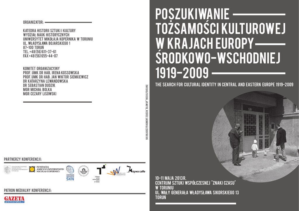 Poszukiwanie tożsamości kulturowej w krajach Europy Środkowo-Wschodniej 1919-2009 Organizator: Komitet Organizacyjny Prof. UMK dr hab. Irena Kossowska Prof. UMK dr hab. jan Wiktor Sienkiewicz Dr Katarzyna Lewandowska Dr Sebastian Dudzik Mgr Michał Bolka Mgr Cezary Lisowski na okładce fragment zdjęcia "Blow Up" Nicu Ilfoveanu Katedra Historii Sztuki i Kultury Wydział Nauk Historycznych Uniwersytet Mikołaja Kopernika w Toruniu ul. Władysława Bojarskiego 1 87-100 Toruń tel. +48 (56) 611-37-61 fax +48 (56) 655-44-07 The search for cultural identity in Central and Eastern Europe 1919-2009 partnerzy konferencji : patron medialny konferencji : 10-11 maja 2013 r. Centrum Sztuki Współczesnej "Znaki Czasu" w Toruniu ul. Wały Generała Władysława Sikorskiego 13 Toruń Program 1. dzień - 10 maja 9.00-9.30 Powitanie uczestników konferencji przez Kierownika Katedry Historii Sztuki i Kultury, dr hab. prof. UMK Ryszarda Mączyńskiego Słowo wstępne dr hab. prof. UMK Ireny Kossowskiej i dr hab. prof. UMK Jana Wiktora Sienkiewicza 9.30-10.50 Europa Środowo-Wschodnia: polityczny projekt czy geokulturowy region? Katarzyna Murawska-Muthesius (London, University of London), Ego idealne Europy Środkowo-Wschodniej Tomasz Gryglewicz (Kraków, Uniwersytet Jagielloński), Nieistnienie – cecha konstytutywna Europy Środkowo-Wschodniej – w polskiej sztuce 1919-2012 Agnieszka Chmielewska (Warszawa, Uniwersytet Warszawski), Tożsamość narodowa i sztuka: przypadek II Rzeczypospolitej Magdalena Radomska (Poznań, Uniwersytet Adama Mickiewicza), Kapitalizm i inwestycje popędu w postkomunistycznej Europie 10.50-11.20 - dyskusja 11.20-11.50 - przerwa 11.50-13.10 Zmienne perspektywy historiografii Laima Laučkaitė-Surgailienė (Vilnius, Lithuanian Institute for Culture Research), Crossing ‘alien’ national boundaries: on the research of identity of Vilnius’ art Kristiāna Ābele (Riga, Latvian Academy of Art), Between Homeland and Outland: 20th century biographies beyond borders in Latvian art history Swietłana Czerwonnaja (Toruń, Uniwersytet Mikołaja Kopernika), Poszukiwania i sposoby wyrazu tożsamości narodowej w litewskiej sztuce na uchodźstwie po II wojnie światowej Irena Kossowska (Toruń, Uniwersytet Mikołaja Kopernika), Sztuka estońska w II i III RP: recepcja paradygmatu narodowej tożsamości 13.10-13.40 – dyskusja 13.40-15.00 – przerwa 15.00-16.00 Wielonarodowość czy wielokulturowość? Giedrė Jankevičiūtė (Vilnius, Lithuanian Institute for Culture Research), Oratorium Vilnense: the role of an image in the construction of place identity Maciej Gugała (Warszawa, Instytut Sztuki PAN i Stowarzyszenie Żydowski Instytut Historyczny w Polsce), Balthus – Polak? Identyfikacja narodowa „ponadnarodowego” artysty Izabela Piskorska (Toruń, Uniwersytet Mikołaja Kopernika), Inny to ja – rola Obcego w konstruowaniu tożsamości kulturowej 16.00-16.20 – dyskusja 16.20-17.20 Pamięć w sztuce po przełomach historycznych Magdalena Howorus-Czajka (Gdańsk, Uniwersytet Gdański), Pomiędzy indywidualnym doświadczeniem traumy a pamięcią zbiorową – reinterpretacje przeszłości w pomnikach martyrologicznych Wiktora Tołkina jako przykład konsensusu światopoglądowego, religijnego i narodowościowego Anna Steliga (Rzeszów, Uniwersytet Rzeszowski), Zbiorowa wyobraźnia i pamięć czyli o historii i jej znaczeniu dla współczesności w twórczości polskich artystów po 2000 roku Natasza Korczarowska-Różycka (Łódź, Uniwersytet Łódzki), Nowa historia/stare paradygmaty. Historia a tożsamość narodowa w polskim filmie fabularnym 1989-2009 17.20-17.40 – dyskusja 17.40-18.00 – przerwa 18.00-19.20 Autodefinicja artystyczna w przestrzeni publicznej Magdalena Zdrenka-Ciałkowska (Toruń, Uniwersytet Mikołaja Kopernika), „Oszczędność to droga do bogactwa …” Polska sztuka reklamy w nurcie narodowym Hubert Bilewicz, Jacek Friedrich (Gdańsk, Uniwersytet Gdański), Między nacjonalizmem a modernizmem: wobec tradycji wernakularnych w dziejach polskiego designu 1919-2009 Przemysław Strożek (Warszawa, Instytut Sztuki PAN), Lenin i Chaplin. O bohaterach walczącego proletariatu w sztuce awangard Europy Środkowej i Wschodniej Maria Niemyjska (Toruń, Uniwersytet Mikołaja Kopernika), Przestrzenne przewartościowanie a sztuka polska lat sześćdziesiątych XX wieku konferencji 19.20-19.50 – dyskusja i zamknięcie 1. dnia konferencji 20.30 – kolacja dla referentów w restauracji Krzywa Caffe, ul. Pod Krzywą Wieżą 1 2. dzień - 11 maja 9.00-10.20 Tożsamość narodowa i tożsamość lokalna w architekturze Helena Postawka-Lech (Kraków, Międzynarodowe Centrum Kultury), Strategie artystyczne na granicach II RP – działalność Korpusu Ochrony Pogranicza i Związku Obrony Kresów Zachodnich Renāte Čaupale, (Rēzekne, Rēzekne Higher Education Institution), Inspiracje folklorystyczne w architekturze modernistycznej i art déco na Łotwie Elżbieta Błotnicka-Mazur (Lublin, Katolicki Uniwersytet Lubelski Jana Pawła II), „Dwór” w mieście – realizacja tęsknoty za „swojskością” w architekturze międzywojennego Lublina Julia Sowińska-Heim (Łódź, Uniwersytet Łódzki), Architektura Łodzi – próby reinterpretacji i tworzenia nowego wizerunku miasta 10.20-10.50 – dyskusja 10.50 -11.20 – przerwa 11.20-12.20 Idiomy żydowskiej tożsamości Małgorzata Stolarska-Fronia (Warszawa, Muzeum Historii Żydów Polskich), Nihilizm i objawienie. Dyskursywne poszukiwanie tożsamości przez artystów żydowskich w latach 1918-1939 Lidia Wociór (Lublin, Uniwersytet Marii Curie-Skłodowskiej), Tożsamość żydowska zawarta w treściach symbolicznych aron ha-kodesz w Wielkiej Synagodze we Włodawie Inese Kundziņa (Riga, Art Academy of Latvia, Ethnographic Open Air Museum), Written evidence from the 1930s-1990s about Jewish people as travelling painters in 19th century Latvian vernacular culture 12.20-12.40 – dyskusja 12.40-14.00 - przerwa 1