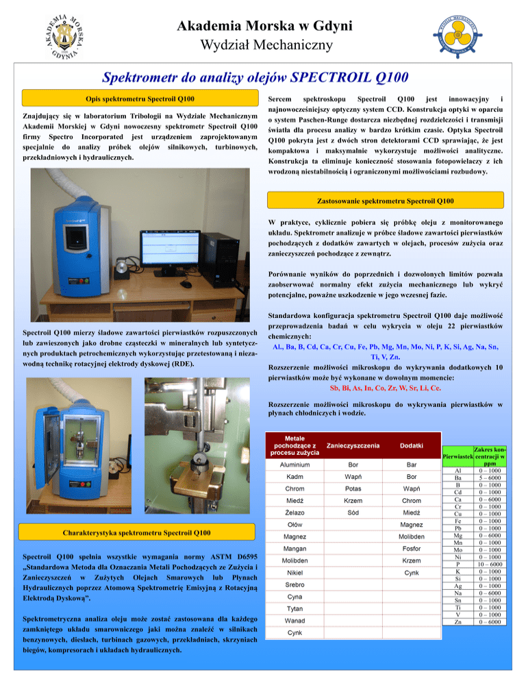 Akademia Morska w Gdyni Wydział Mechaniczny Spektrometr do analizy olejów SPECTROIL Q100 Opis spektrometru Spectroil Q100 Znajdujący się w laboratorium Tribologii na Wydziale Mechanicznym Akademii Morskiej w Gdyni nowoczesny spektrometr Spectroil Q100 firmy Spectro Incorporated jest urządzeniem zaprojektowanym specjalnie do analizy próbek olejów silnikowych, turbinowych, przekładniowych i hydraulicznych. Sercem spektroskopu Spectroil Q100 jest innowacyjny i najnowocześniejszy optyczny system CCD. Konstrukcja optyki w oparciu o system Paschen-Runge dostarcza niezbędnej rozdzielczości i transmisji światła dla procesu analizy w bardzo krótkim czasie. Optyka Spectroil Q100 pokryta jest z dwóch stron detektorami CCD sprawiając, że jest kompaktowa i maksymalnie wykorzystuje możliwości analityczne. Konstrukcja ta eliminuje konieczność stosowania fotopowielaczy z ich wrodzoną niestabilnością i ograniczonymi możliwościami rozbudowy. Zastosowanie spektrometru Spectroil Q100 W praktyce, cyklicznie pobiera się próbkę oleju z monitorowanego układu. Spektrometr analizuje w próbce śladowe zawartości pierwiastków pochodzących z dodatków zawartych w olejach, procesów zużycia oraz zanieczyszczeń pochodzące z zewnątrz. Porównanie wyników do poprzednich i dozwolonych limitów pozwala zaobserwować normalny efekt zużycia mechanicznego lub wykryć potencjalne, poważne uszkodzenie w jego wczesnej fazie. Spectroil Q100 mierzy śladowe zawartości pierwiastków rozpuszczonych lub zawieszonych jako drobne cząsteczki w mineralnych lub syntetycznych produktach petrochemicznych wykorzystując przetestowaną i niezawodną technikę rotacyjnej elektrody dyskowej (RDE). Standardowa konfiguracja spektrometru Spectroil Q100 daje możliwość przeprowadzenia badań w celu wykrycia w oleju 22 pierwiastków chemicznych: Al., Ba, B, Cd, Ca, Cr, Cu, Fe, Pb, Mg, Mn, Mo, Ni, P, K, Si, Ag, Na, Sn, Ti, V, Zn. Rozszerzenie możliwości mikroskopu do wykrywania dodatkowych 10 pierwiastków może być wykonane w dowolnym momencie: Sb, Bi, As, In, Co, Zr, W, Sr, Li, Ce. Rozszerzenie możliwości mikroskopu do wykrywania pierwiastków w płynach chłodniczych i wodzie. Charakterystyka spektrometru Spectroil Q100 Spectroil Q100 spełnia wszystkie wymagania normy ASTM D6595 „Standardowa Metoda dla Oznaczania Metali Pochodzących ze Zużycia i Zanieczyszczeń w Zużytych Olejach Smarowych lub Płynach Hydraulicznych poprzez Atomową Spektrometrię Emisyjną z Rotacyjną Elektrodą Dyskową”. Spektrometryczna analiza oleju może zostać zastosowana dla każdego zamkniętego układu smarowniczego jaki można znaleźć w silnikach benzynowych, dieslach, turbinach gazowych, przekładniach, skrzyniach biegów, kompresorach i układach hydraulicznych. Zakres konPierwiastek centracji w ppm Al 0 – 1000 Ba 5 – 6000 B 0 – 1000 Cd 0 – 1000 Ca 0 – 6000 Cr 0 – 1000 Cu 0 – 1000 Fe 0 – 1000 Pb 0 – 1000 Mg 0 – 6000 Mn 0 – 1000 Mo 0 – 1000 Ni 0 – 1000 P 10 – 6000 K 0 – 1000 Si 0 – 1000 Ag 0 – 1000 Na 0 – 6000 Sn 0 – 1000 Ti 0 – 1000 V 0 – 1000 Zn 0 – 6000