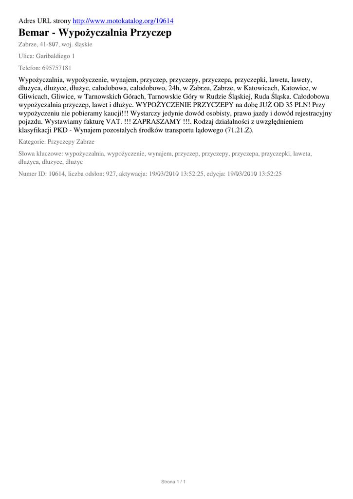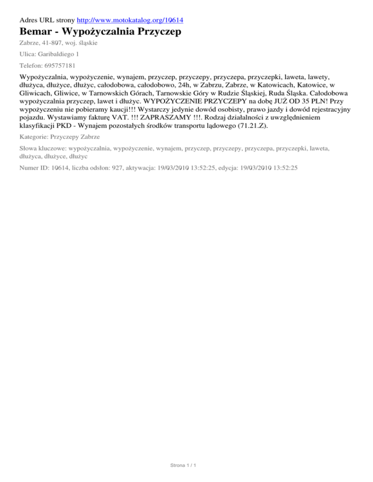Bemar - Wypozyczalnia Przyczep, Zabrze, Garibaldiego 1