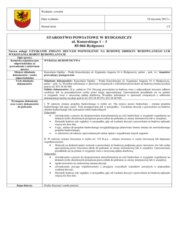 Wydanie: czwarte Data wydania: Strona/stron 10 stycznia 2013 r. 1/2 STAROSTWO POWIATOWE W BYDGOSZCZY ul. Konarskiego 1 – 3 85-066 Bydgoszcz Nazwa usługi: UZYSKANIE ZMIANY DECYZJI POZWOLENIU NA BUDOWĘ OBIEKTU BUDOWLANEGO LUB WYKONANIA ROBÓT BUDOWLANYCH Opis sprawy Komórka organizacyjna odpowiedzialna za prowadzenie i załatwianie sprawy Miejsce składania dokumentów / osoba odpowiedzialna Tryb składania dokumentów Wymagane dokumenty oraz wzory dokumentów do pobrania WYDZIAŁ BUDOWNICTWA Kancelaria Ogólna – Punkt Kancelaryjny ul. Zygmunta Augusta 16 w Bydgoszczy, parter – pok. 1a / inspektor prowadzący postępowanie Składanie dokumentów: Kancelaria Ogólna – Punkt Kancelaryjny ul. Zygmunta Augusta 16 w Bydgoszczy, parter – pok. 1a. Wszelkie informacje w sprawach związanych z wnioskiem pozwolenie na budowę można uzyskać pod nr tel. 052 58 40 948 Odbiór dokumentów: II p., pokój nr 210. Decyzję pozwolenia na budowę wraz z załącznikami inwestor odbiera osobiście lub za pośrednictwem osoby przez niego upoważnionej. Upoważnienie przedkłada się na piśmie w oryginale wraz z uiszczoną opłatą skarbową. Wszelkie informacje w sprawach związanych z odbiorem dokumentacji można uzyskać pod nr tel. 052 58 40 953, 052 58 40 948 I. W zakresie zmiany projektu budowlanego w trybie art. 36a ustawy prawo budowlane - zmiana projektu budowlanego lub jego części. Tryb postępowania jak w przypadku : Uzyskanie decyzji o pozwoleniu na budowę obiektu budowlanego lub wykonania robót budowlanych Załączniki: oświadczenie o prawie do dysponowania nieruchomością na cele budowlane w oryginale wypełnione na drukach ściśle określonych przepisem prawa (druk do pobrania ze strony internetowej lub w urzędzie), Dziennik budowy (do wglądu), w przypadku, gdy od wydania decyzji o pozwoleniu na budowę upłynęło więcej niż dwa lata. 4 egz,. aneksu do projektu budowlanego uwzględniającego planowane istotne zmiany do zatwierdzonego projektu budowlanego; w zależności od zakresu wprowadzonych zmian opinie i uzgodnienia innych organów II. W zakresie zmiany Inwestora w trybie art. 155 K.p.a. - zmiana inwestora w części inwestycji lub dopisanie współinwestorów. Wniosek na drukach (patrz wniosek o pozwolenie na budowę) podpisany przez inwestora /ów lub osobę upoważnioną przez Inwestora (druk do pobrania ze strony internetowej lub w urzędzie). Upoważnienie przedkłada się na piśmie w oryginale wraz z uiszczoną opłata skarbową. Załączniki: oświadczenie o prawie do dysponowania nieruchomością na cele budowlane w oryginale wypełnione na drukach ściśle określonych przepisem prawa (druk do pobrania ze strony internetowej lub w urzędzie), zgoda inwestora na zamierzoną zmianę decyzji, oświadczenie nowego współinwestora o przyjęciu wszystkich warunków zawartych w poprzednio wydanej decyzji, Dziennik budowy (do wglądu), w przypadku, gdy od wydania decyzji o pozwoleniu na budowę upłynęło więcej niż dwa lata. Kogo dotyczy Osoby fizyczne i osoby prawne Wydanie: czwarte Data wydania: Strona/stron Termin i sposób załatwienia sprawy Podstawa prawna Ewentualne opłaty Tryb odwoławczy Informacje dodatkowe 10 stycznia 2013 r. 2/2 Termin załatwienia sprawy: Do 65 dni od dnia złożenia wniosku. Sprawy proste są załatwianie w terminie krótszym. Do terminu rozpatrzenia wniosku nie wlicza się terminów przewidzianych przepisami prawa do dokonania określonych czynności, okresów zawieszania postępowania oraz okresów opóźnień spowodowanych z winy Inwestora, albo z przyczyn niezależnych od organu. Sposób załatwienia sprawy: W postępowaniu administracyjnym sprawdza się kompletność wniosku. W przypadku braków wzywa się wnioskodawcę do uzupełnienia wniosku w terminie 7 dni od dnia otrzymania wezwania. W sytuacji nie uzupełnienia wniosku we wskazanym terminie terminu sprawa pozostaje bez rozpatrzenia. W trakcie postępowania informacji udziela inspektor prowadzący postępowanie wskazany podczas składania wniosku. Postępowanie administracyjne kończy się wydaniem decyzji. Ustawa z dnia 7 lipca 1994 r. - prawo budowlane (tekst jednolity Dz.U. z 2010 r. Nr 243, poz. 1623 z późniejszymi zmianami). Kodeks postępowania administracyjnego (Dz.U. z 2000r. Nr 98, poz. 1071 z późniejszymi zmianami) Za wydanie decyzji - opłata skarbowa zgodnie z ustawą z dnia 16 listopada 2006 r. o opłacie skarbowej (Dz. U. Nr 225 z 2006 r. poz. 1635). Opłatę skarbową uiszcza się wraz ze składanym wnioskiem (wówczas opłata ta zostanie naliczona) na konto: Urząd Miasta Bydgoszczy, Wydział Podatków i Opłat, Bank Pekao S.A. nr rachunku: 52 1240 6960 3892 1000 0000 0000. Od decyzji przysługuje stronom postępowania odwołanie do Wojewody Kujawsko- Pomorskiego, w terminie 14 dni od dnia jej doręczenia. Odwołanie należy złożyć za pośrednictwem Starosty Bydgoskiego Prawo do dysponowania nieruchomością na cele budowlane - należy przez to rozumieć tytuł prawny wynikający z prawa własności, użytkowania wieczystego, zarządu, ograniczonego prawa rzeczowego albo stosunku zobowiązanego, przewidującego uprawnienia do wykonywania robót budowlanych. Historia zmian: Lp. 1. 2. 3. Opis zmiany W sekcji Miejsce składania dokumentów... oraz w sekcji Tryb składania dokumentów...wprowadza się zmiany: Punkt kancelaryjny ul. Zygmunta Augusta 16 w Bydgoszczy, II p. – pok. 213. Uaktualniono miejsce składania dokumentów – tj. Kancelaria Ogólna – Punkt Kancelaryjny ul. Zygmunta Augusta 16 w Bydgoszczy, parter – p. 1a. Uaktualniono również Dz.U. w którym opublikowano prawo budowlane. Uaktualniono nr konta bankowego, na które powinna być przekazywana opłata skarbowa.
