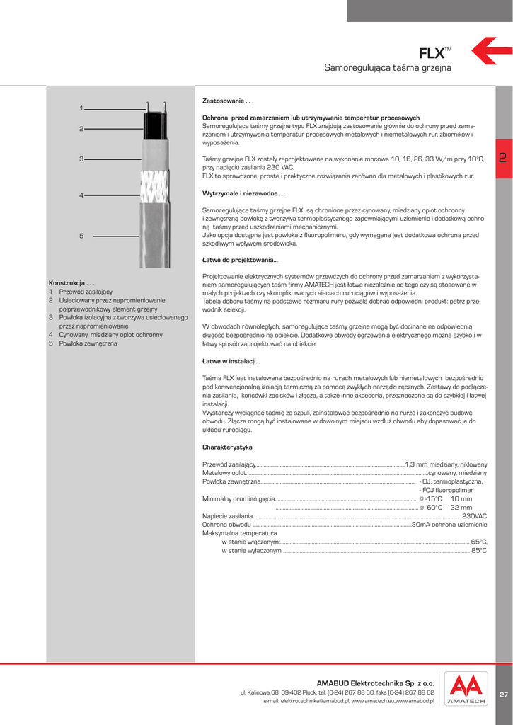 FLX TM Samoregulująca taśma grzejna 1 2 Zastosowanie . . . Ochrona przed zamarzaniem lub utrzymywanie temperatur procesowych Samoregulujące taśmy grzejne typu FLX znajdują zastosowanie głównie do ochrony przed zamarzaniem i utrzymywania temperatur procesowych metalowych i niemetalowych rur, zbiorników i wyposażenia. 3 Taśmy grzejne FLX zostały zaprojektowane na wykonanie mocowe 10, 16, 26, 33 W/m przy 10°C, przy napięciu zasilania 230 VAC. FLX to sprawdzone, proste i praktyczne rozwiązania zarówno dla metalowych i plastikowych rur. 4 Wytrzymałe i niezawodne … 5 2 Samoregulujące taśmy grzejne FLX są chronione przez cynowany, miedziany oplot ochronny i zewnętrzną powłokę z tworzywa termoplastycznego zapewniającymi uziemienie i dodatkową ochronę taśmy przed uszkodzeniami mechanicznymi. Jako opcja dostępna jest powłoka z fluoropolimeru, gdy wymagana jest dodatkowa ochrona przed szkodliwym wpływem środowiska. Łatwe do projektowania… Konstrukcja . . . 1 Przewód zasilający 2 Usieciowany przez napromieniowanie półprzewodnikowy element grzejny 3 Powłoka izolacyjna z tworzywa usieciowanego przez napromieniowanie 4 Cynowany, miedziany oplot ochronny 5 Powłoka zewnętrzna Projektowanie elektrycznych systemów grzewczych do ochrony przed zamarzaniem z wykorzystaniem samoregulujących taśm firmy AMATECH jest łatwe niezależnie od tego czy są stosowane w małych projektach czy skomplikowanych sieciach rurociągów i wyposażenia. Tabela doboru taśmy na podstawie rozmiaru rury pozwala dobrać odpowiedni produkt: patrz przewodnik selekcji. W obwodach równoległych, samoregulujące taśmy grzejne mogą być docinane na odpowiednią długość bezpośrednio na obiekcie. Dodatkowe obwody ogrzewania elektrycznego można szybko i w łatwy sposób zaprojektować na obiekcie. Łatwe w instalacji… Taśma FLX jest instalowana bezpośrednio na rurach metalowych lub niemetalowych bezpośrednio pod konwencjonalną izolacją termiczną za pomocą zwykłych narzędzi ręcznych. Zestawy do podłączenia zasilania, końcówki zacisków i złącza, a także inne akcesoria, przeznaczone są do szybkiej i łatwej instalacji. Wystarczy wyciągnąć taśmę ze szpuli, zainstalować bezpośrednio na rurze i zakończyć budowę obwodu. Złącza mogą być instalowane w dowolnym miejscu wzdłuż obwodu aby dopasować je do układu rurociągu. Charakterystyka Przewód zasilający.............................................................................................................1,3 mm miedziany, niklowany Metalowy oplot.....................................................................................................................................cynowany, miedziany Powłoka zewnętrzna................................................................................................................. - OJ, termoplastyczna, - FOJ fluoropolimer Minimalny promień gięcia........................................................................................................ @ -15°C 10 mm ........................................................................................................@ -60°C 32 mm Napiecie zasilania. .................................................................................................................................................... 230VAC Ochrona obwodu ....................................................................................................................30mA ochrona uziemienie Maksymalna temperatura w stanie włączonym:.......................................................................................................................................... 65°C, w stanie wyłaczonym ........................................................................................................................................ 85°C AMABUD Elektrotechnika Sp. z o.o. ul. Kalinowa 68, 09-402 Płock, tel. (0-24) 267 88 60, faks (0-24) 267 88 62 e-mail: [email protected], www.amatech.eu,www.amabud.pl 27 2 Samoregulujące wydzielanie ciepła przez taśmy zmienia się w zależności od temperatury otoczenia. Zmiany w temperaturze otoczenia są kompensowane wzdłuż całej długości ogrzewanej rury. Watów na metr FLX przy 230VAC Samoregulujące wydzielanie ciepła Temperatura zewnętrzna W/m Krzywe mocy jednostkowej . . . Temperatura rurociągu °C Temperatura otoczenia ° C Dobór rozmiaru i charakterystyki wyłącznika1 . . . Napiecie zasilania 230VAC Maksymalna długość obwodu a rozmiar wyłącznika nadprądowego Typ produktu Moc wyjściowa Temp. startowa przy 10°C W/m Metry (wyłącznik typu B i C) AMABUD Elektrotechnika Sp. z o.o. 28 ul. Kalinowa 68, 09-402 Płock, tel. (0-24) 267 88 60, faks (0-24) 267 88 62 e-mail: [email protected], www.amatech.eu,www.amabud.pl