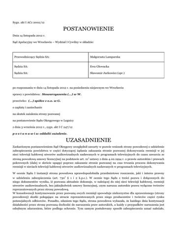 Sygn. akt I ACz 2002/12 POSTANOWIENIE Dnia 14 listopada 2012 r. Sąd Apelacyjny we Wrocławiu – Wydział I Cywilny w składzie: Przewodniczący Sędzia SA: Małgorzata Lamparska Sędzia SA: Ewa Głowacka Sędzia SA: Sławomir Jurkowicz (spr.) po rozpoznaniu w dniu 14 listopada 2012 r. na posiedzeniu niejawnym we Wrocławiu sprawy z powództwa: Stowarzyszenia (...) w W. przeciwko: (...) spółce z o.o. w G. o zapłatę i zaniechanie na skutek zażalenia strony pozwanej na postanowienie Sądu Okręgowego w Legnicy z dnia 3 września 2012 r., sygn. akt I C 247/12 p o s t a n a w i a: oddalić zażalenie. UZASADNIENIE Zaskarżonym postanowieniem Sąd Okręgowy uwzględnił zawarty w pozwie wniosek strony powodowej o udzielenie zabezpieczenia powództwa w części dotyczącej żądania zakazania stronie pozwanej dokonywania reemisji w jej sieci telewizji kablowej utworów audiowizualnych nadawanych w programach telewizyjnych do czasu zawarcia ze stroną powodową umowy licencyjnej na podstawie art. 211 ustawy z dnia 4.02.1994 r. o prawie autorskim i prawach pokrewnych (dalej w skrócie upapp) poprzez zakazanie stronie pozwanej na czas trwania procesu dokonywania reemisji w sieciach telewizji kablowej utworów audiowizualnych nadawanych w programach telewizyjnych. W ocenie Sądu I instancji strona powodowa uprawdopodobniła przedmiotowe roszczenie, jaki i interes prawny w udzieleniu zabezpieczenia (art. 7301 § 1 i 2 k.p.c.). W ocenie tego Sądu z treści pozwu i dołączonych do niego dokumentów wynika, iż pozwana aktualnie dokonuje, w należącej do niej sieci telewizji kablowej, reemisji utworów audiowizualnych, bez jakiejkolwiek umowy licencyjnej, czym narusza autorskie prawa wyłączne twórców reprezentowanych przez stronę powodową. W konsekwencji kontynuowanie przez pozwaną owych reemisji spowoduje niekorzystne dla uprawnionego (strony powodowej) skutki polegające na utracie reprezentowanych przez niego producentów i twórców części rynku potencjalnych odbiorców. Ponadto, zdaniem tego Sądu, strona powodowa wykazała, że każdego dnia kontynuacji działalności przez stronę pozwaną dochodzi do naruszenia praw autorskich, a każdy z przypadków naruszenia jest odrębnym zdarzeniem, które podlega ochronie. Tym samym postulowany sposób zabezpieczenia uznać należało, zdaniem Sądu Okręgowego, za jedyny skuteczny środek zapewniający, że dochodzenie roszczeń niepieniężnych będzie miało dla uprawnionego znaczenie. W zażaleniu na to postanowienie strona pozwana zarzuciła naruszenie: - art. 7301 § 1 k.p.c. poprzez wydanie postanowienia pomimo braku uprawdopodobnienia roszczenia, - art. 80 ustawy o prawie autorskim i prawach pokrewnych przez przyjęcie, że wnioskując o udzielenie zabezpieczenia powód miał tylko uprawdopodobnić, a nie wykazać interes prawny w uzyskaniu zabezpieczenia, - art. 731 k.p.c. poprzez udzielenie zabezpieczenia, które zmierza do zaspokojenia roszczenia, mimo niespełnienia przesłanek określonych w art. 755 § 21 k.p.c., - art. 7301 § 3 k.p.c. poprzez obciążenie pozwaną ponad potrzebę, - art. 43 ustawy o radiofonii i telewizji poprzez zakazanie pozwanej prowadzenia działalności nakazanej mocą tego przepisu oraz - niewykonalność zabezpieczenia ze względu na definicję reemisji zawartą w art. 6 ust. 1 pkt 5 ustawy, W oparciu o powyższe zarzuty pozwana wnosiła o uchylenie zaskarżonego postanowienia i orzeczenie o kosztach postępowania. W odpowiedzi na zażalenie strona powodowa wniosła o jego oddalenie. Sąd Apelacyjny zważył, co następuje: Zażalenie nie zasługiwało na uwzględnienie. W ocenie Sądu Apelacyjnego, wbrew odmiennym i nieuzasadnionym twierdzeniom skarżącej, trafnie uznał Sąd I instancji, iż strona powodowa wykazała łączne zaistnienie przesłanek warunkujących udzielenie zabezpieczenia w postaci uprawdopodobnienia przedmiotowego roszczenia oraz interesu prawnego w udzieleniu zabezpieczenia (art. 7301 § 1 k.p.c.). Wprawdzie rację ma skarżąca, iż przepis art. 80 ust. 1 pkt 1 upapp stanowi w zakresie dotyczącym zabezpieczania roszczeń w sprawach o naruszenie autorskich praw majątkowych regulację szczególną w stosunku do przepisów art. 730 i nast. k.p.c., to jednak z uwagi na jego ogólnikową i budzącą wiele wątpliwości interpretacyjnych treść, odpowiednie zastosowanie w tym zakresie znaleźć muszą powyżej wskazane przepisy o postępowaniu zabezpieczającym. Niewątpliwie bowiem, gdyby przyjąć argumentację skarżącej, iż na gruncie art. 80 ust. 1 pkt 1 upapp uprawniony zobligowany jest nie do uprawdopodobnienia a wykazania (udowodnienia) interesu prawnego, to należałoby przyjąć mając na względzie literalną treść tego unormowania, iż udzielenie zabezpieczenia w sprawach o naruszenie autorskich praw majątkowych uzależnione byłoby od wykazania tylko i wyłącznie interesu prawnego w udzieleniu zabezpieczenia. Zaakceptowanie zaś takiego stanowiska, zdaniem Sądu Apelacyjnego, pozostawałoby w sprzeczności z istotą i celem postępowania zabezpieczającego, wymogami racjonalności, jak również koniecznością zapewnienia zgodności prawa polskiego z prawem wspólnotowym (dyrektywą 2004/48/WE Parlamentu Europejskiego i Rady z dnia 29 kwietnia 2004 r. w sprawie egzekwowania praw własności intelektualnej). Mało tego przyjęcie stanowiska skarżącej, czyniłoby już tylko z tej przyczyny bezzasadnymi sformułowane w zażaleniu zarzuty naruszenia przepisów o postępowaniu zabezpieczającym unormowanych w kodeksie postępowania cywilnego. W rozpoznawanej sprawie, wbrew stanowisku skarżącej, prawidłowo Sąd Okręgowy uznał, iż strona powodowa na gruncie przepisu art. dostatecznie uprawdopodobniła istnienie roszczenia o zakazanie stronie pozwanej reemisji w należącej do niej sieci telewizji kablowej chronionych utworów audiowizualnych nadawanych w programach telewizyjnych do czasu zawarcia z pozwaną umowy licencyjnej, o której mowa w art. 211 upap