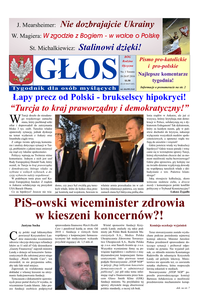 J. Mearsheimer: Nie dozbrajajcie Ukrainy GŁOS W. Magiera: W zgodzie z Bogiem - w walce o Polskê St. Michalkiewicz: Stalinowi dzięki! Tygodnik dla osób myślących BÓG Rodzina Ojczyzna No. 1 Toronto 20-26.07.2016 $1.50 ($1.43+$0.07 GST) Pismo pro-katolickie i pro-polskie Najlepsze komentarze tygodnia! Łapy precz od Polski - brukselscy hipokryci! “Turcja to kraj praworządny i demokratyczny!” W Turcji doszło do nieudanego wojskowego zamachu stanu, który pochłonął setki ofiar i doprowadził do zatrzymania blisko 3 tys. osób. Tureckie władze opanowały sytuację, jednak dyskusja na temat wydarzeń z Ankary oraz Istambułu ciągle trwa. Z całego świata spływają komentarze i analizy dotyczące sytuacji w Turcji, problemów z jakimi musi zmierzyć się rząd czy lokalne społeczności. Politycy wpisują na Twitterze różne komentarze. Jednym z nich jest szef Rady Europejskiej Donald Tusk, który ocenił, że Turcja to kraj praworządny i demokratyczny, którego władze są wybrane w wolnych wyborach, a decyzję wyborców należy respektować. W podobnym tonie pisze szef Komisji Europejskiej Juncker. Z rządem w Ankarze solidaryzuje się prezydent USA Barack Obama. Co za hipokryci! Jeszcze nie wia- tel. 416.993.3143 Informacje o prenumeracie na str. 2 lenia rządów w Ankarze, ale już ci wszyscy, którzy krytykują stan demokracji w Polsce, solidaryzują się z dyktatorem Erdoganem! Tak dyktatorem, który za każdym razem, gdy w państwie dochodzi do kryzysu, nakazuje wyłączenie wszystkich mediów społecznościowych, a oponenci rządu trafiają do aresztów i więzień! Gdzie jesteście wtedy wy brukselscy hipokryci? Gdzie wasze porady i wtrącanie się w wewnętrzne sprawy Turcji, której obywatelom chcecie dać za moment możliwość ruchu bezwizowego? Gdzie głos sprzeciwu, gry kolejny raz na światło dzienne wypływają dowody na współpracę tureckich władz z dżihadystami z tzw. Państwa Islamskiego? Jaką stosujecie kalkulację, skoro wówczas siedzicie cicho, a drzecie mordy i komentujecie polski konflikt polityczny o Trybunał Konstytucyjny? Łukasz Żygadło PiS-owski wiceminister zdrowia w kieszeni koncernów?! C Justyna Socha zy polski rząd lekkomyślnie powierzył Krzysztofowi Łandzie stanowisko wiceministra zdrowia i decyzje dotyczące refundacji leków za 11 mld zł? Gdy dziennikarze „Gazety Finansowej” zapytali ministra Łandę o dotacje od koncernów farmaceutycznych dla założonej przez niego fundacji „Watch Health Care”, ten stwierdził, że nie przypomina sobie, aby taki fakt miał miejsce. Zapewniał, że wielokrotnie musiał dokładać z własnej kieszeni na utrzymanie funkcjonowania fundacji. Tymczasem z dokumentów ujawnionych przez portal Kulisy24 wynika, że wiceminister Łanda kłamie. Jako prezes fundacji osobiście podpisywał domo, czy pucz był zwykłą grą tureckich władz, które do końca chcą przejąć kontrolę nad wojskiem, bowiem to właśnie armia przeszkadza im w całkowitej islamizacji państwa, czy może zamach stanu był faktyczną próbą oba- sprawozdania finansowe Watch Health Care i parafował każdą ze stron. Od 2010 r. fundacja z różnych form współpracy z korporacjami farmaceutycznymi lub medycznymi wykazała przychód sięgający ok. 1,5 mln zł. Wśród sponsorów fundacji Krzysztofa Łandy znalazły się takie podmioty jak Polski Bank Komórek Macierzystych S.A., Medica Polska Ubezpieczenia Zdrowotne Towarzystwo Ubezpieczeń S.A., Roche Polska sp. z o.o. oraz Sanofi-Aventis sp. z o.o. Wszystkie wymienione firmy są powiązane kapitałowo i osobowo z międzynarodowymi korporacjami farmaceutycznymi. Jako pierwsze temat podjęło Stowarzyszenie „STOP NOP” w petycji „Stop lobbystom koncernów farmaceutycznych w administracji publicznej”, już pół roku temu informując rząd o finansowaniu przez koncern Glaxo Smith Kline (GSK) fundacji ministra. Na przykładzie tej sprawy obywatele mogą obserwować polskie standardy, a raczej ich brak. Komisja oczekuje wyjaśnień Teraz stowarzyszenie zostało wysłuchane podczas posiedzenia sejmowej komisji zdrowia. Minister Jarosław Pinkas przedstawił sprawozdanie dotyczące sytuacji i próbował odpowiadać na pytania. Nie wyjaśnił jednak, co skłoniło ministra Konstantego Radziwiłła do odsunięcia Krzysztofa Łandy od polityki lekowej. Ministerstwo nie ujawniło też, co zawierała notatka służbowa, która rozpoczęła lawinę oskarżeń w mediach. Stowarzyszenie „STOP NOP” poprosiło przewodniczącego komisji Bartosza Arłukowicza o możliwość przedstawienia mechanizmów korupdok. na str. 7 POLSKA - ŚWIAT STRONA 2 GŁOS nr 1 11-17.11. 2015 Dr Jarosław Szarek rekomendowany na prezesa IPN ków komunistycznych, a jednocześnie poszukiwanie pieniędzy na planowany pogrzeb Danuty Siedzikówny "Inki" sanitariuszki legendarnej 5. Brygady Wileńskiej AK dowodzonej przez mjr. Zygmunta Szendzielarza "Łupaszkę" stwierdził Szarek. 2000 roku pracował w krakowskim oddziale IPN, gdzie zajmuje się edukacją. Po 13 grudnia 1981 r. zaangażował się w działalność opozycyjną, m.in. kolportował i drukował podziemną prasę. - Instytut Pamięci Narodowej to jest miejsce szczególne. Naszym zadaniem jest przekazać pamięć o polskim dziedzictwie - mówił Szarek podczas dzisiejszego przesłuchania przed kolegium IPN. Podkreślił też, że ludzie, którzy pracują w IPN nie "pracują dla siebie", ale przede wszystkim "dla przyszłych pokoleń". Odnosząc się do poziomu edukacji historycznej w Polsce, Szarek ocenił, że obecnie "znajdujemy się w stanie zapaści kulturowej". - Młodzież nie zna elementarnych rzeczy. Mamy wąską elitę wśród młodego pokolenia i tam jest nadzieja. Tam są jednostki wybitne, ale 90. proc. nie zna elementarnych rzeczy. Do takich rzeczy doprowadziła polska szkoła - mówił kandydat na prezesa IPN. - Mam wizję, jak to zrobić, żeby wykorzystać potencjał edukacyjny każdego pionu, by przekazać historię mł