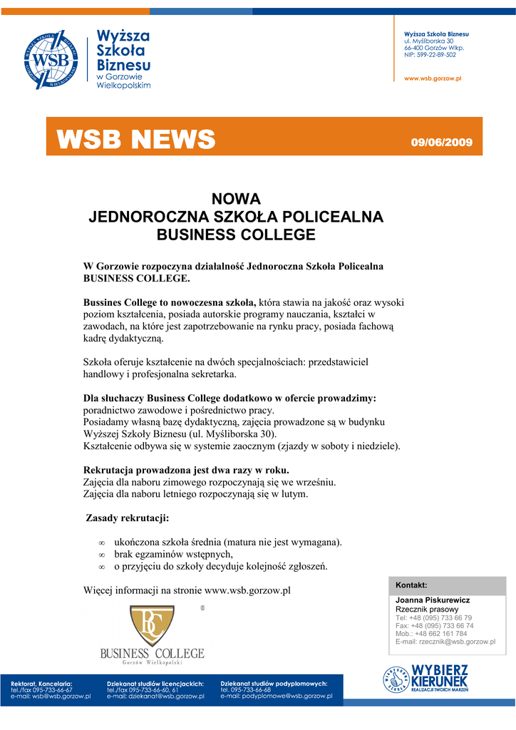 WSB NEWS 09/06 09/06/2009 /06/2009 NOWA JEDNOROCZNA SZKOŁA POLICEALNA BUSINESS COLLEGE W GORZOWIE WLKP. W Gorzowie rozpoczyna działalność Jednoroczna Szkoła Policealna BUSINESS COLLEGE. Bussines College to nowoczesna szkoła, która stawia na jakość oraz wysoki poziom kształcenia, posiada autorskie programy nauczania, kształci w zawodach, na które jest zapotrzebowanie na rynku pracy, posiada fachową kadrę dydaktyczną. Szkoła oferuje kształcenie na dwóch specjalnościach: przedstawiciel handlowy i profesjonalna sekretarka. Dla słuchaczy Business College dodatkowo w ofercie prowadzimy: poradnictwo zawodowe i pośrednictwo pracy. Posiadamy własną bazę dydaktyczną, zajęcia prowadzone są w budynku WyŜszej Szkoły Biznesu (ul. Myśliborska 30). Kształcenie odbywa się w systemie zaocznym (zjazdy w soboty i niedziele). Rekrutacja prowadzona jest dwa razy w roku. Zajęcia dla naboru zimowego rozpoczynają się we wrześniu. Zajęcia dla naboru letniego rozpoczynają się w lutym. Zasady rekrutacji: • • • ukończona szkoła średnia (matura nie jest wymagana). brak egzaminów wstępnych, o przyjęciu do szkoły decyduje kolejność zgłoszeń. Więcej informacji na stronie www.wsb.gorzow.pl Kontakt: Joanna Piskurewicz Rzecznik prasowy Tel: +48 (095) 733 66 79 Fax: +48 (095) 733 66 74 Mob.: +48 662 161 784 E-mail: [email protected]