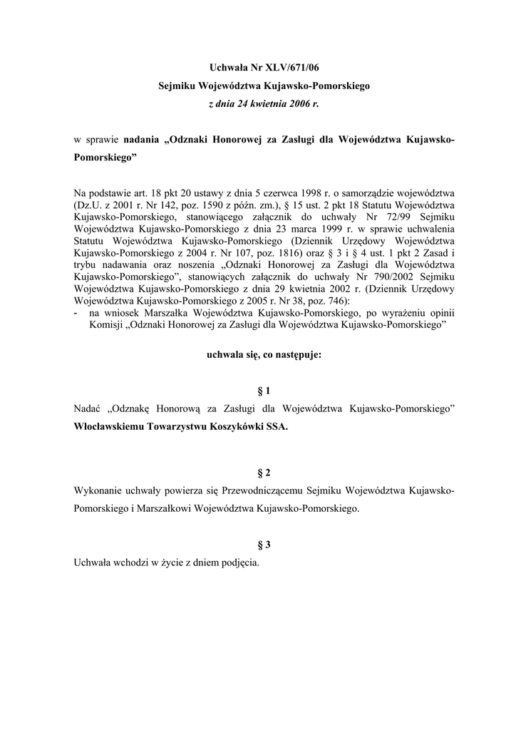 Uchwała Nr XLV/671/06 Sejmiku Województwa Kujawsko