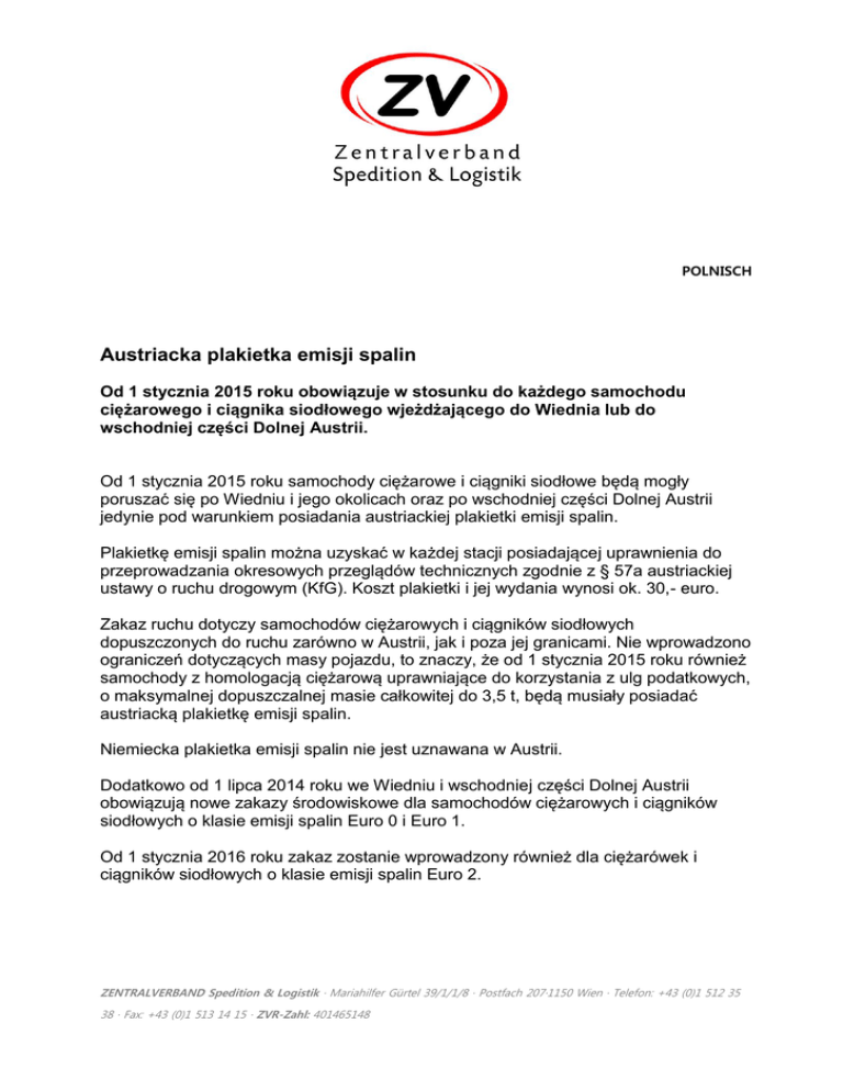 POLNISCH Austriacka plakietka emisji spalin Od 1 stycznia 2015 roku obowiązuje w stosunku do każdego samochodu ciężarowego i ciągnika siodłowego wjeżdżającego do Wiednia lub do wschodniej części Dolnej Austrii. Od 1 stycznia 2015 roku samochody ciężarowe i ciągniki siodłowe będą mogły poruszać się po Wiedniu i jego okolicach oraz po wschodniej części Dolnej Austrii jedynie pod warunkiem posiadania austriackiej plakietki emisji spalin. Plakietkę emisji spalin można uzyskać w każdej stacji posiadającej uprawnienia do przeprowadzania okresowych przeglądów technicznych zgodnie z § 57a austriackiej ustawy o ruchu drogowym (KfG). Koszt plakietki i jej wydania wynosi ok. 30,- euro. Zakaz ruchu dotyczy samochodów ciężarowych i ciągników siodłowych dopuszczonych do ruchu zarówno w Austrii, jak i poza jej granicami. Nie wprowadzono ograniczeń dotyczących masy pojazdu, to znaczy, że od 1 stycznia 2015 roku również samochody z homologacją ciężarową uprawniające do korzystania z ulg podatkowych, o maksymalnej dopuszczalnej masie całkowitej do 3,5 t, będą musiały posiadać austriacką plakietkę emisji spalin. Niemiecka plakietka emisji spalin nie jest uznawana w Austrii. Dodatkowo od 1 lipca 2014 roku we Wiedniu i wschodniej części Dolnej Austrii obowiązują nowe zakazy środowiskowe dla samochodów ciężarowych i ciągników siodłowych o klasie emisji spalin Euro 0 i Euro 1. Od 1 stycznia 2016 roku zakaz zostanie wprowadzony również dla ciężarówek i ciągników siodłowych o klasie emisji spalin Euro 2. ZENTRALVERBAND Spedition & Logistik · Mariahilfer Gürtel 39/1/1/8 · Postfach 207·1150 Wien · Telefon: +43 (0)1 512 35 38 · Fax: +43 (0)1 513 14 15 · ZVR-Zahl: 401465148
