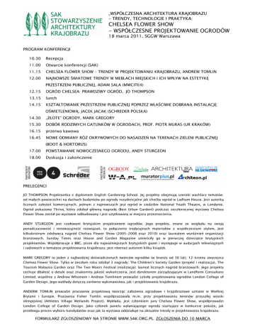 „WSPÓŁCZESNA ARCHITEKTURA KRAJOBRAZU – TRENDY, TECHNOLOGIE I PRAKTYKA: CHELSEA FLOWER SHOW - WSPÓŁCZESNE PROJEKTOWANIE OGRODÓW 18 marca 2011, SGGW Warszawa PROGRAM KONFERENCJI 10.30 Recepcja 11.00 Otwarcie konferencji (SAK) 11.15 CHELSEA FLOWER SHOW – TRENDY W PROJEKTOWANIU KRAJOBRAZU, ANDREW TOMLIN 12.00 NAJNOWSZE ŚWIATOWE TRENDY W MEBLACH MIEJSKICH I ICH WPŁYW NA ESTETYKĘ PRZESTRZENI PUBLICZNEJ, ADAM SALA (MMCITE4) 12.15 OGRÓD CHELSEA: PRAWDZIWY OGRÓD, JO THOMPSON 13.15 lunch 14.15 KSZTAŁTOWANIE PRZESTRZENI PUBLICZNEJ POPRZEZ WŁAŚCIWIE DOBRANĄ INSTALACJĘ OŚWIETLENIOWĄ, JACEK JACAK (SCHREDER POLSKA) 14.30 „ZŁOTE” OGRODY, MARK GREGORY 15.30 DOBÓR RODZIMYCH GATUNKÓW W OGRODACH, PROF. PIOTR MURAS (UR KRAKÓW) 16.15 przerwa kawowa 16.45 NOWE ODMIANY RÓś OKRYWOWYCH DO NASADZEŃ NA TERENACH ZIELENI PUBLICZNEJ (BOOT & HORTORUS) 17.00 POWSTAWANIE NOWOCZESNEGO OGRODU, ANDY STURGEON 18.00 Dyskusja i zakończenie PRELEGENCI JO THOMPSON Projektantka z dyplomem English Gardening School. Jej projekty obejmują szeroki wachlarz tematów: od małych powierzchni na dachach budynków po ogrody rezydencjalne jak choćby ogród w Ladham House. Jest autorką licznych załoŜeń komercyjnych; jednym z najnowszych jest ogród w siedzibie National Youth Theatre, w Londynie. Ogród pokazowy Thrive, który zdobył główną nagrodę (Best Urban Gardenl) podczas zeszłorocznej wystawy Chelsea Flower Show został po wystawie odbudowany i jest uŜytkowany w miejscu przeznaczenia. ANDY STURGEON jest czołowym brytyjskim projektantem ogrodów. Jego projekty, znane ze względu na swoją ponadczasowość i innowacyjność rozwiązań, to połączenie tradycyjnych materiałów z współczesnym stylem. Jest kilkukrotnym zdobywcą nagród Chelsea Flower Show (2005-2008 oraz 2010) oraz laureatem wyróŜnień organizacji branŜowych. Sunday Times oraz House and Garden Magazine umieściły go w pierwszej dziesiątce brytyjskich projektantów. Współpracuje z BBC, pisze dla najwaŜniejszych brytyjskich gazet i występuje w audycjach telewizyjnych i radiowych o tematyce projektowania krajobrazu; jest równieŜ autorem kilku ksiąŜek. MARK GREGORY to jeden z najbardziej doświadczonych twórców ogrodów (w branŜy od 30 lat); 12-krotny zwycięzca Chelsea Flower Show. Tylko w zeszłym roku zdobył 3 nagrody: The Children's Society Garden (projekt i realizacja), The Tourism Malaysia Garden oraz The Two Moors Festival (realizacja); laureat licznych nagród branŜowych. Jego projekty cechuje dbałość o detale oraz znakomita jakość wykończenia. Jest dyrektorem zarządzającym w Landform Consultans Limited; wspólnie z Andrew Wilsonem i Andrew Tomlinem prowadzi szkołę projektowania ogrodów London College of Garden Design. Jego wykłady dotyczą zarówno wykonawstwa, jak i projektowania krajobrazu. ANDERW TOMLIN prowadzi pracownię projektową tworząc załoŜenia ogrodowe i krajobrazowe uznane w Wielkiej Brytanii i Europie. Pracownia Fisher Tomlin współpracowała m.in. przy projektowaniu terenów przyszłej wioski olimpijskiej (Athletes Village Wetlands Project). Wykłada, jest członkiem jury Chelsea Flower Show, współprowadzi London College of Garden Design. Jako członek panelu wyłaniającego ogrody startujące w konkursie pokaŜe, jak przebiega proces wyboru kandydatów oraz jak ta wystawa oddziałuje na aktualne trendy w projektowaniu krajobrazu. FORMULARZ ZGŁOSZENIOWY NA STRONIE WWW.SAK.ORG.PL. ZGŁOSZENIA DO 10 MARCA
