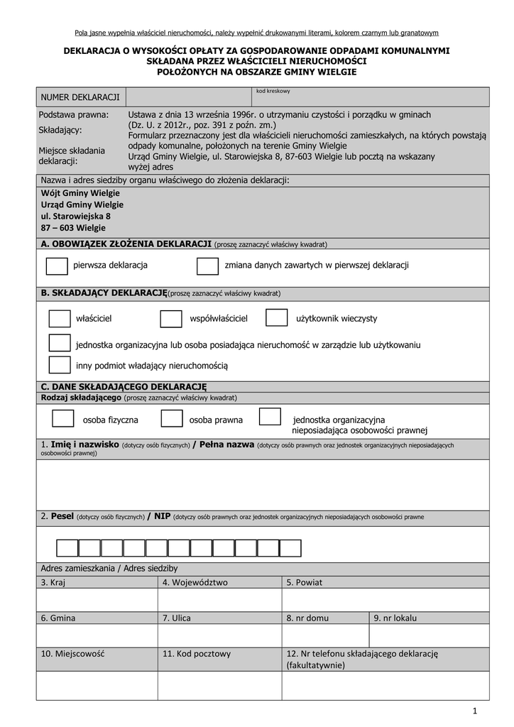 Pola jasne wypełnia właściciel nieruchomości, należy wypełnić drukowanymi literami, kolorem czarnym lub granatowym DEKLARACJA O WYSOKOŚCI OPŁATY ZA GOSPODAROWANIE ODPADAMI KOMUNALNYMI SKŁADANA PRZEZ WŁAŚCICIELI NIERUCHOMOŚCI POŁOŻONYCH NA OBSZARZE GMINY WIELGIE kod kreskowy NUMER DEKLARACJI Podstawa prawna: Ustawa z dnia 13 września 1996r. o utrzymaniu czystości i porządku w gminach (Dz. U. z 2012r., poz. 391 z poźn. zm.) Formularz przeznaczony jest dla właścicieli nieruchomości zamieszkałych, na których powstają odpady komunalne, położonych na terenie Gminy Wielgie Urząd Gminy Wielgie, ul. Starowiejska 8, 87-603 Wielgie lub pocztą na wskazany wyżej adres Składający: Miejsce składania deklaracji: Nazwa i adres siedziby organu właściwego do złożenia deklaracji: Wójt Gminy Wielgie Urząd Gminy Wielgie ul. Starowiejska 8 87 – 603 Wielgie A. OBOWIĄZEK ZŁOŻENIA DEKLARACJI pierwsza deklaracja (proszę zaznaczyć właściwy kwadrat) zmiana danych zawartych w pierwszej deklaracji B. SKŁADAJĄCY DEKLARACJĘ(proszę zaznaczyć właściwy kwadrat) właściciel współwłaściciel użytkownik wieczysty jednostka organizacyjna lub osoba posiadająca nieruchomość w zarządzie lub użytkowaniu inny podmiot władający nieruchomością C. DANE SKŁADAJĄCEGO DEKLARACJĘ Rodzaj składającego (proszę zaznaczyć właściwy kwadrat) osoba fizyczna 1. Imię i nazwisko osoba prawna (dotyczy osób fizycznych) / Pełna nazwa jednostka organizacyjna nieposiadająca osobowości prawnej (dotyczy osób prawnych oraz jednostek organizacyjnych nieposiadających osobowości prawnej) 2. Pesel (dotyczy osób fizycznych) / NIP (dotyczy osób prawnych oraz jednostek organizacyjnych nieposiadających osobowości prawne Adres zamieszkania / Adres siedziby 3. Kraj 4. Województwo 5. Powiat 6. Gmina 7. Ulica 8. nr domu 10. Miejscowość 11. Kod pocztowy 12. Nr telefonu składającego deklarację (fakultatywnie) 9. nr lokalu 1 D. ADRES NIERUCHOMOŚCI NA KTOREJ POWSTAJĄ ODPADY KOMUNALNE 13. Gmina 14. Ulica 15. nr domu 16. nr lokalu 17. nr działki (w przypadku nie nadania nr domu) 18. Miejscowość 19. Kod pocztowy 20. Nr telefonu składającego deklarację (fakultatywnie) E. Oświadczam, że na terenie nieruchomości wskazanej w części D niniejszej deklaracji odpady będą gromadzone i odbierane w sposób selektywny *) TAK NIE Dotyczy właścicieli nieruchomości na której zamieszkują mieszkańcy 21. Oświadczam, że na terenie nieruchomości wskazanej w części D niniejszej deklaracji zamieszkuje: (należy podać liczbę mieszkańców) OBLICZENIE WYSOKOŚCI OPŁATY ZA GOSPODAROWANIE ODPADAMI KOMUNALNYMI F. Dotyczy właścicieli nieruchomości na której zamieszkują mieszkańcy 22. Liczba mieszkańców (proszę wpisać liczbę z pozycji 21) 23. Wysokość miesięcznej opłaty ** (patrz objaśnienia) zł G. OŚWIADCZENIE I PODPIS SKŁADAJĄCEGO DEKLARACJĘ Oświadczam, że: (dotyczy osób, które zaznaczyły TAK w dziale E) 1. odpady ulegające biodegradacji będę wywoził do Punktu selektywnej zbiórki odpadów komunalnych. 2. odpady ulegające biodegradacji będę kompostował we własnym zakresie w przydomowym kompostowniku. 3. odpady ulegające biodegradacji będę gromadził selektywnie w odpowiednim pojemniku lub worku. Oświadczam, że złożone dane są zgodne ze stanem faktycznym na dzień złożenia deklaracji. Zgodnie z art. 23 ust. 1 Ustawy o ochronie danych osobowych z dnia 29 sierpnia 1997r. (tekst jednolity - Dz. U. z 2002r. Nr 101, poz. 926, z późn. zm.) wyrażam zgodę na przetwarzanie przez Urząd Gminy Wielgie danych dotyczących mojej osoby w celu przeprowadzenia postępowania administracyjnego /dotyczy osób fizycznych/. ……………………………………………………........ (miejscowość i data) ….................……………………………………………… (czytelny podpis) H. ADNOTACJE URZĘDOWE Pouczenie: 1. W przypadku nie płacenia w określonych terminach należnej opłaty, niniejsza deklaracja stanowi podstawę prawną do wystawienia tytułu wykonawczego, zgodnie z art. 3a ustawy z dnia 17 czerwca 1996r. o postępowaniu egzekucyjnym w administracji (Dz. U. z 2005r. Nr 229, poz. 1954 z poźn. zm.). 2 2. Właściciel nieruchomości jest obowiązany złożyć deklarację do Wójta Gminy Wielgie o wysokości opłaty za gospodarowanie odpadami komunalnymi w terminie do 25 kwietnia 2013 r. lub w terminie 14 dni od zamieszkania na danej nieruchomości pierwszego mieszkańca, powstania na danej nieruchomości odpadów komunalnych lub zmiany przez gminę wysokości opłaty za gospodarowanie odpadami komunalnymi. 3. W przypadku zmiany danych będących podstawą ustalenia wysokości należnej opłaty za gospodarowanie odpadami komunalnymi, właściciel nieruchomości obowiązany jest złożyć nową deklarację do Wójta Gminy Wielgie w terminie 14 dni od dnia nastąpienia zmiany. Opłatę za gospodarowanie odpadami komunalnymi w zmienionej wysokości uiszcza się za miesiąc, w którym nastąpiła zmiana. 4. W przypadku niezłożenia deklaracji w terminie określonym w pkt. 2 albo uzasadnionych wątpliwości co do danych zawartych w deklaracji, Wójt Gminy określi w drodze decyzji, wysokość opłaty za gospodarowanie odpadami, biorąc pod uwagę uzasadnione szacunki, w tym średnią ilość odpadów komunalnych powstających na nieruchomościach o podobnym charakterze. 5. Opłatę za gospodarowanie odpadami komunalnymi uiszczać należy do 20 dnia po upływie każdego miesiąca, którego dotyczy opłata (zgodnie z Uchwałą Rady Gminy Wielgie w sprawie terminu, częstotliwości i trybu uiszczania opłaty za gospodarowanie odpadami komunalnymi) w kasie urzędu lub na rachunek bankowy Gminy Wielgie ul.Starowiejska 8, 87 – 603 Wielgie nr 97 9550 0003 2005 0030 0054 0014. 6. Niniejszą deklarację należy złożyć w siedzibie Urzędu Gminy Wielgie, ul. Starowiejska 8, 87-603 Wielgie, bądź przesłać drogą pocztową na ws