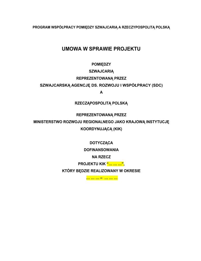 PROGRAM WSPÓŁPRACY POMIĘDZY SZWAJCARIĄ A RZECZYPOSPOLITĄ POLSKĄ UMOWA W SPRAWIE PROJEKTU POMIĘDZY SZWAJCARIĄ REPREZENTOWANĄ PRZEZ SZWAJCARSKĄ AGENCJĘ DS. ROZWOJU I WSPÓŁPRACY (SDC) A RZECZĄPOSPOLITĄ POLSKĄ REPREZENTOWANĄ PRZEZ MINISTERSTWO ROZWOJU REGIONALNEGO JAKO KRAJOWĄ INSTYTUCJĘ KOORDYNUJĄCĄ (KIK) DOTYCZĄCA DOFINANSOWANIA NA RZECZ PROJEKTU KIK “… … …”, KTÓRY BĘDZIE REALIZOWANY W OKRESIE ………– ……… Szwajcarski Program Pomocowy– Program Współpracy pomiędzy Szwajcarią a Rzeczypospolitą Polską Rząd Szwajcarii i Rząd Rzeczypospolitej Polskiej Mając na uwadze przyjazne relacje pomiędzy obu państwami, Pragnąc wzmocnić te relacje oraz owocną współpracę pomiędzy obu państwami, Chcąc promować dalszy społeczny i gospodarczy rozwój Rzeczypospolitej Polskiej, Nawiązując do Umowy Ramowej pomiędzy Rządem Rzeczypospolitej Polskiej a Szwajcarską Radą Federalną o wdraŜaniu Szwajcarsko-Polskiego Programu Współpracy w celu zmniejszenia róŜnic społeczno-gospodarczych w obrębie rozszerzonej Unii Europejskiej z dnia 20 grudnia 2007 r., Biorąc pod uwagę szwajcarskie dofinansowanie na rzecz Projektu KIK “… … …”, w Rzeczypospolitej Polskiej, uzgodniły co następuje: Artykuł 1 Definicje Jeśli z kontekstu nie wynika inaczej, w niniejszej Umowie w sprawie Projektu poniŜsze terminy rozumie się w sposób następujący: “Umowa Ramowa” oznacza Umowę pomiędzy Szwajcarską Radą Federalną a Rządem Rzeczypospolitej Polskiej o wdraŜaniu Szwajcarsko-Polskiego Programu Współpracy w celu zmniejszenia róŜnic społeczno-gospodarczych w obrębie rozszerzonej Unii Europejskiej, zawartej dnia 20 grudnia 2007 roku; “Pomoc finansowa” oznacza bezzwrotną pomoc finansową przyznaną przez Szwajcarię w ramach Umowy Ramowej; “Umowa w sprawie Projektu” oznacza Umowę pomiędzy Szwajcarską Agencją ds. Rozwoju i Współpracy (SDC) a Ministerstwem Rozwoju Regionalnego, działającym jako Krajowa Instytucja Koordynująca (KIK), która ustanawia prawa i obowiązki Stron odnośnie realizacji Projektu; "Krajowa Instytucja Koordynująca" (KIK) oznacza instytucję odpowiedzialną za koordynację Szwajcarsko-Polskiego Programu Współpracy ze strony polskiej; zgodnie z artykułem 9 Umowy Ramowej Rzeczpospolita Polska upowaŜnia Ministra Rozwoju Regionalnego do działania w jej imieniu jako KIK odnośnie Szwajcarsko-Polskiego Programu Współpracy; “Projekt” oznacza wszelkie czynności podejmowane w ramach niniejszej Umowy w sprawie Projektu; “Dofinansowanie” oznacza bezzwrotną pomoc finansowy przyznaną przez Szwajcarię w ramach niniejszej Umowy w sprawie Projektu; “Strony” Umowy w sprawie Projektu oznaczają Rząd Rzeczypospolitej Polskiej reprezentowany przez KIK, z jednej strony, oraz Rząd Szwajcarii, reprezentowany przez SDC, z drugiej strony; 2 z 14 Szwajcarski Program Pomocowy– Program Współpracy pomiędzy Szwajcarią a Rzeczypospolitą Polską “Instytucja Płatnicza” oznacza instytucję utworzoną w Ministerstwie Finansów zapewniającą właściwą kontrolę finansową w ramach Szwajcarsko-Polskiego Programu Współpracy; “Instytucja Pośrednicząca” to “…”, wykonująca zadania powierzone jej przez KIK wobec Instytucji Realizującej, wdraŜającej ten Projekt; “Instytucja Realizująca” to “…” upowaŜniona przez Instytucję Pośredniczącą do wdraŜania Projektu finansowanego w ramach niniejszej Umowy w sprawie Projektu. Artykuł 2 Cele i Zakres Projektu 2.1. Celem Projektu “… … …” jest … … …. 2.2. Instytucją Realizującą jest “…”. 2.3. Projekt jest realizowany zgodnie z następującymi dokumentami, stanowiącymi listę załączników: a) Decyzja SDC w sprawie zatwierdzenia Projektu (załącznik nr 1) wraz z potencjalnymi zmianami uzgodnionymi przez Strony, b) Wniosek aplikacyjny dla Kompletnej Propozycji Projektu (załącznik nr 2), c) Aktualny BudŜet (załącznik nr 3), d) Aktualna Tabela wskaźników (załącznik nr 4). Załączniki stanowią integralną część Umowy w sprawie Projektu. 2.4. Umowa w sprawie Projektu będzie realizowana zgodnie z następującymi dokumentami: a) Umową Ramową i odpowiednimi wytycznymi przyjętymi na jej podstawie. 2.5. Umowa w sprawie Projektu będzie realizowana na podstawie wszystkich Aneksów do Kompletnej Propozycji Projektu. Artykuł 3 Kwota i UŜytkowanie 3.1. Szacowany całkowity koszt Projektu wynosi … CHF [… franków szwajcarskich]. Szacowane koszty kwalifikowalne w ramach Projektu wynoszą … CHF (… franków szwajcarskich) (patrz załącznik nr 1). 3.2. Szwajcaria przekaŜe Rzeczypospolitej Polskiej dofinansowanie we frankach szwajcarskich w kwocie nie wyŜszej niŜ … CHF (… franków szwajcarskich) na realizację Projektu, o którym mowa w Artykule 2. 3 z 14 Szwajcarski Program Pomocowy– Program Współpracy pomiędzy Szwajcarią a Rzeczypospolitą Polską 3.3. Dofinansowanie pokryje maksymalnie 85% całkowitych kosztów kwalifikowalnych Projektu we frankach szwajcarskich. Procent ten nie moŜe zostać przekroczony w Ŝadnym momencie realizacji Projektu. KIK zapewni terminowe współ-finansowanie ze źródeł krajowych w minimalnej wysokości 15 % całkowitych kosztów kwalifikowalnych Projektu we frankach szwajcarskich. 3.4. Zgodnie z postanowieniami Art. 7.1 Umowy Ramowej podatek od Towarów i Usług (VAT) zostanie uznany za koszt kwalifikowalny jedynie wtedy, gdy zostanie on rzeczywiście i ostatecznie poniesiony przez Instytucję Realizującą. Podatek VAT, który moŜna w jakikolwiek sposób odzyskać nie będzie uwaŜany za koszt kwalifikowany nawet, jeśli Instytucja Realizująca lub ostateczny odbiorca nie odzyskają go. 3.5. Zgodnie z postanowieniami Art. 7.2 Umowy Ramowej inne podatki lub opłaty, w szczególności podatki bezpośrednie i składki na ubezpieczenie społeczne od pensji i płac będą stanowiły koszty kwalifikowalne jedynie wtedy, gdy zostaną rzeczywiście i 