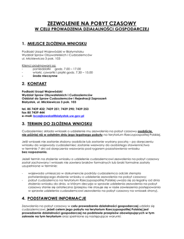 ZEZWOLENIE NA POBYT CZASOWY W CELU PROWADZENIA DZIAŁALNOŚCI GOSPODARCZEJ 1. MIEJSCE ZŁOŻENIA WNIOSKU Podlaski Urząd Wojewódzki w Białymstoku Wydział Spraw Obywatelskich i Cudzoziemców ul. Mickiewicza 3 pok. 103 Klienci przyjmowani są: poniedziałki godz. 7.00 – 17.00 wtorki, czwartki i piątki godz. 7.30 – 15.00 środa nieczynne 2. KONTAKT Podlaski Urząd Wojewódzki Wydział Spraw Obywatelskich i Cudzoziemców Oddział do Spraw Cudzoziemców i Rejestracji Zaproszeń Białystok, ul. Mickiewicza 3 pok. 103 tel. 85 7439 432; 7439 251; 7439 290; 7439 253 fax 85 7439 444 e-mail: [email protected] 3. TERMIN DO ZŁOŻENIA WNIOSKU Cudzoziemiec składa wniosek o udzielenie mu zezwolenia na pobyt czasowy osobiście, nie później niż w ostatnim dniu jego legalnego pobytu na terytorium Rzeczypospolitej Polskiej. Jeśli wniosek nie zostanie złożony osobiście lub zostanie wysłany pocztą – po doręczeniu wniosku do wojewody cudzoziemiec zostanie wezwany do osobistego stawiennictwa w terminie 7 dni od doręczenia wezwania pod rygorem pozostawienia wniosku bez rozpoznania. Jeżeli termin na złożenie wniosku o udzielenie cudzoziemcowi zezwolenia na pobyt czasowy został zachowany i wniosek nie zawiera braków formalnych lub braki formalne zostały uzupełnione w terminie: - wojewoda umieszcza w dokumencie podróży cudzoziemca odcisk stempla potwierdzającego złożenie wniosku o udzielenie zezwolenia na pobyt czasowy; pobyt cudzoziemca na terytorium Rzeczypospolitej Polskiej uważa się za legalny od dnia złożenia wniosku do dnia, w którym decyzja w sprawie udzielenia zezwolenia na pobyt czasowy stanie się ostateczna (przepisu nie stosuje się w razie zawieszenia postępowania w sprawie udzielenia cudzoziemcowi zezwolenia na pobyt czasowy na wniosek strony). 4. PODSTAWOWE INFORMACJE Zezwolenia na pobyt czasowy w celu prowadzenia działalności gospodarczej udziela się cudzoziemcowi, jeżeli celem jego pobytu na terytorium Rzeczypospolitej Polskiej jest prowadzenie działalności gospodarczej na podstawie przepisów obowiązujących w tym zakresie na tym terytorium oraz spełnione są następujące warunki: 2 1) cudzoziemiec posiada: a) ubezpieczenie zdrowotne w rozumieniu ustawy z dnia 27 sierpnia 2004 r. o świadczeniach opieki zdrowotnej finansowanych ze środków publicznych lub potwierdzenie pokrycia przez ubezpieczyciela kosztów leczenia na terytorium Rzeczypospolitej Polskiej, b) źródło stabilnego i regularnego dochodu wystarczającego na pokrycie kosztów utrzymania siebie i członków rodziny pozostających na jego utrzymaniu, c) zgodę właściwego organu na zajmowanie określonego stanowiska lub wykonywanie zawodu, gdy obowiązek jej uzyskania wynika z przepisów odrębnych; 2) cudzoziemiec ma zapewnione na terytorium Rzeczypospolitej Polskiej miejsce zamieszkania; 3) podmiot, który prowadzi działalność gospodarczą: a) w roku podatkowym poprzedzającym złożenie wniosku o udzielenie cudzoziemcowi zezwolenia na pobyt czasowy w celu prowadzenia działalności gospodarczej przez cudzoziemca osiągnął dochód nie niższy niż 12-krotność przeciętnego miesięcznego wynagrodzenia w województwie, w którym podmiot ten ma siedzibę lub miejsce zamieszkania, w trzecim kwartale roku poprzedzającego złożenie wniosku, ogłaszanego przez Prezesa Głównego Urzędu Statystycznego na podstawie art. 30 ust. 2 ustawy z dnia 26 października 1995 r. o niektórych formach popierania budownictwa mieszkaniowego (Dz. U. z 2013 r. poz. 255) lub zatrudnia na czas nieokreślony i w pełnym wymiarze czasu pracy co najmniej przez okres 1 roku poprzedzającego złożenie wniosku co najmniej 2 pracowników będących obywatelami polskimi lub cudzoziemcami, o których mowa w art. 87 ust. 1 pkt 1-9 ustawy z dnia 20 kwietnia 2004 r. o promocji zatrudnienia i instytucjach rynku pracy, lub b) wykaże, że posiada środki pozwalające na spełnienie w przyszłości warunków określonych w lit. a lub prowadzi działania pozwalające na spełnienie w przyszłości tych warunków, w szczególności przyczyniające się do wzrostu inwestycji, transferu technologii, wprowadzania korzystnych innowacji lub tworzenia miejsc pracy. a okoliczność, która jest podstawą ubiegania się o to zezwolenie, uzasadnia jego pobyt na terytorium Rzeczypospolitej Polskiej przez okres dłuższy niż 3 miesiące. Przepis pkt 3 stosuje się do utworzonej przez cudzoziemca spółki komandytowej, komandytowo-akcyjnej, spółki z ograniczoną odpowiedzialnością lub spółki akcyjnej albo do spółki, do której cudzoziemiec przystąpił lub której udziały lub akcje objął lub nabył. Zezwolenia na pobyt czasowy w celu prowadzenia działalności gospodarczej udziela się cudzoziemcowi, którego celem pobytu jest wykonywanie pracy poprzez pełnienie funkcji w zarządzie spółki z ograniczoną odpowiedzialnością lub spółki akcyjnej, którą utworzył lub której udziały lub akcje objął lub nabył, o ile cudzoziemiec spełnia warunki, o których mowa w pkt 1 i 2, a spółka spełnia warunki, o których mowa w pkt 3. Zezwolenia na pobyt czasowy udziela się na okres nie dłuższy niż 3 lata. Zezwolenia na pobyt czasowy udziela lub odmawia udzielenia wojewoda właściwy ze względu na miejsce pobytu cudzoziemca, w drodze decyzji. Składając wniosek o udzielenie zezwolenia na pobyt czasowy, cudzoziemiec uzasadnia ten wniosek, składa pod rygorem odpowiedzialności karnej za składanie fałszywych zeznań pisemne oświadczenie, że dane zawarte we wniosku są prawdziwe. Od cudzoziemca ubiegającego się o udzielenie zezwolenia na pobyt czasowy pobiera się odciski linii papilarnych. 3 W przypadku, gdy pobranie odcisków linii papilarnych od cudzoziemca jest fizycznie niemożliwe, odcisków tych nie pobiera się. 5. WYMAGANE DOKUMENTY wypełniony zgodnie z pouczeniem formularz wniosku, 4 fotografie osoby, której wniosek dotyczy - spełniające następujące wymagania - nieuszkodzone, kolorowe, o d